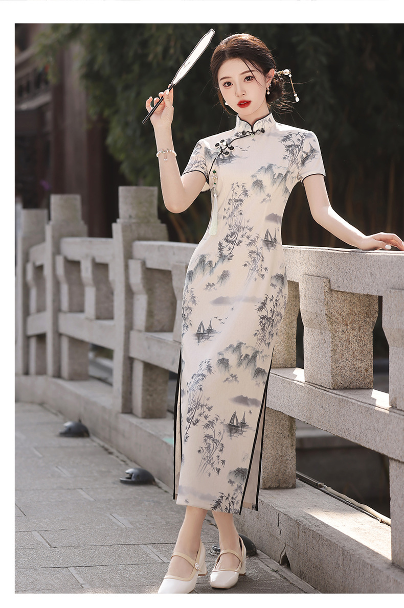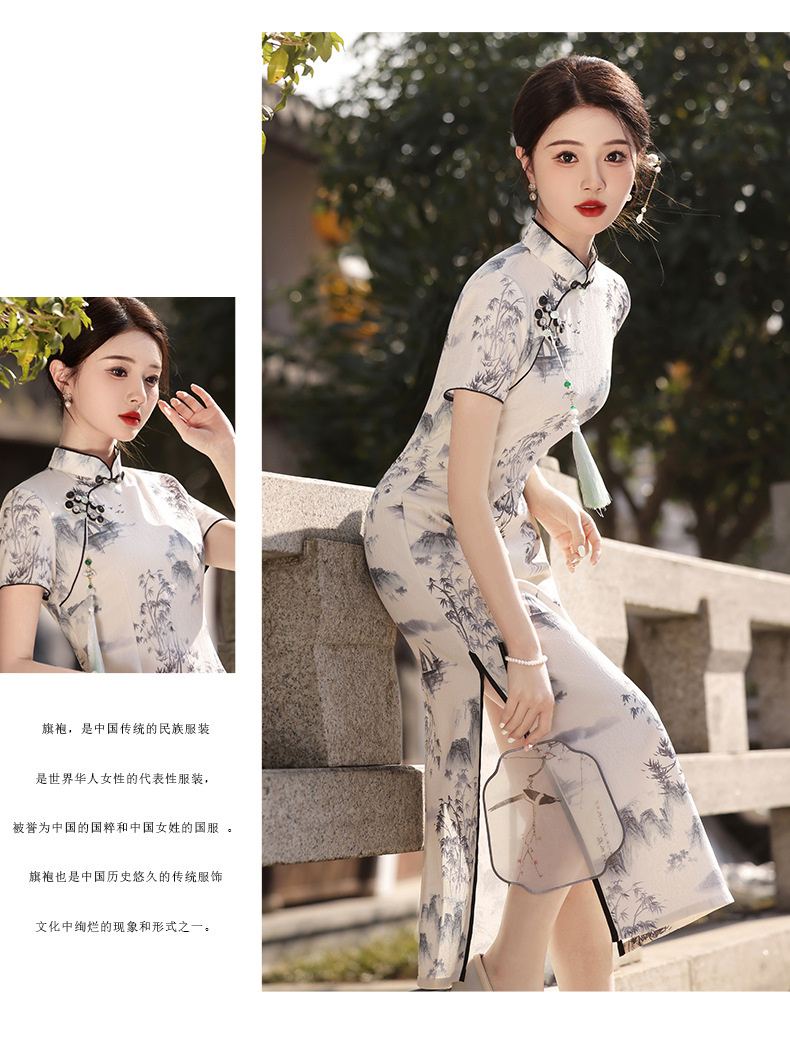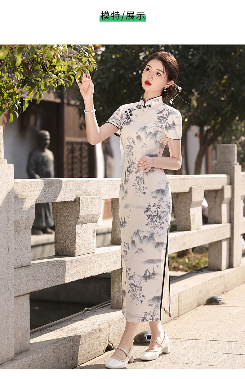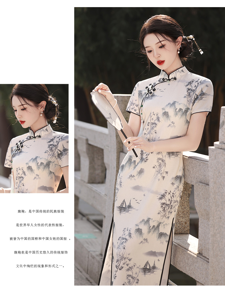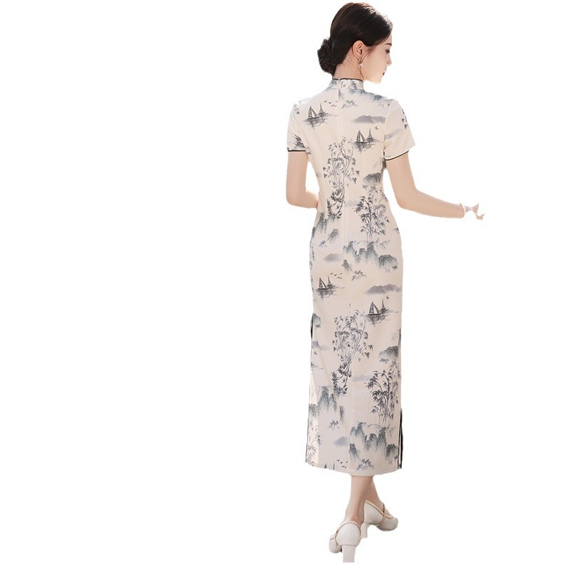 仟金公主春季新款高级感水墨风短袖修身立领气质长款旗袍