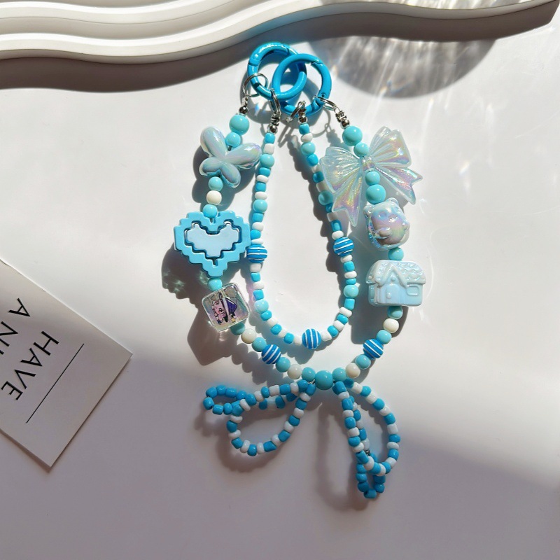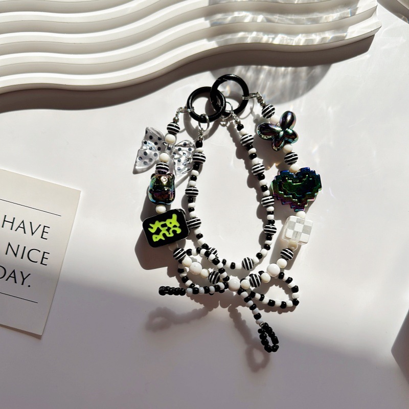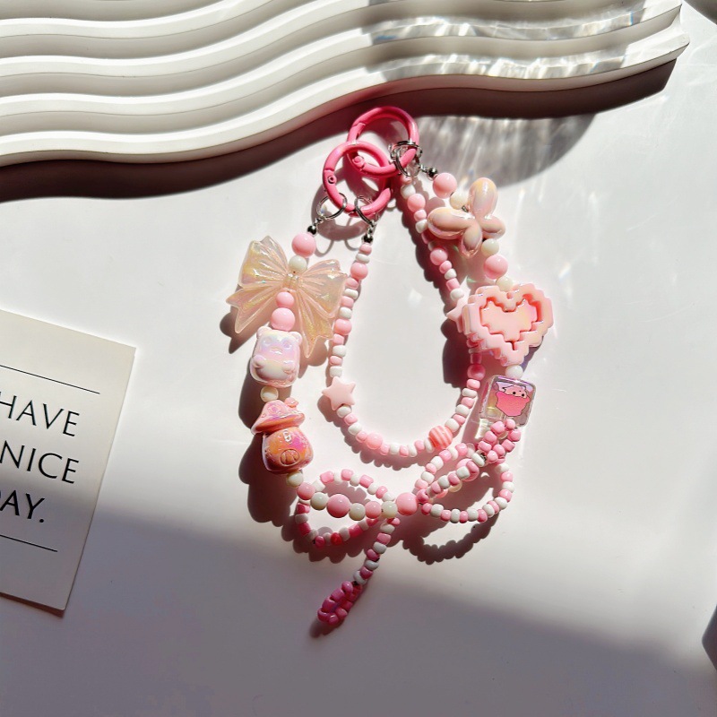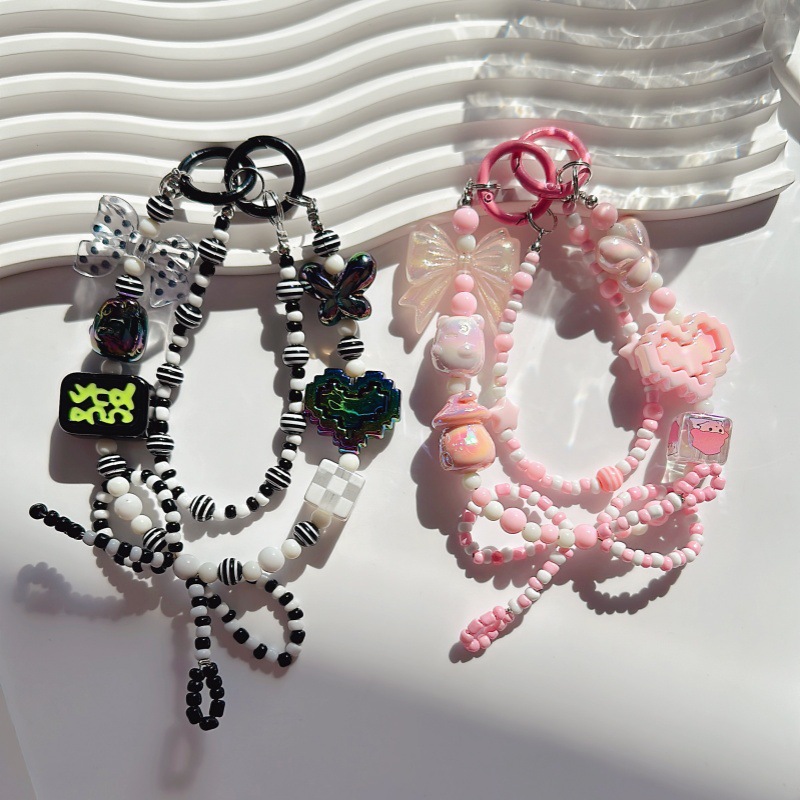 手机挂绳毛绒爱心双链蝴蝶结手链ins时尚复古女款手工串珠手腕挂