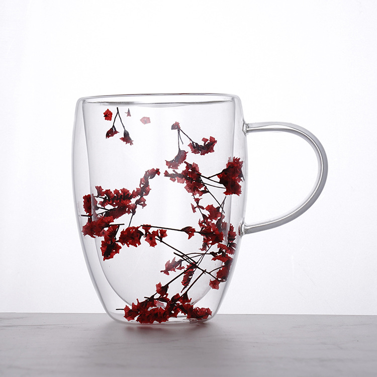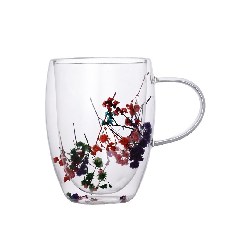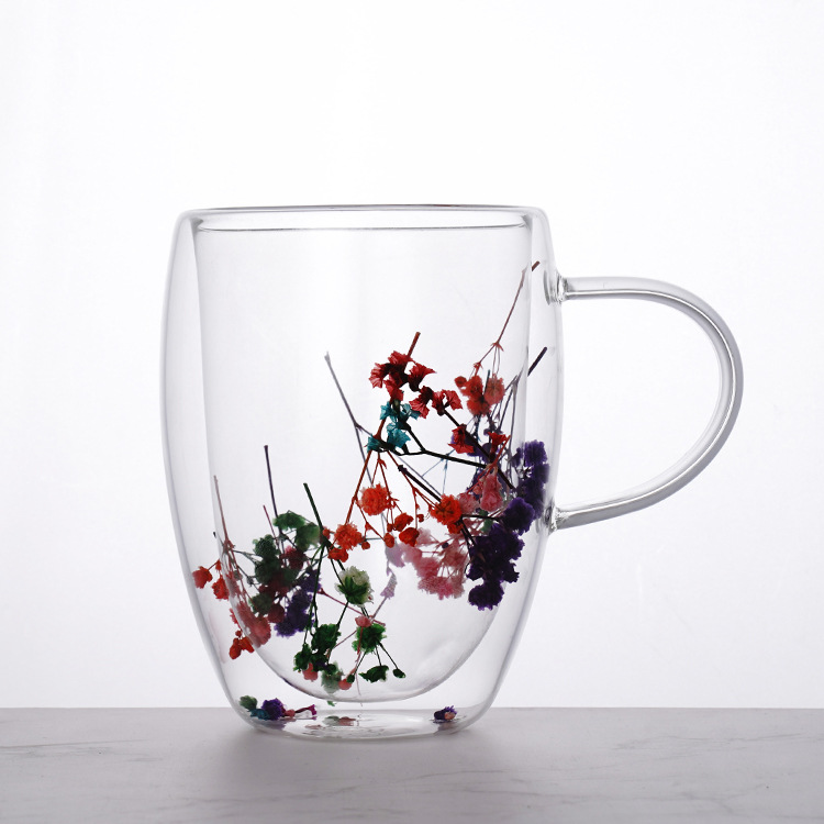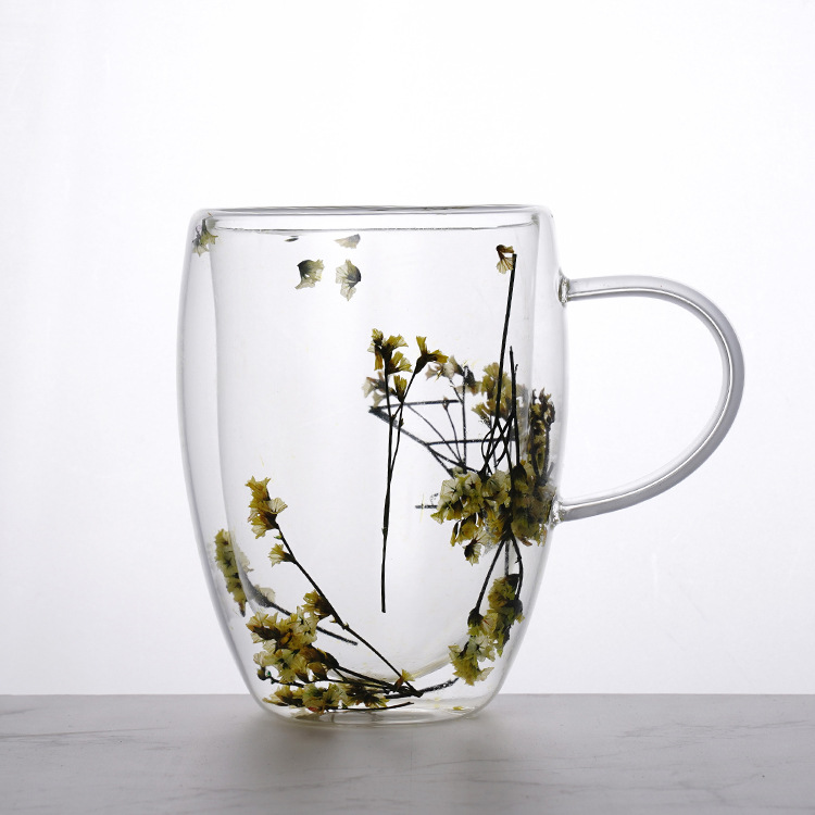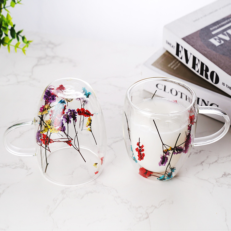 出口批发高硼硅双层干花杯耐高温带把手花朵玻璃杯ins牛奶果茶杯