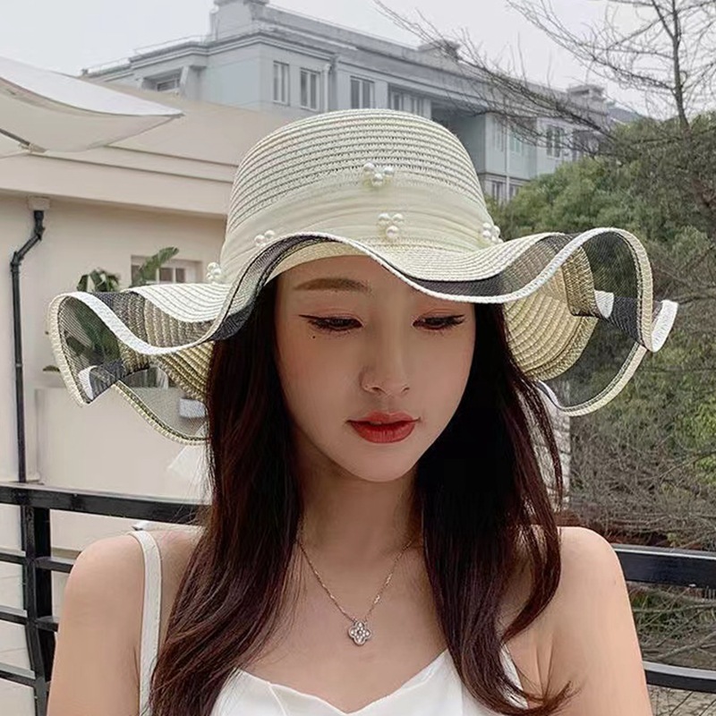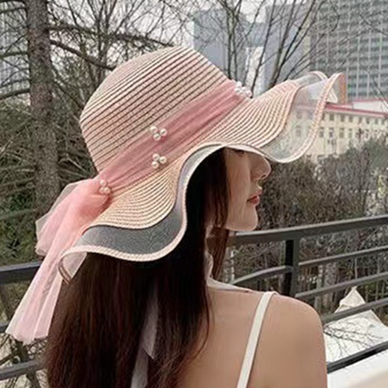 新款女士草帽夏季出游防嗮遮阳帽丝网飘带沙滩太阳帽潮波浪蝴蝶结