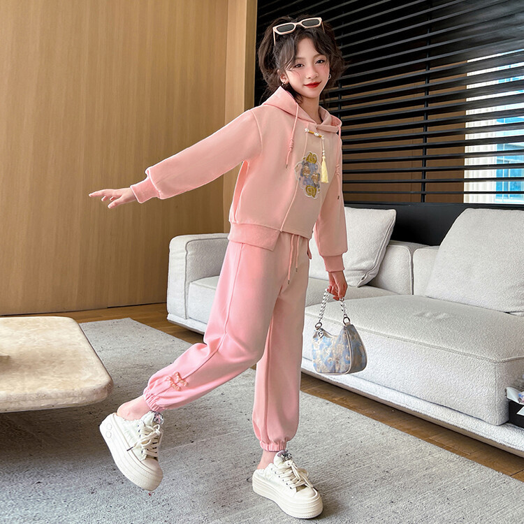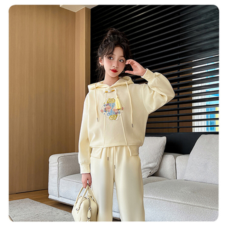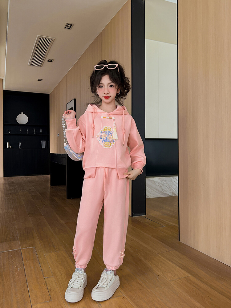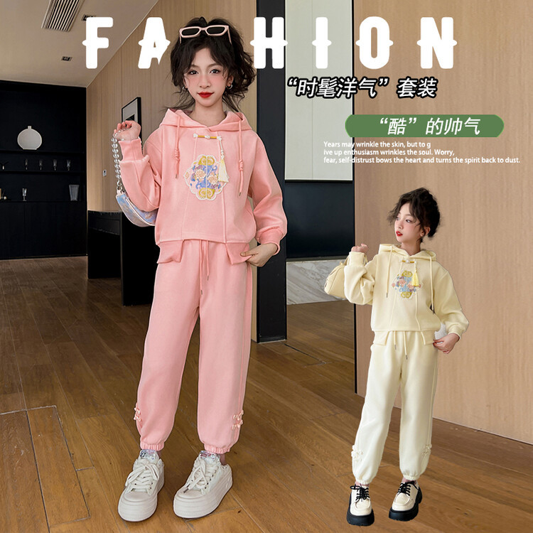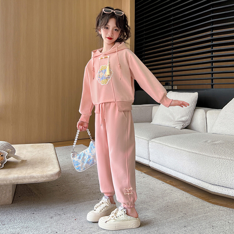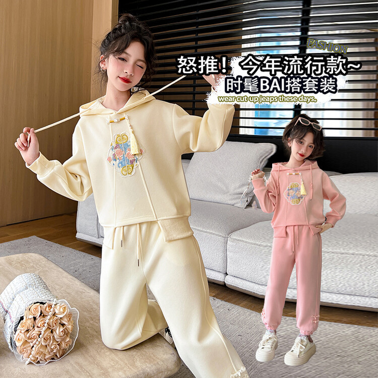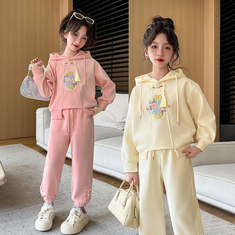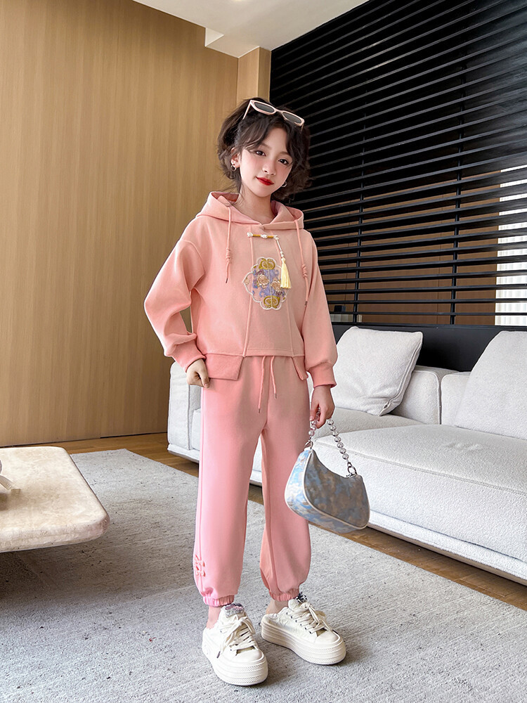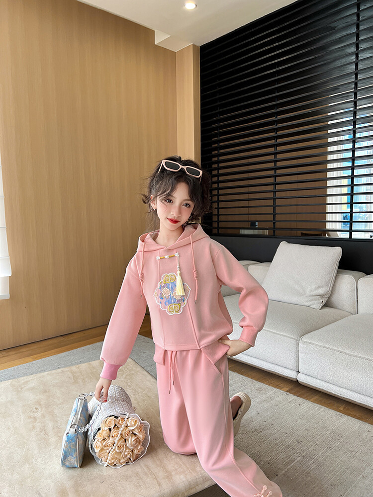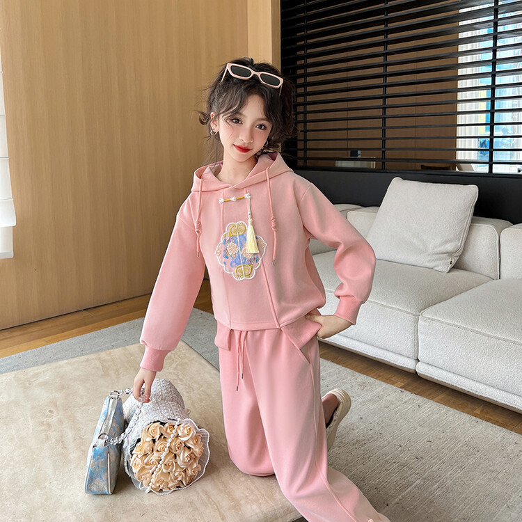 2024国风新款刺绣中式连帽女童时尚中国洋气儿童套装两件套