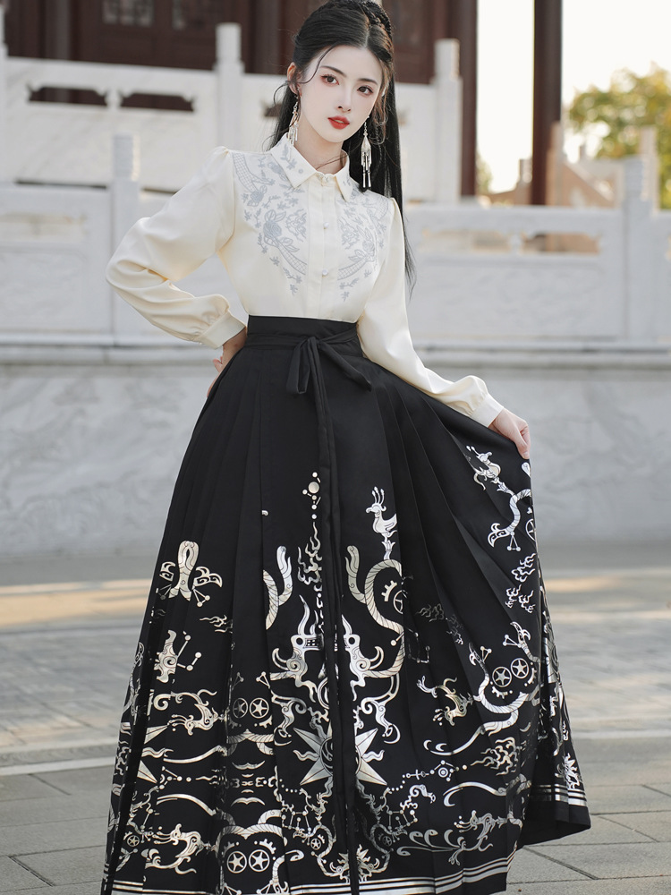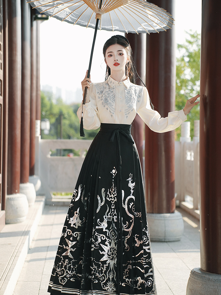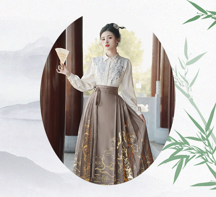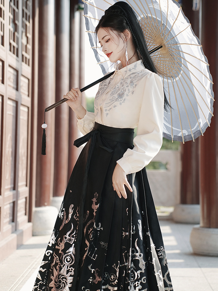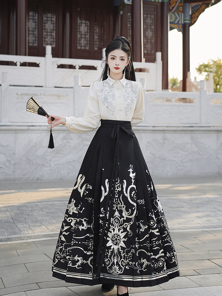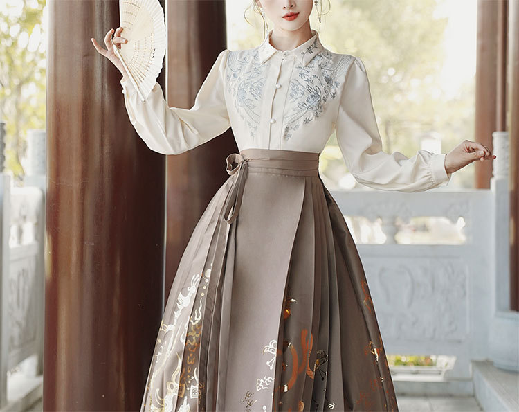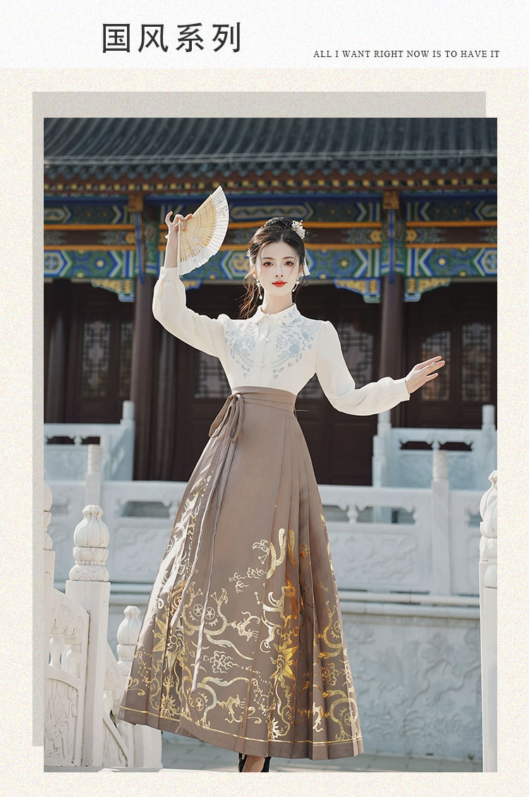 中国风女装长袖绣花衬衣优雅气质烫金马面裙改良新中式日常套装女