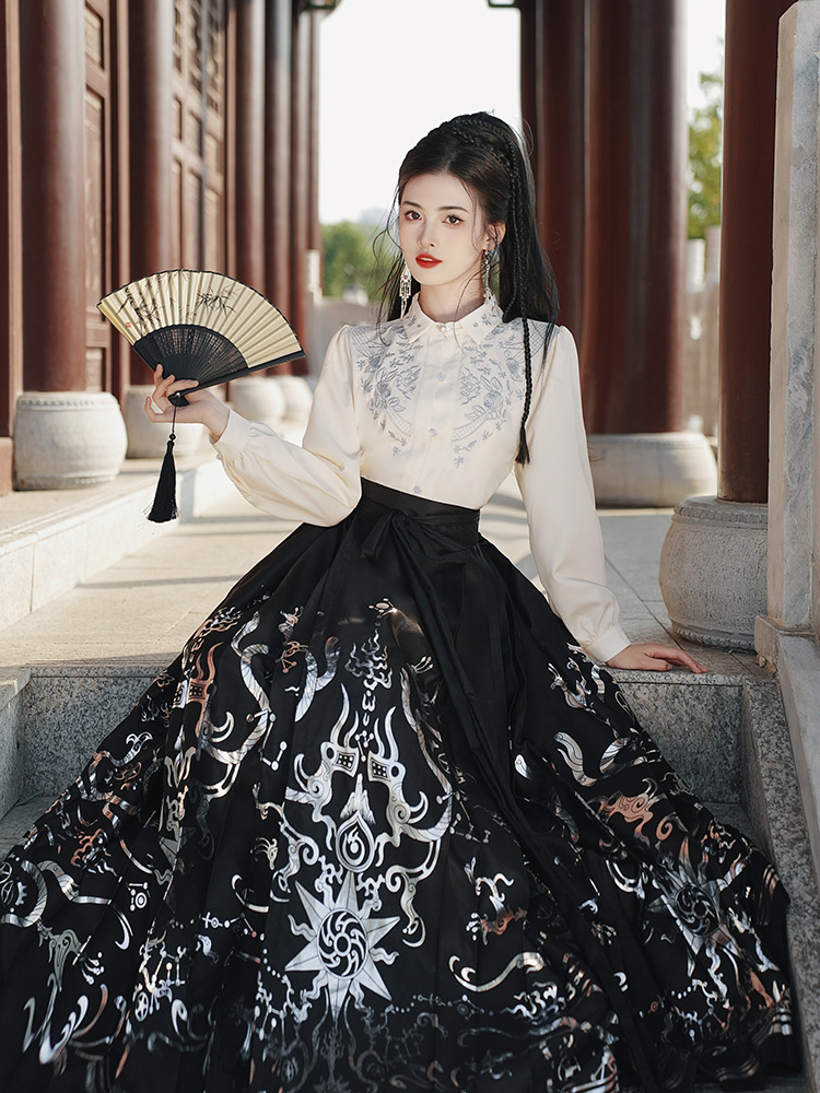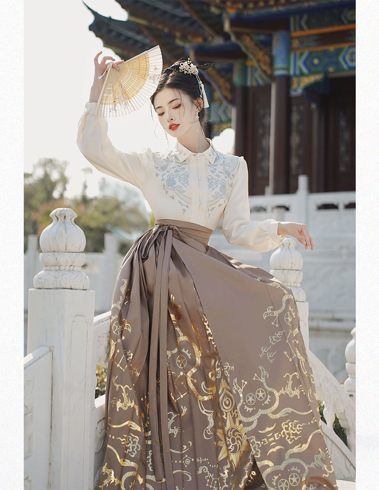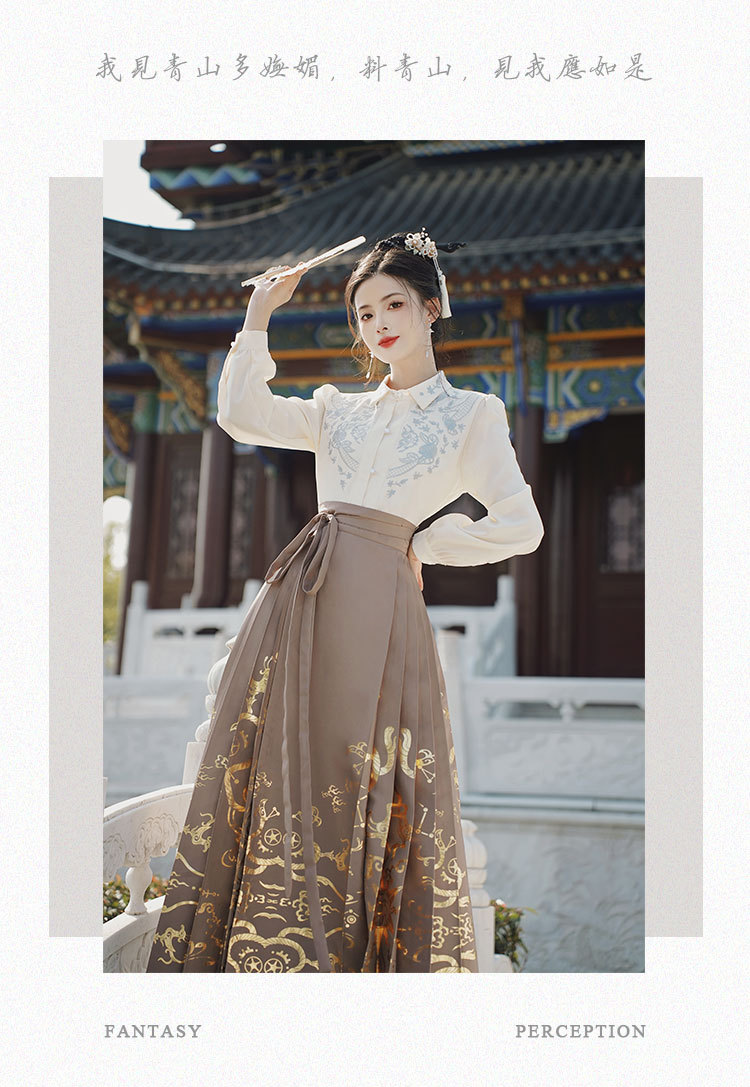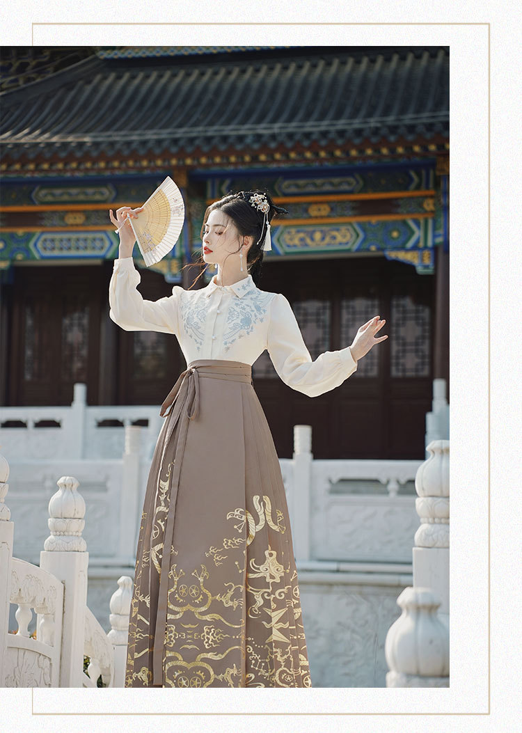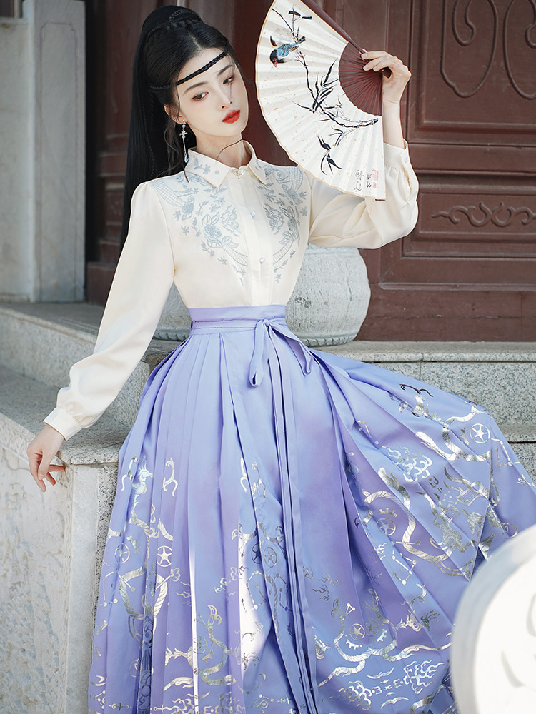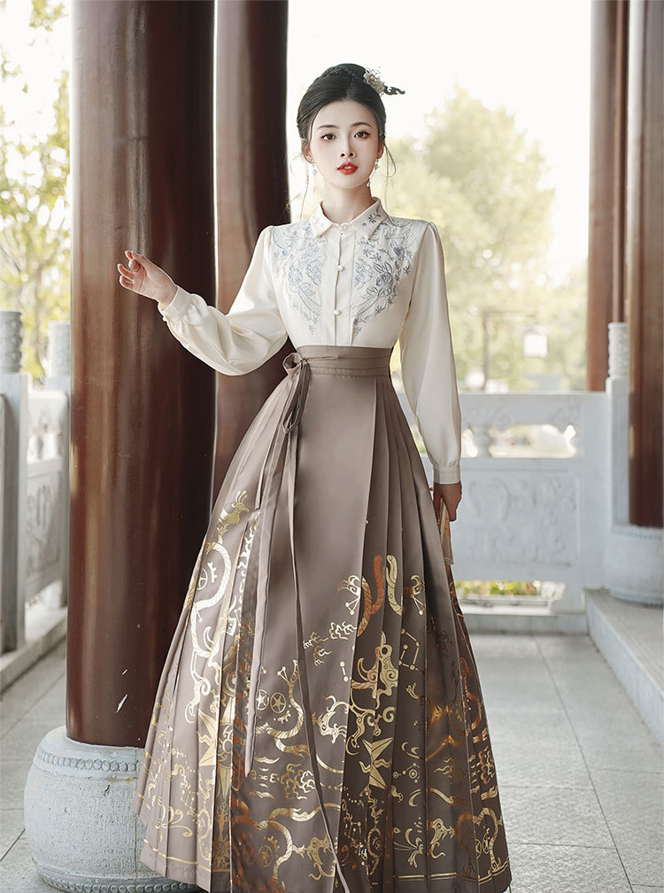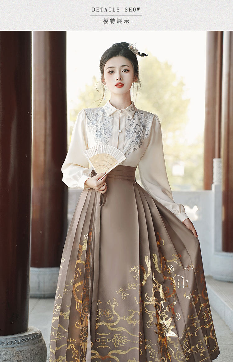 中国风女装长袖绣花衬衣优雅气质烫金马面裙改良新中式日常套装女