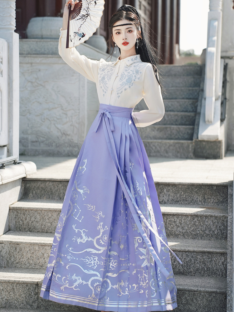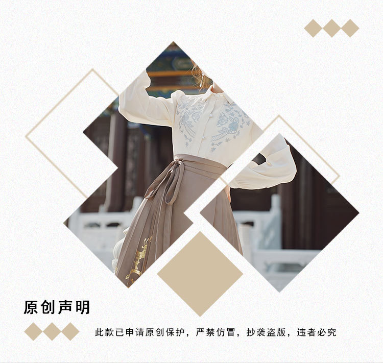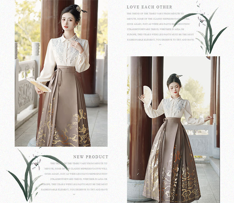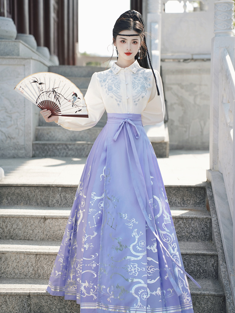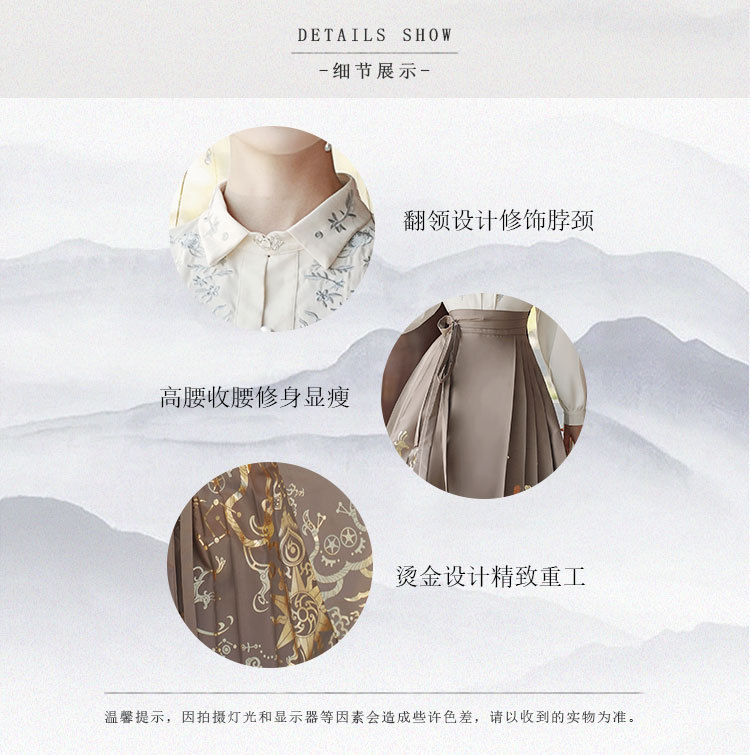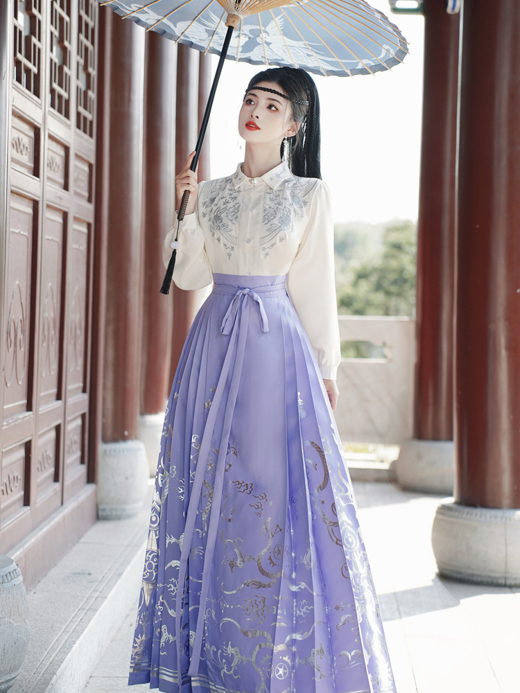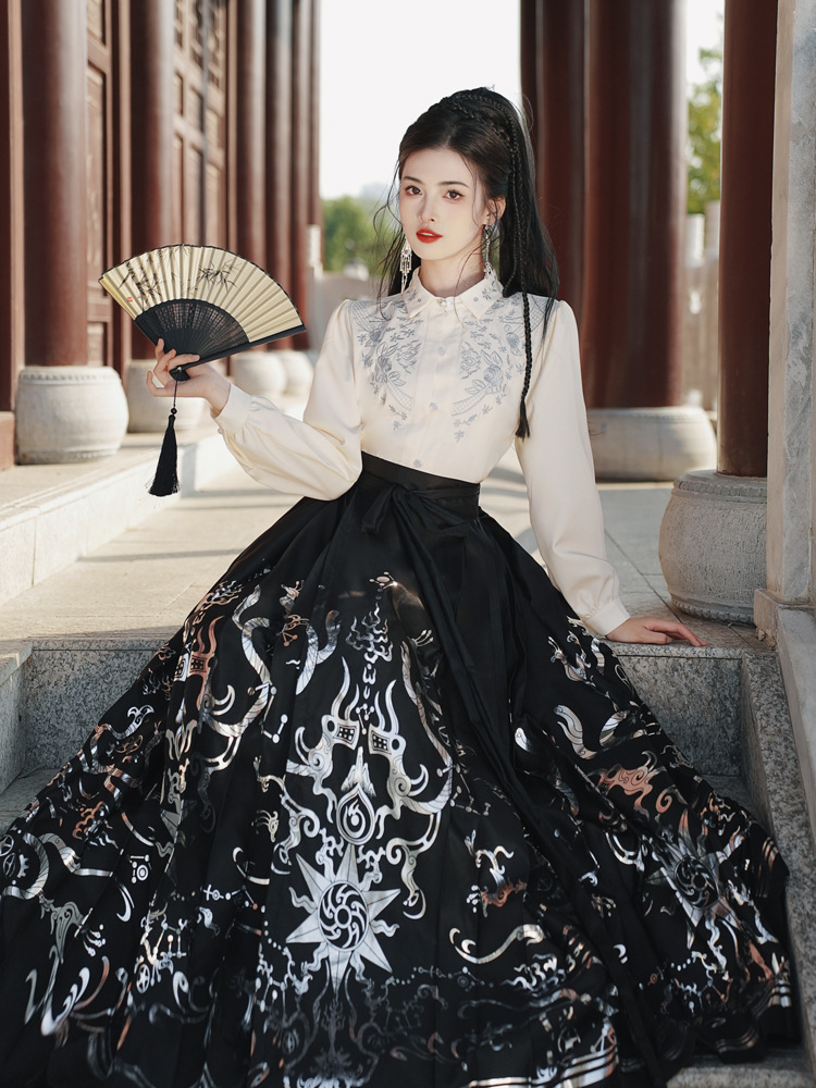 中国风女装长袖绣花衬衣优雅气质烫金马面裙改良新中式日常套装女