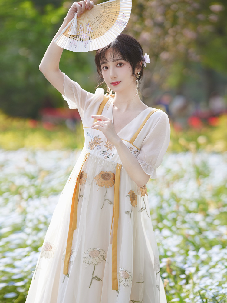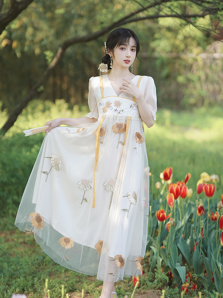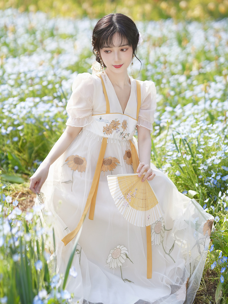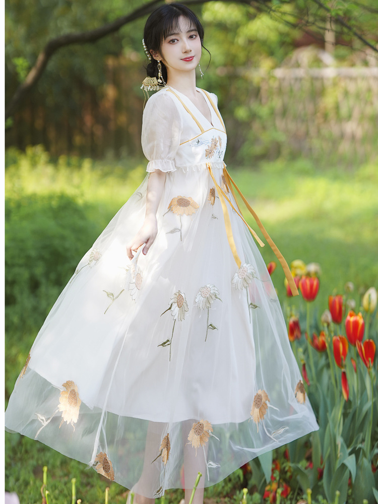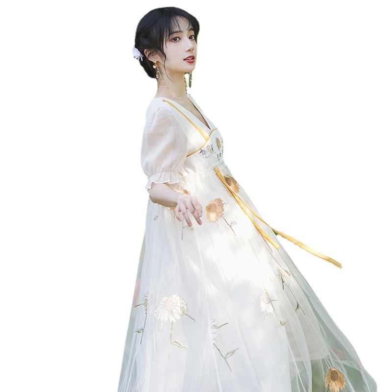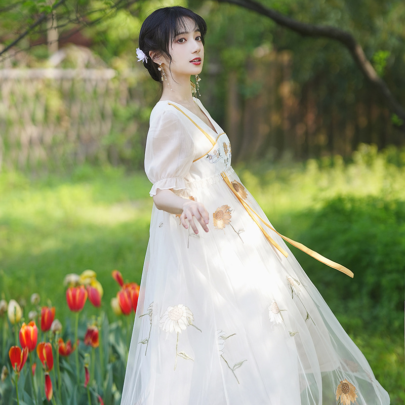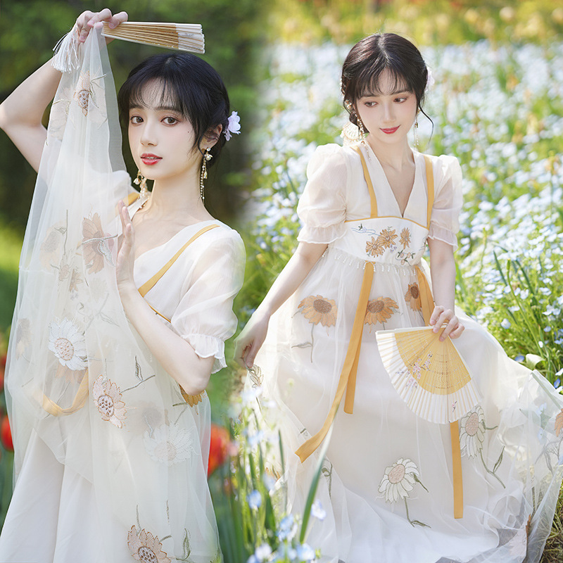 中国风齐胸裙短袖绣花日常女装汉元素绣花重工订珠国风复古连衣裙