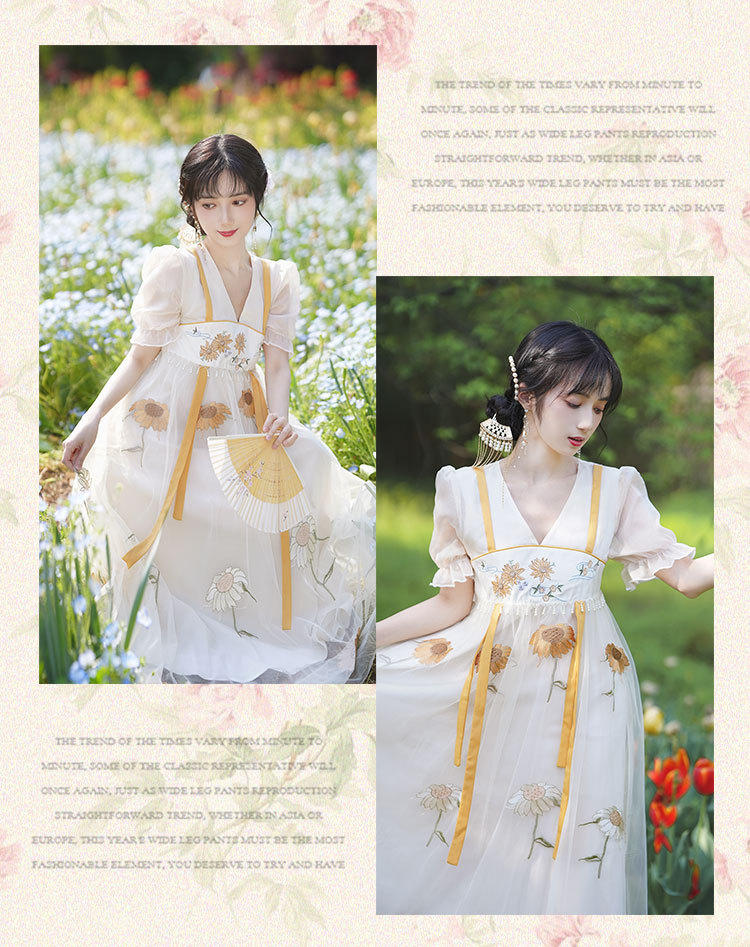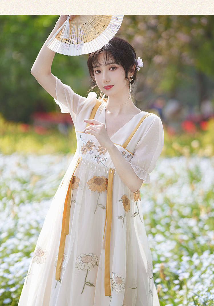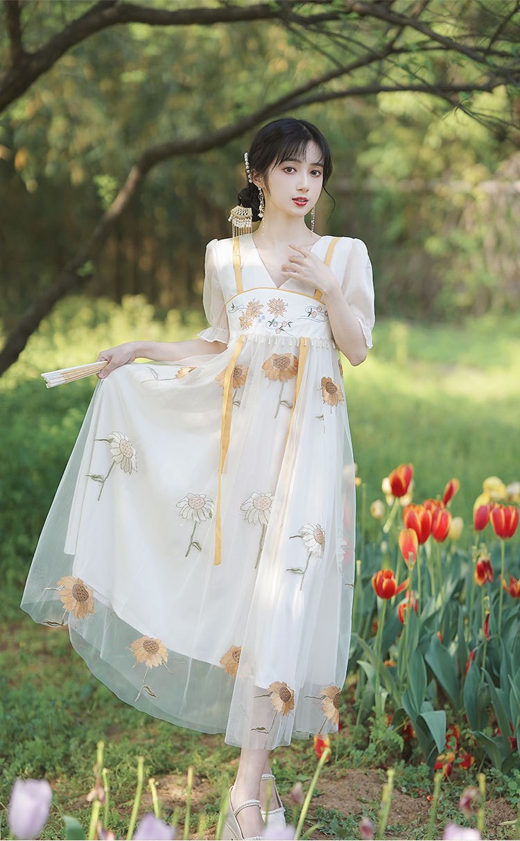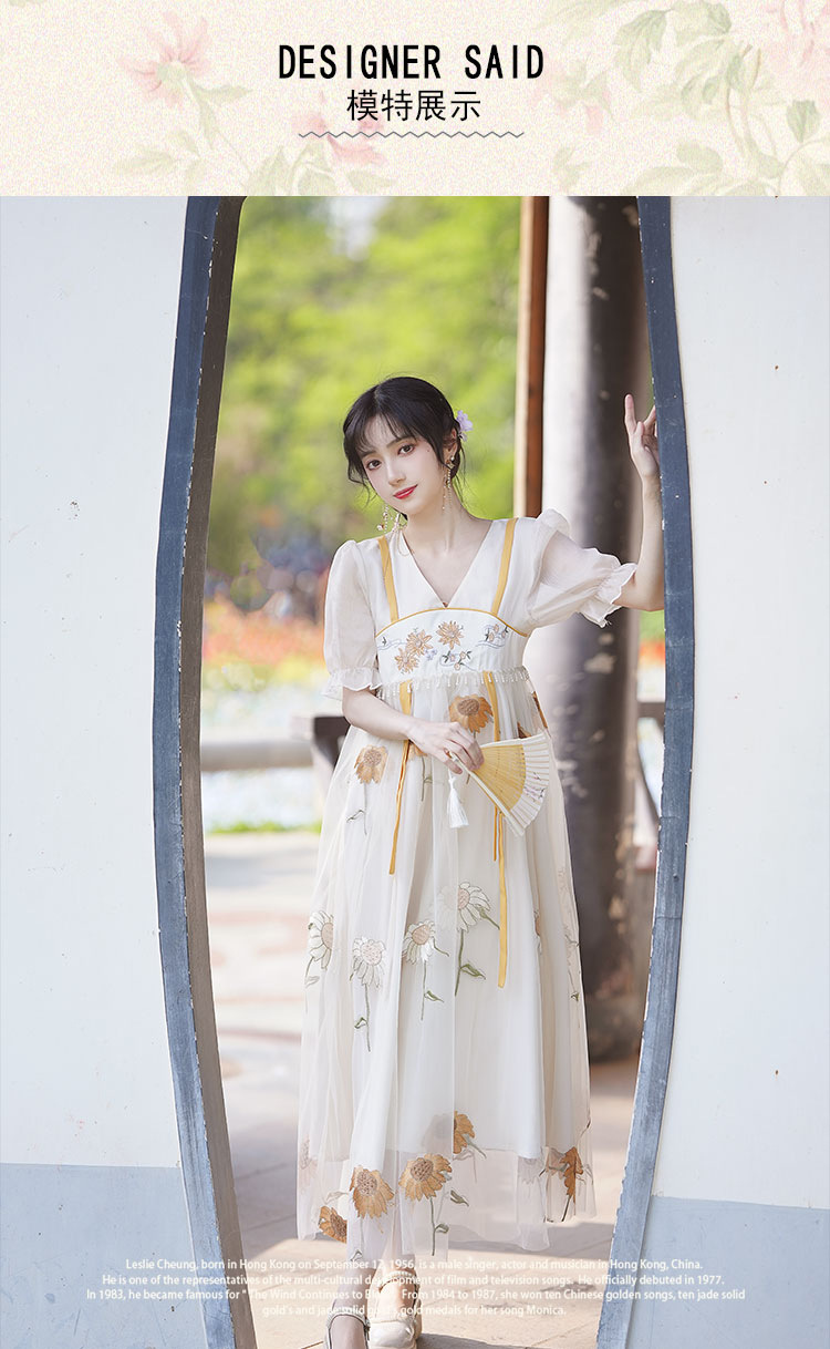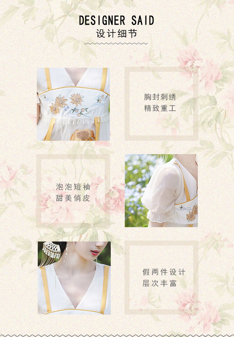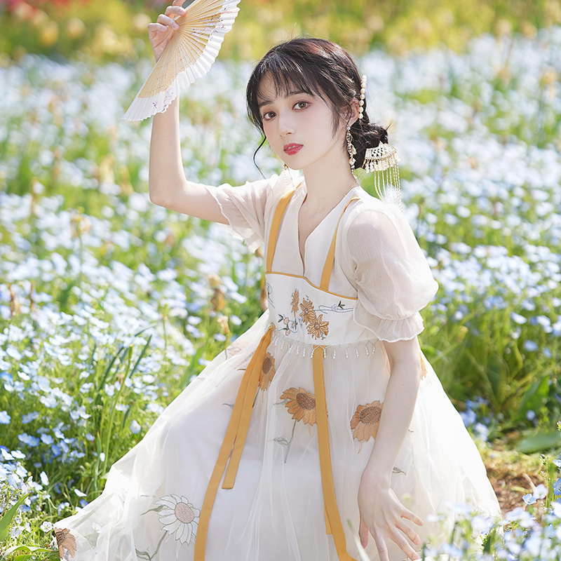 中国风齐胸裙短袖绣花日常女装汉元素绣花重工订珠国风复古连衣裙