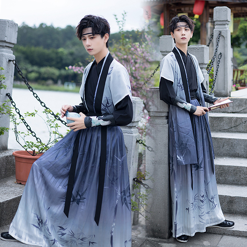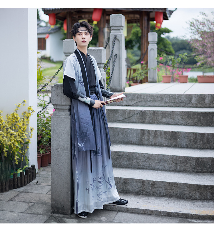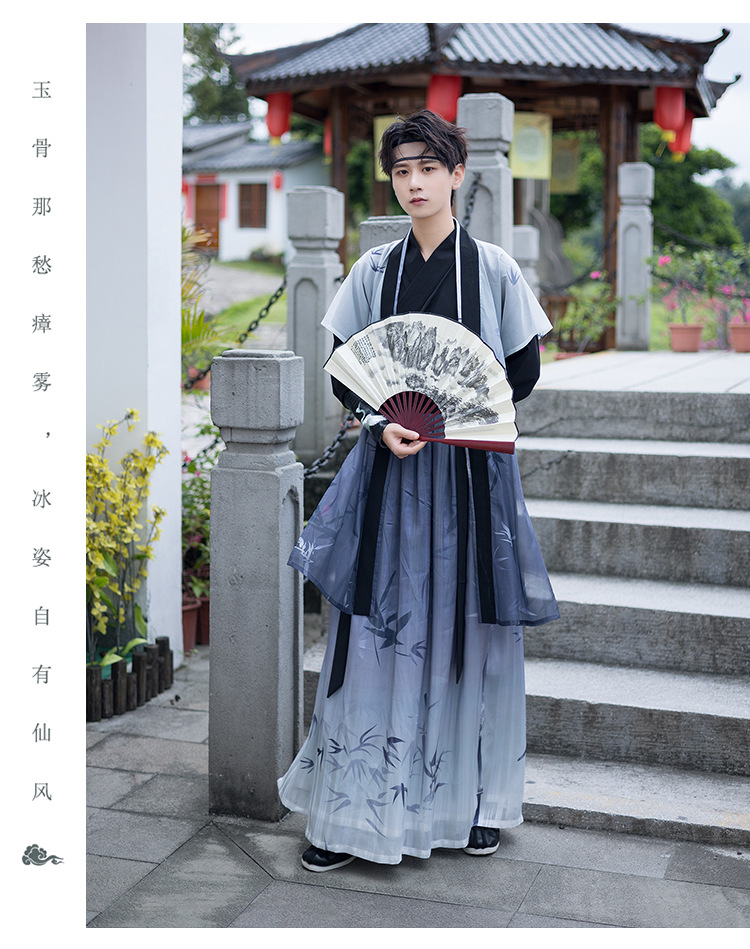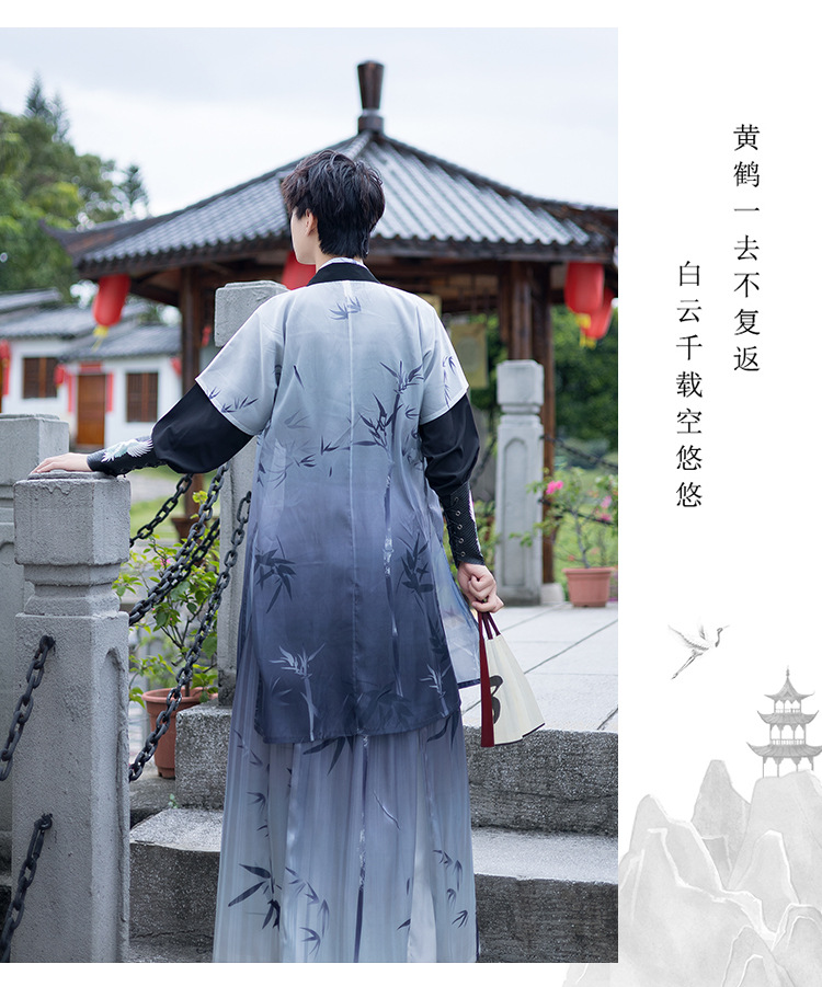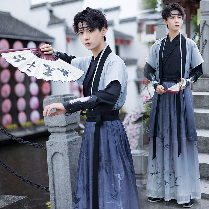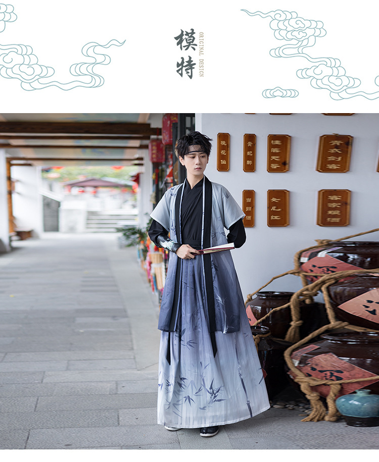 中国风大码男装浅灰长袖汉服青竹开衫三件套古装汉元素传统演出服