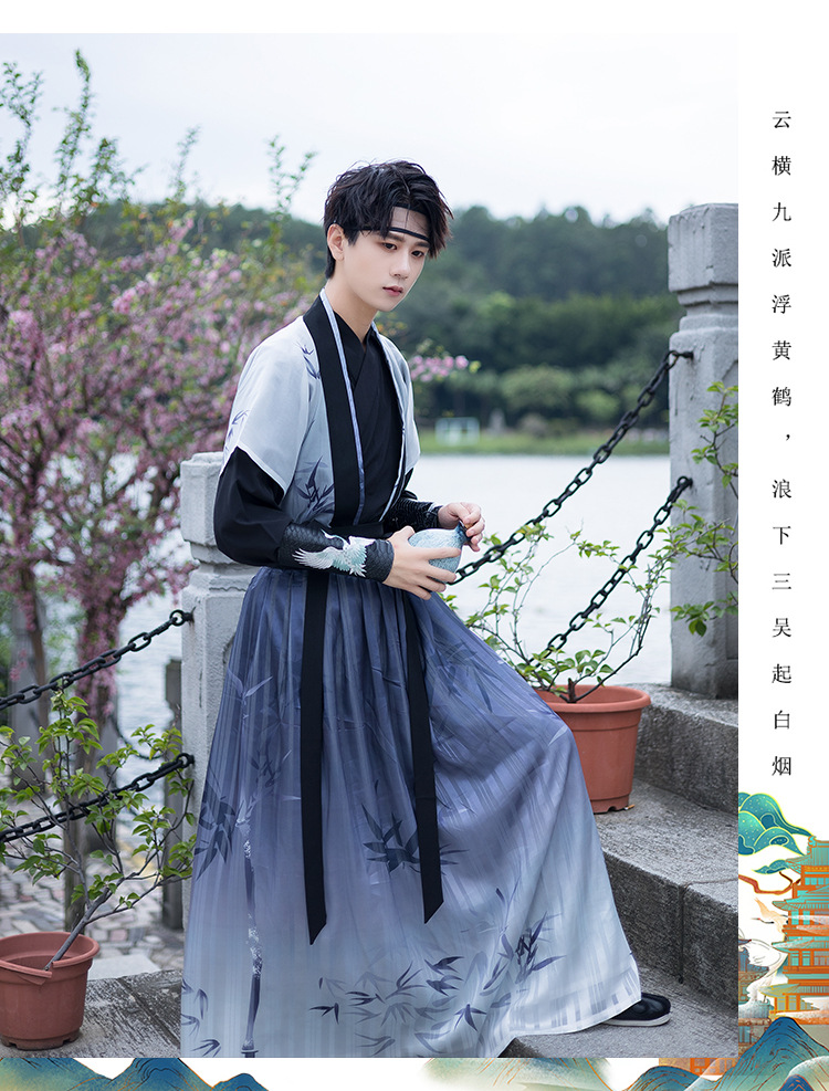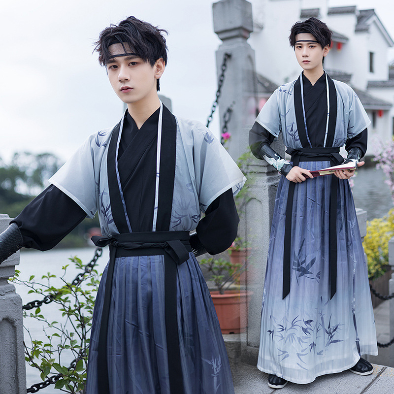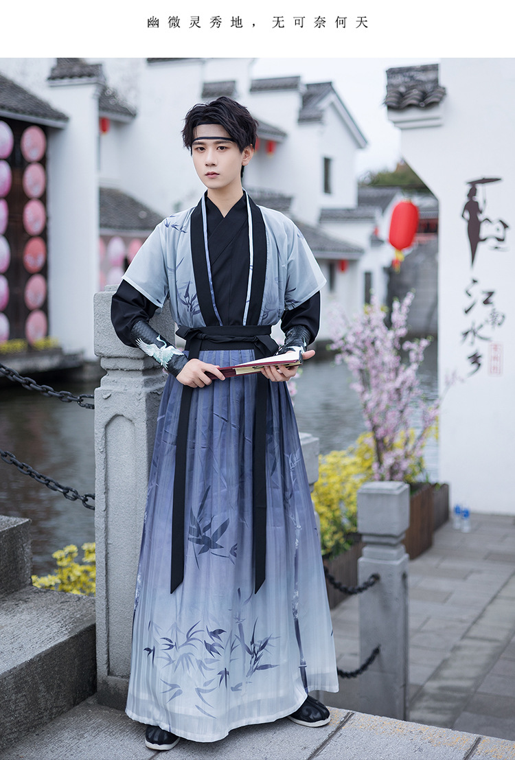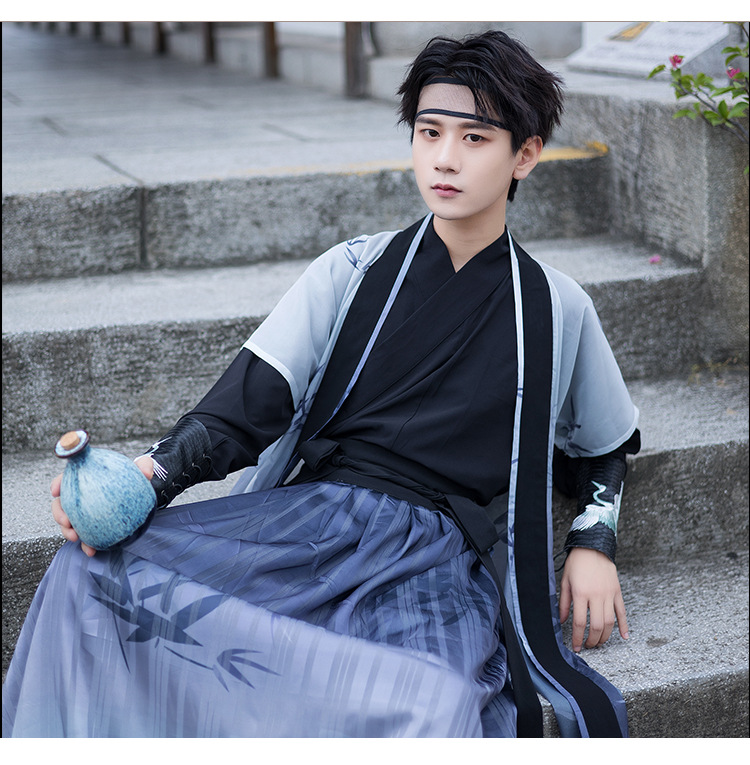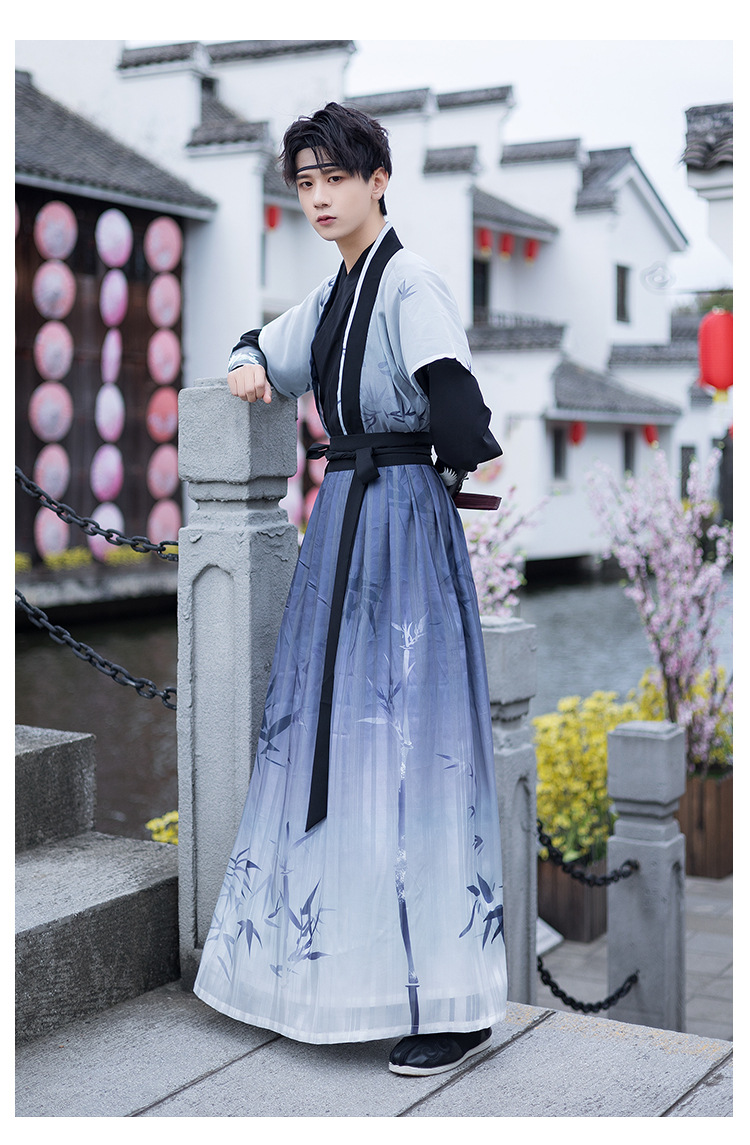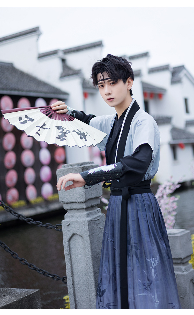 中国风大码男装浅灰长袖汉服青竹开衫三件套古装汉元素传统演出服