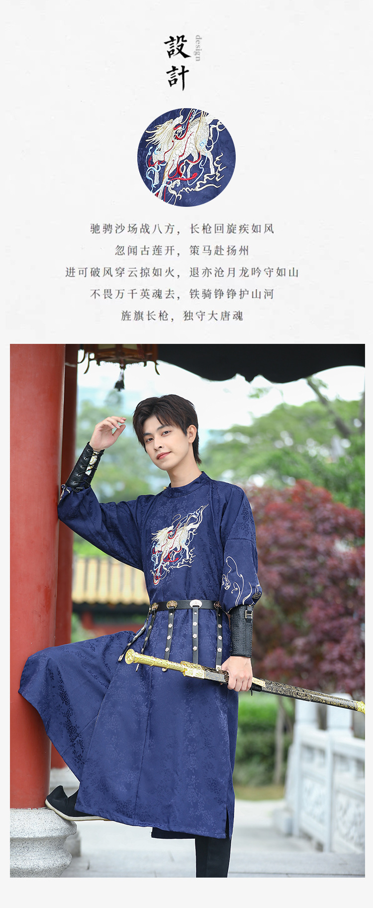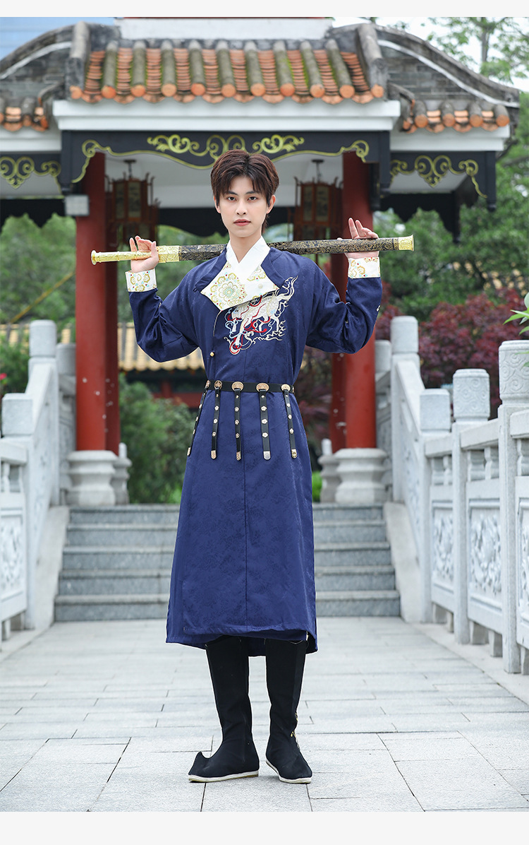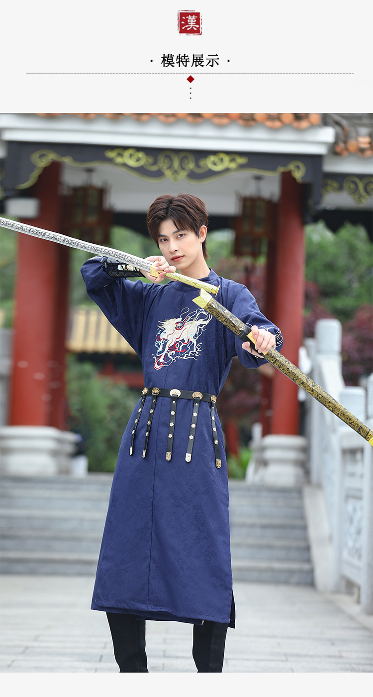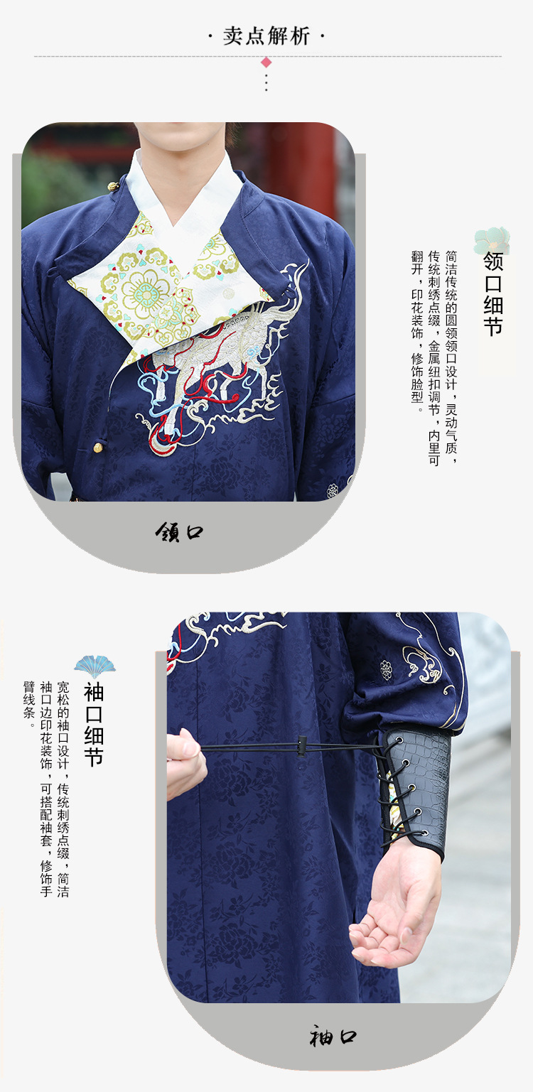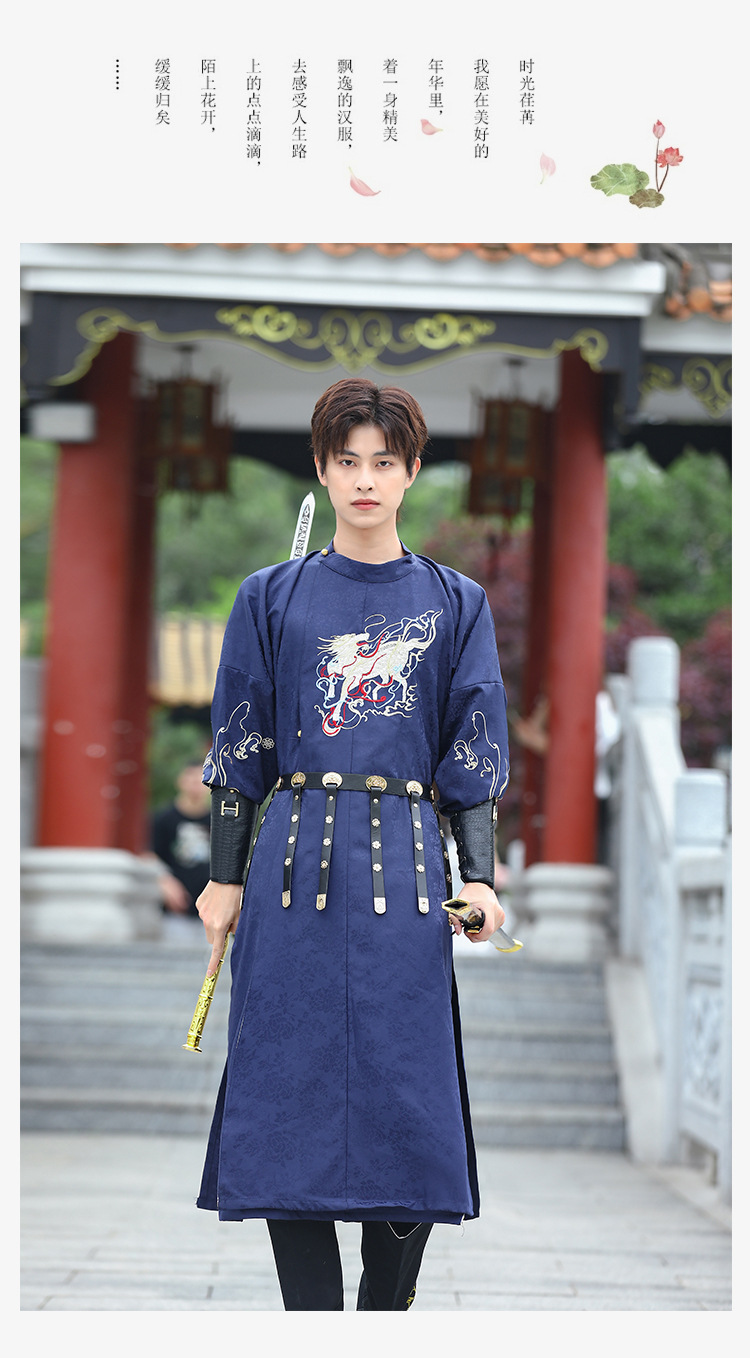中国风宝蓝色麒麟绣花长袖圆领袍改良汉服男生古风汉元素飞鱼服男