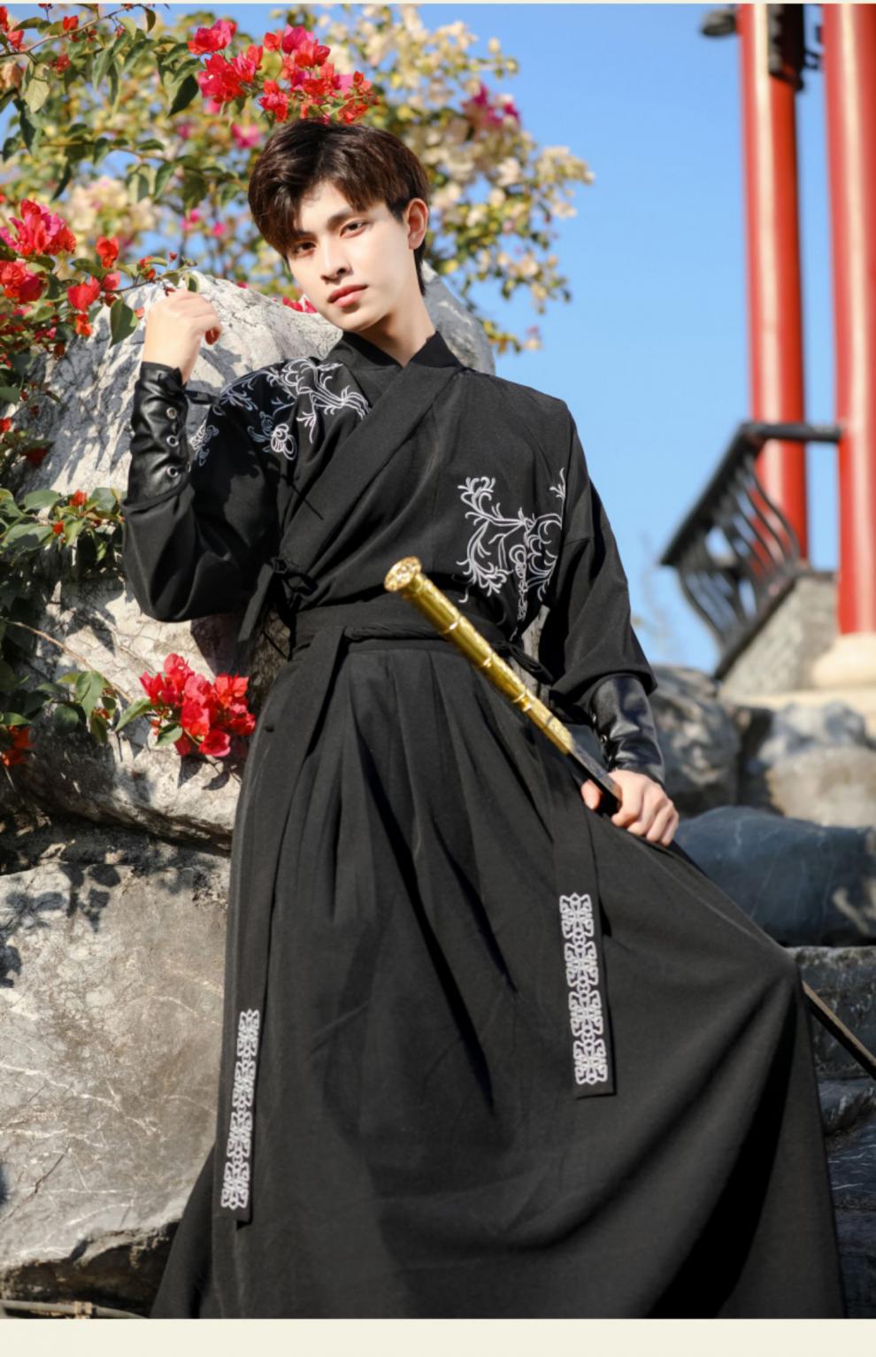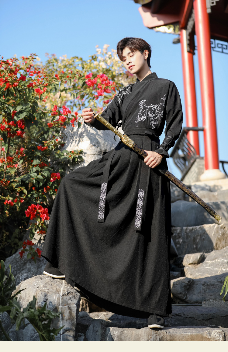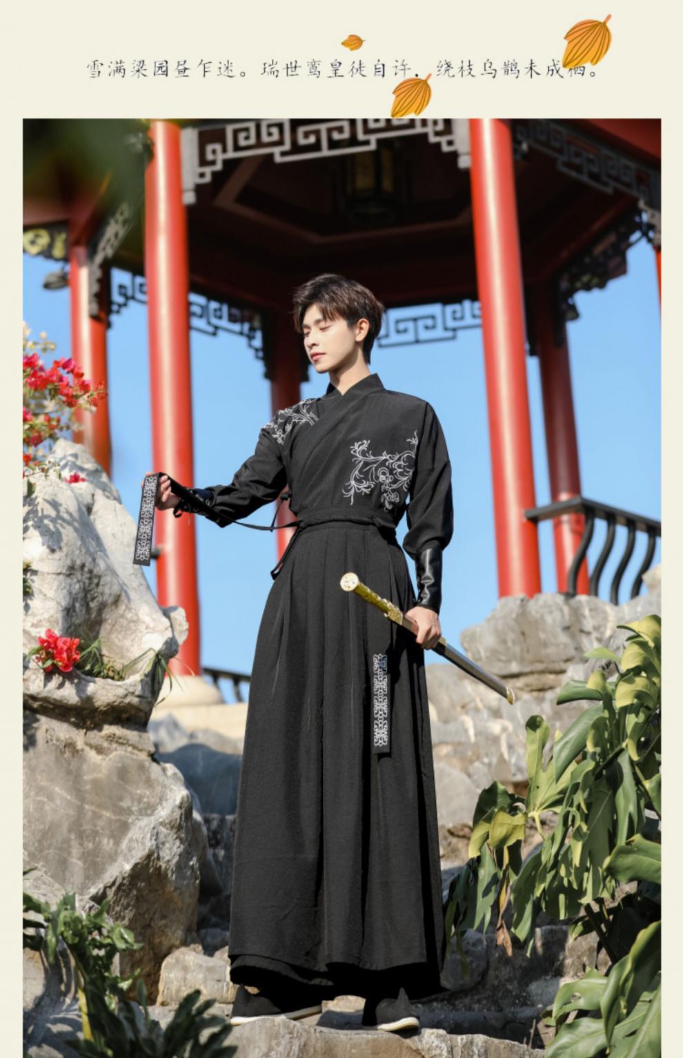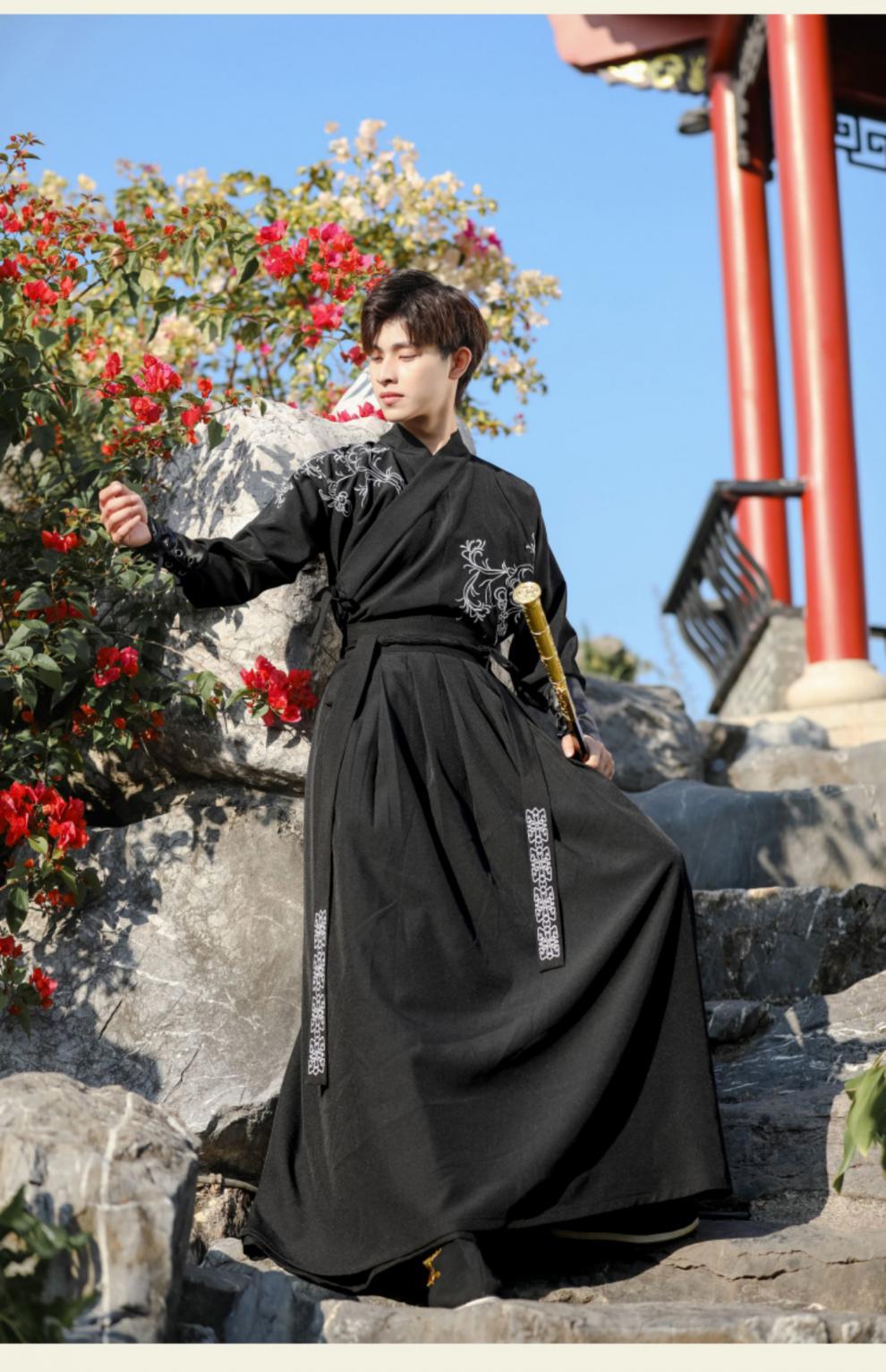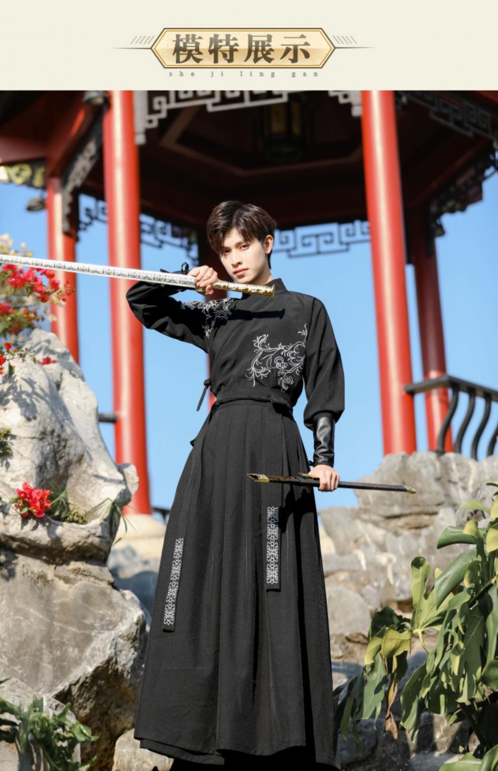 新款汉服男公子黑色长袖中国风绣花交领武侠剑客帅气团体班服套装