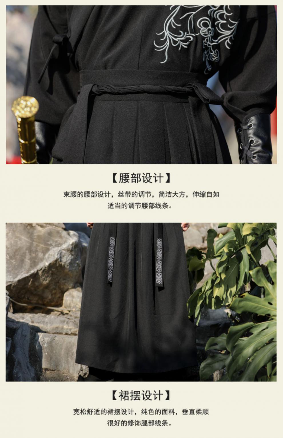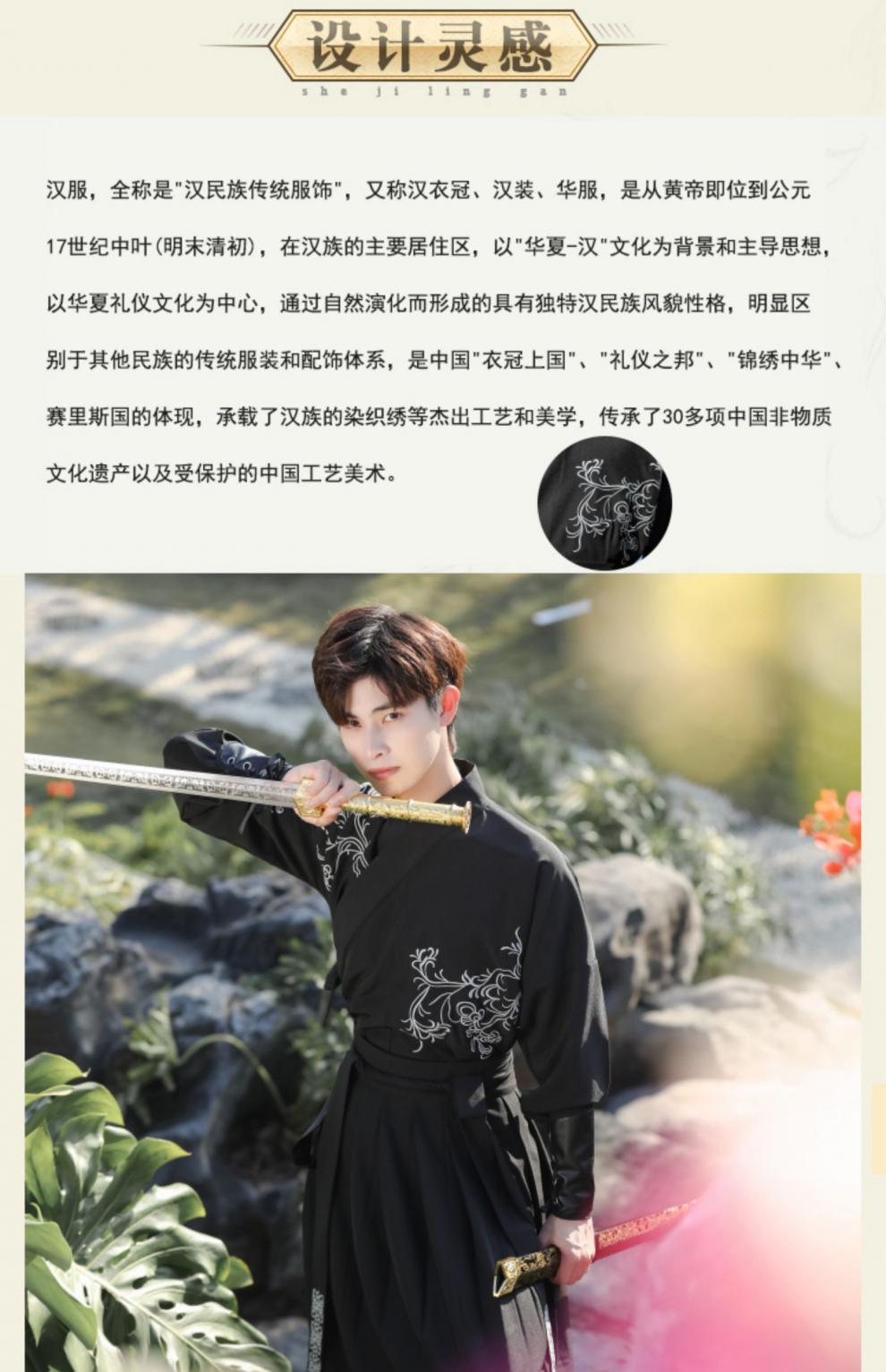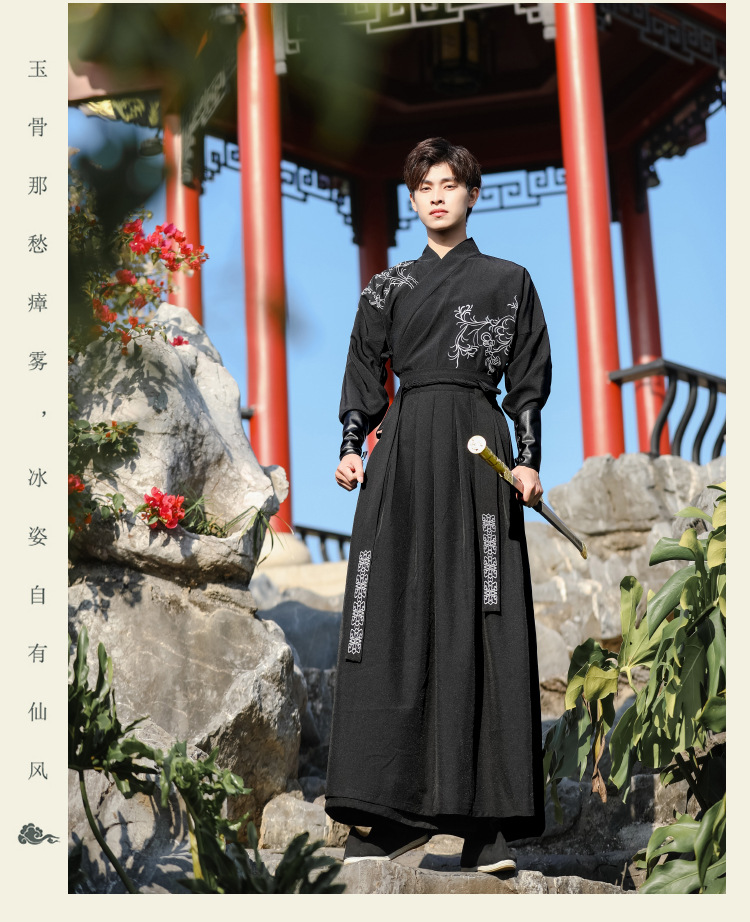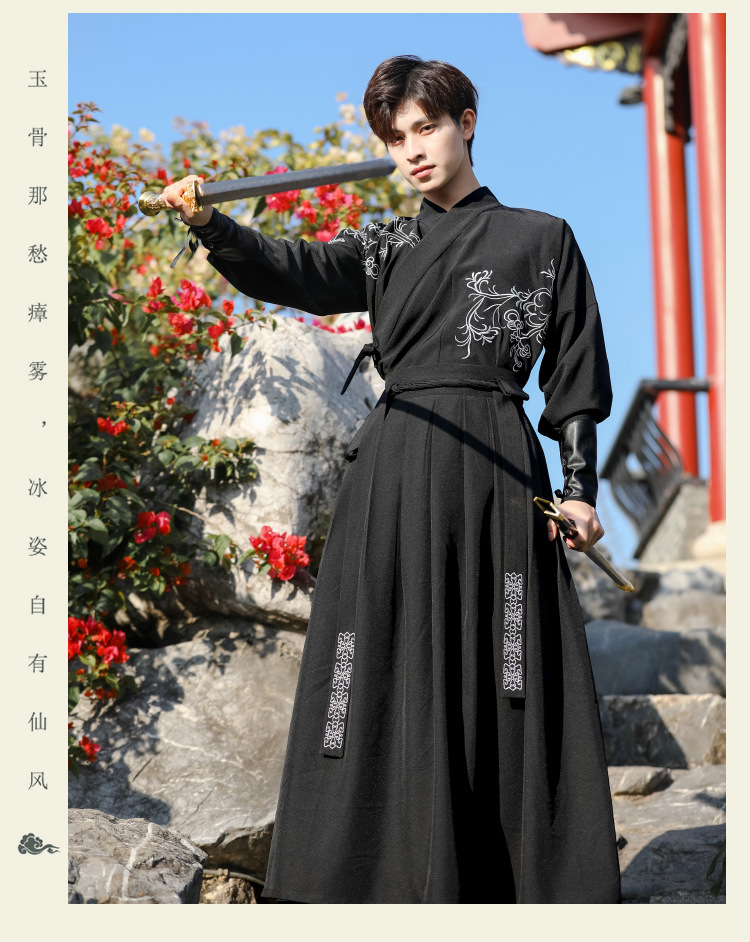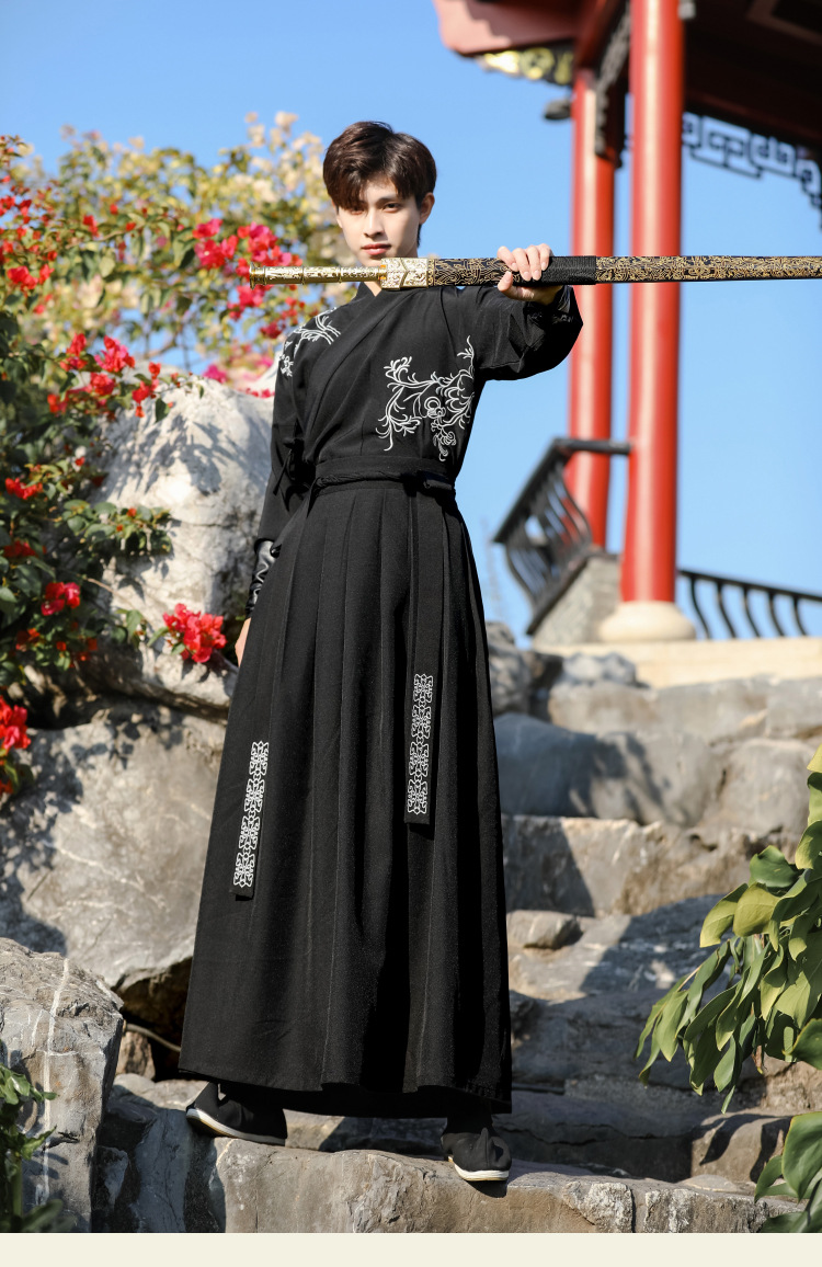 新款汉服男公子黑色长袖中国风绣花交领武侠剑客帅气团体班服套装
