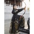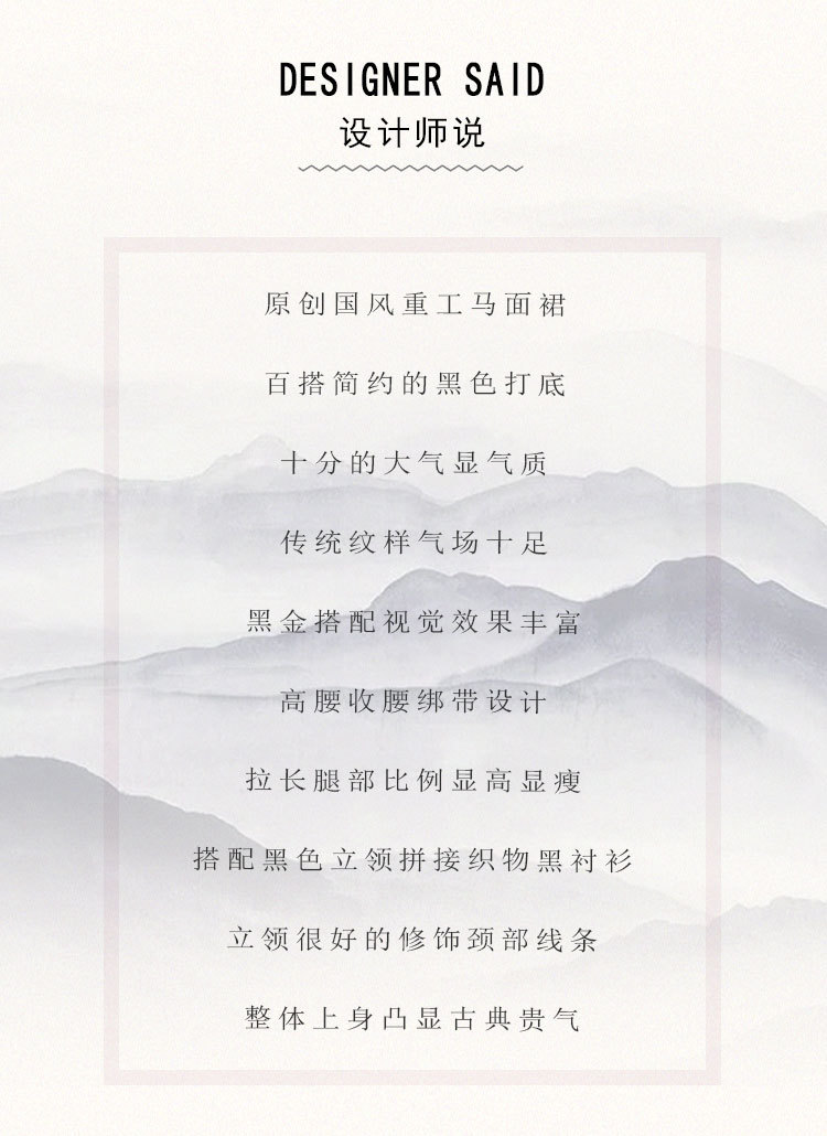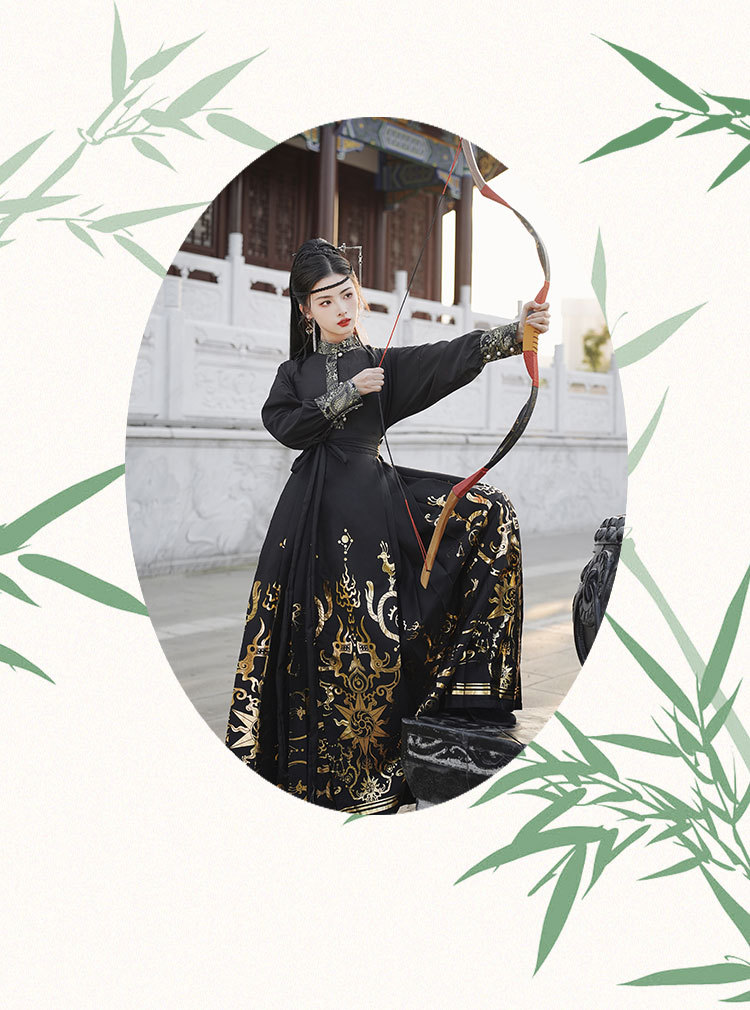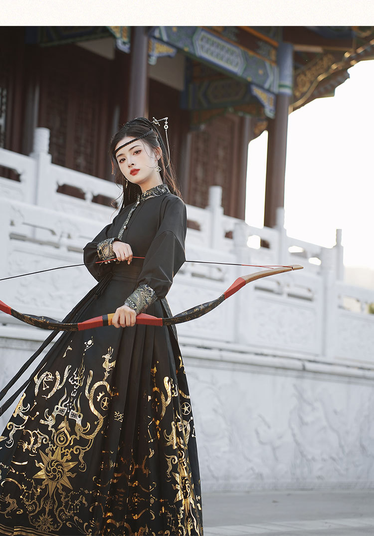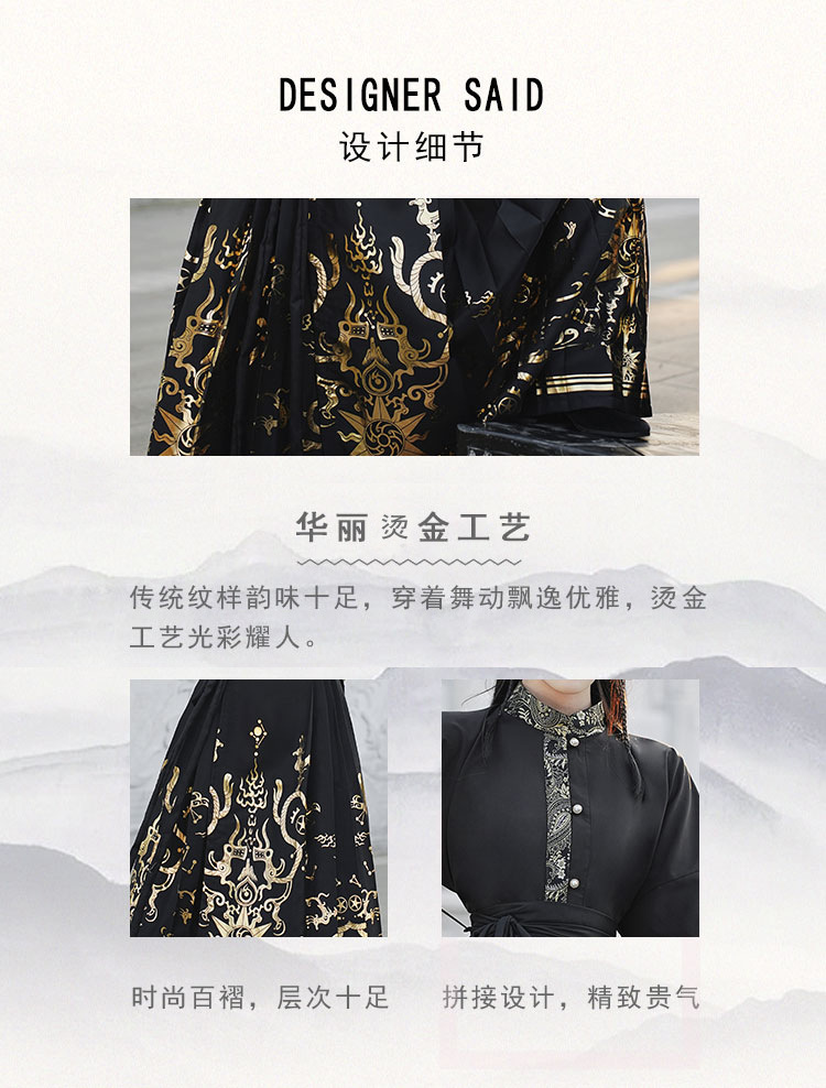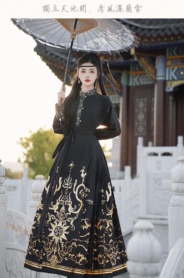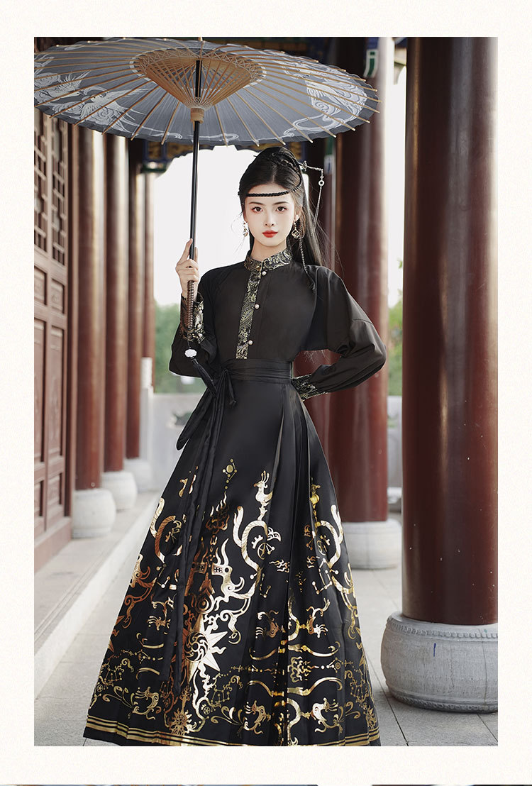 中国风女装长袖绣花衬衣帅气黑色烫金马面裙女式新中式日常套装