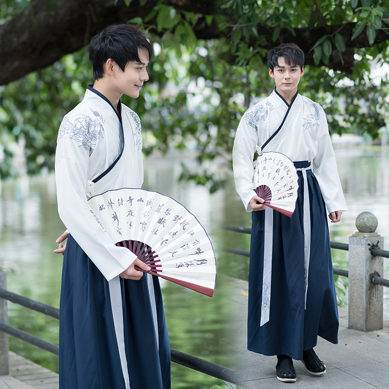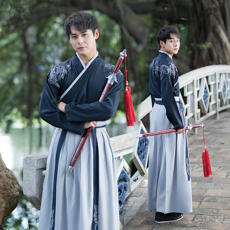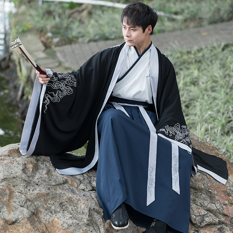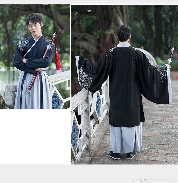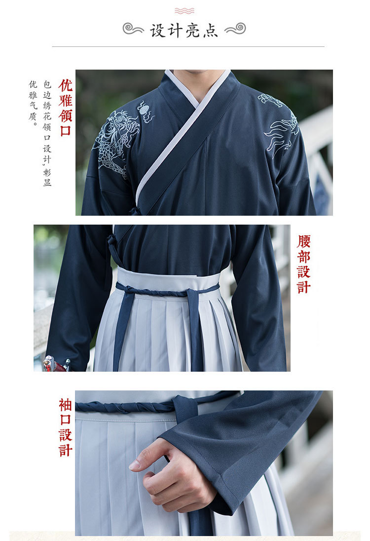 中国风男装汉服套装古装汉元素古风深蓝绣花大氅传统书生道袍套装