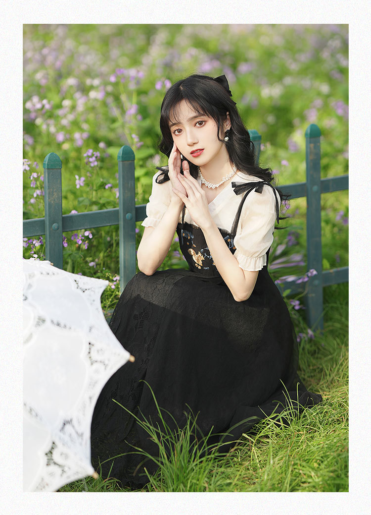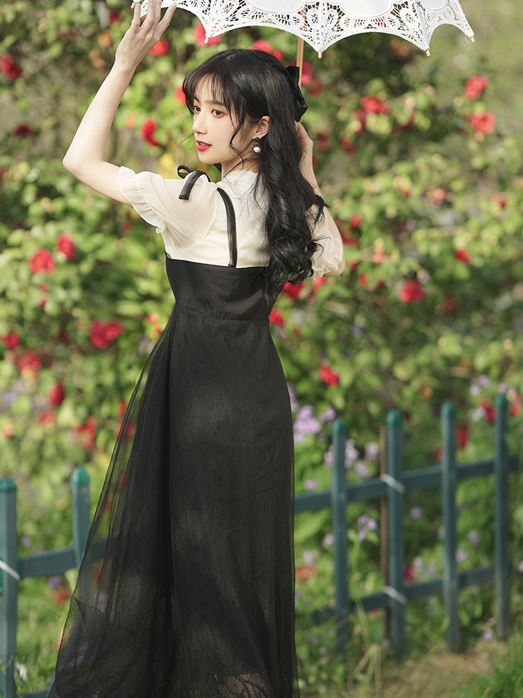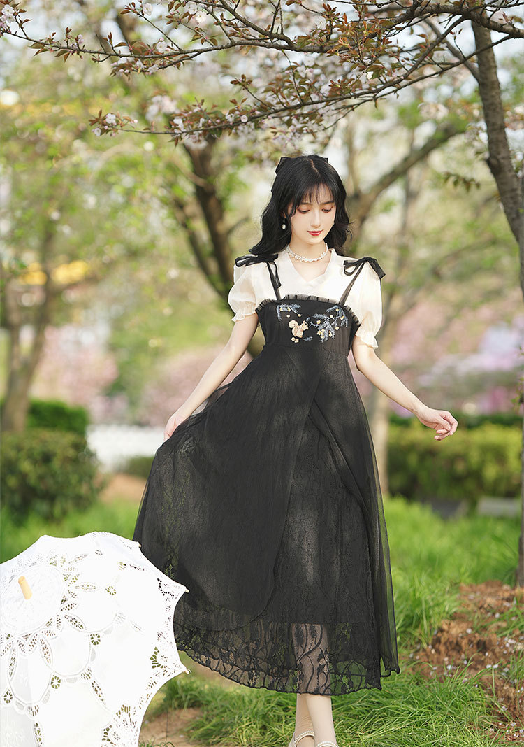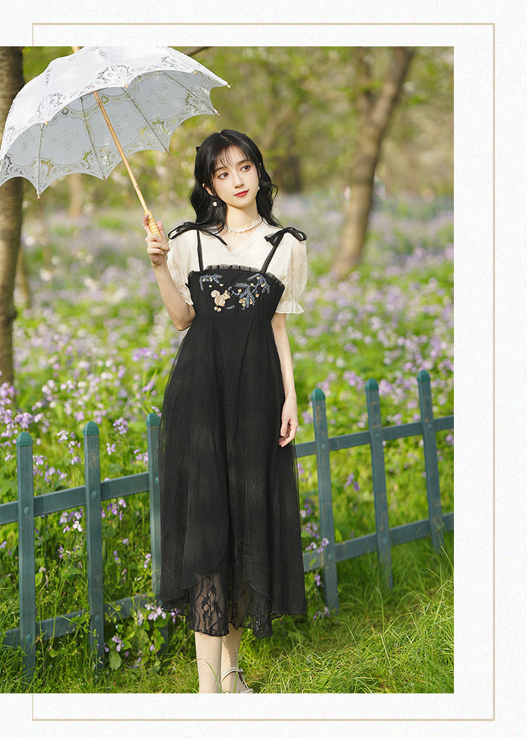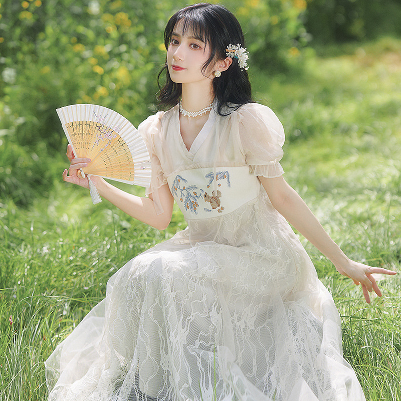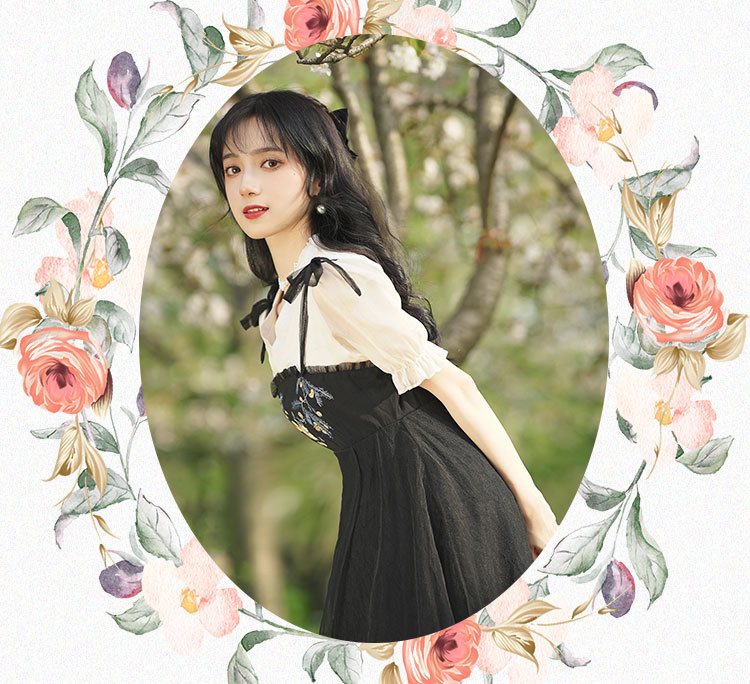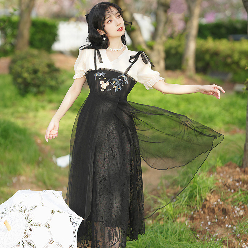 夏季民族风改良日常汉服女裙国风汉元素拼色假两件短袖绣花连衣裙