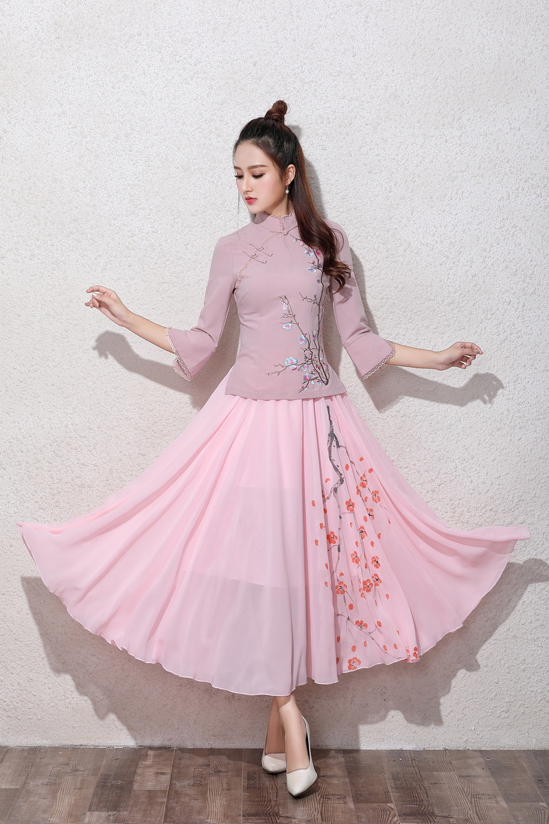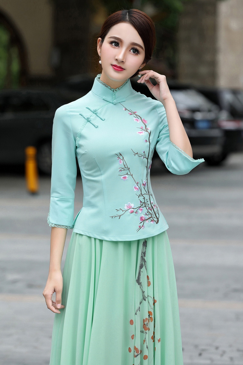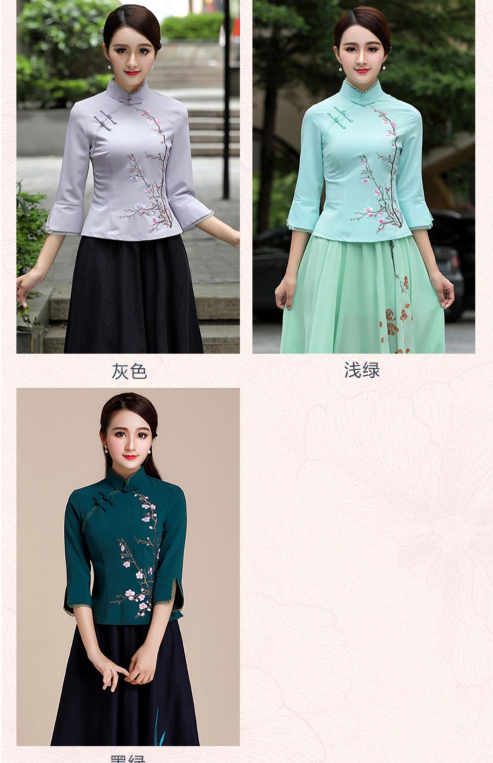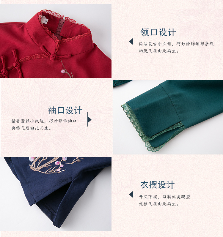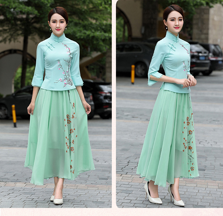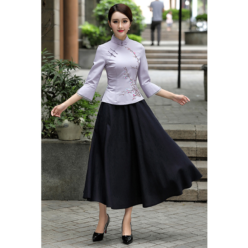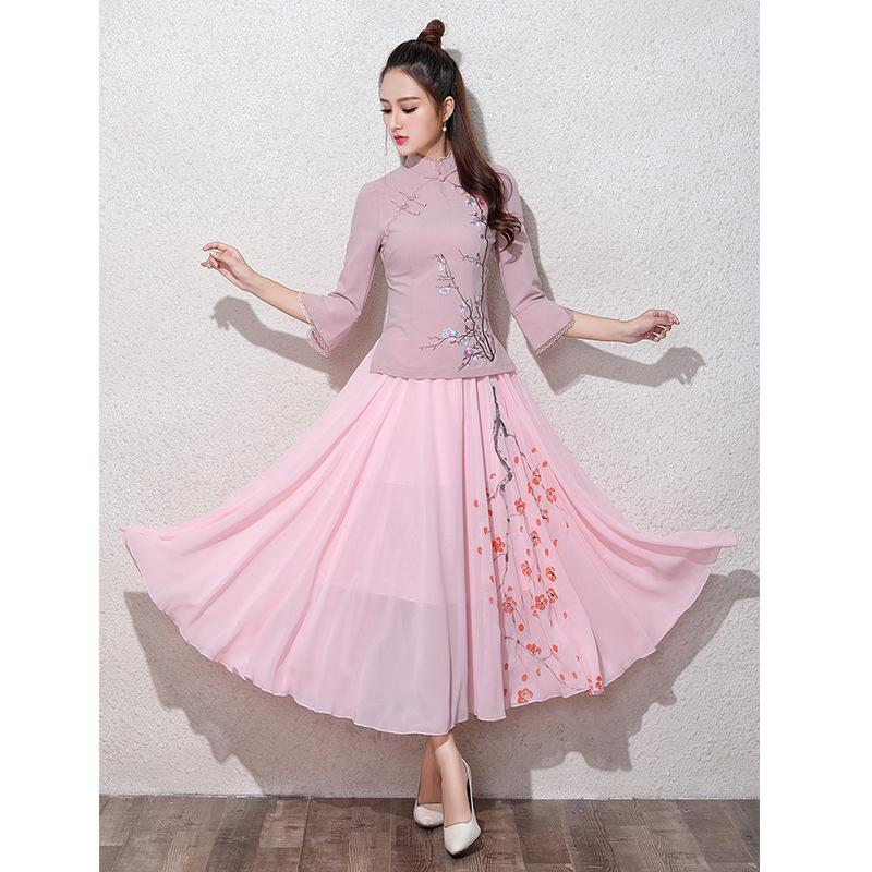 春夏中式大码女装典雅日常梅花绣花民国风立领旗袍款上衣长裙套装