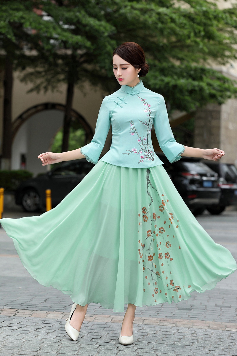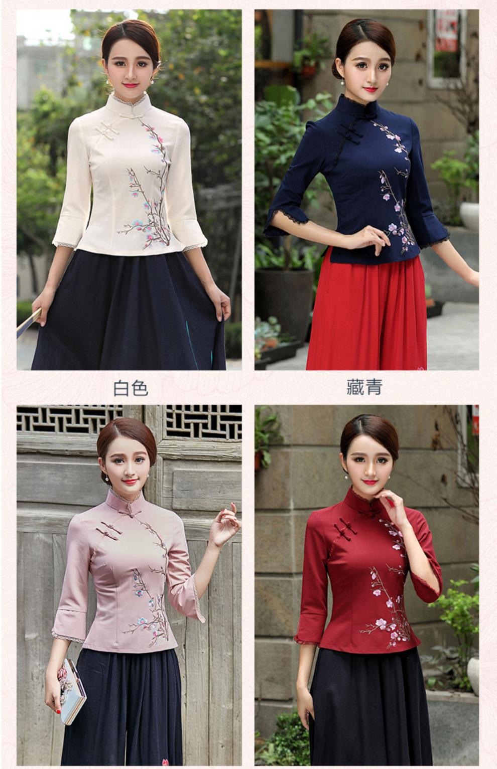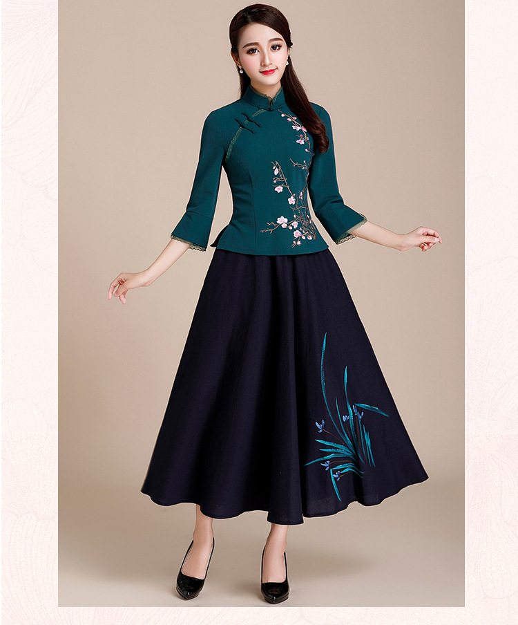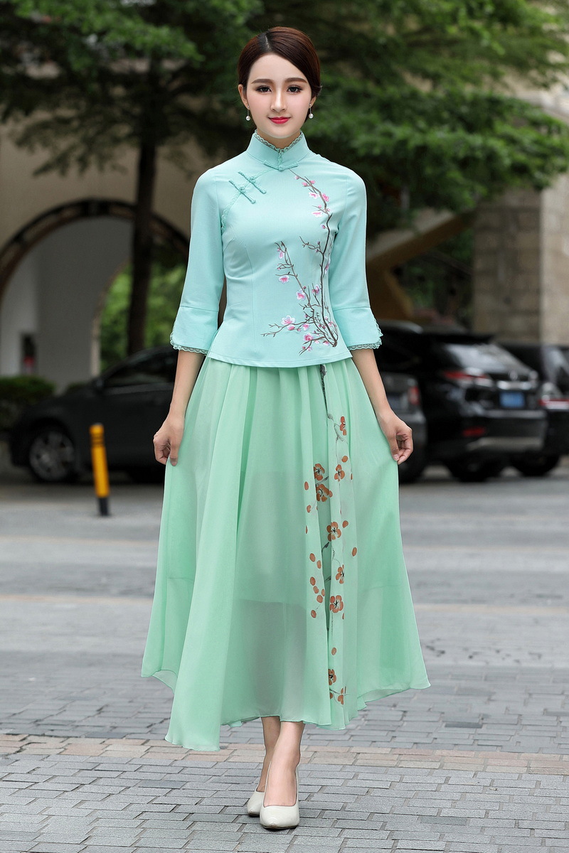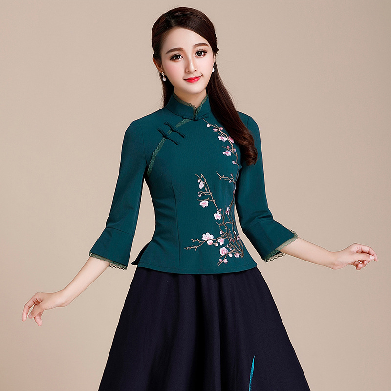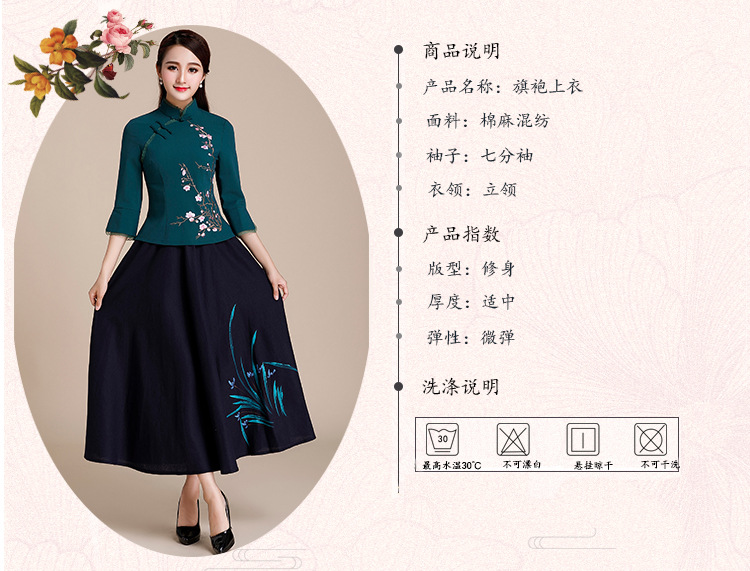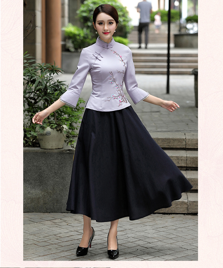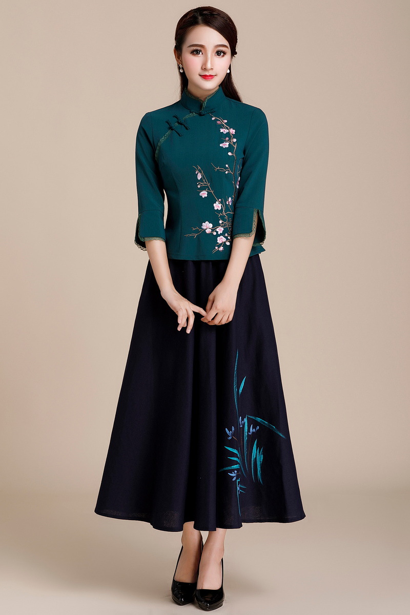 春夏中式大码女装典雅日常梅花绣花民国风立领旗袍款上衣长裙套装