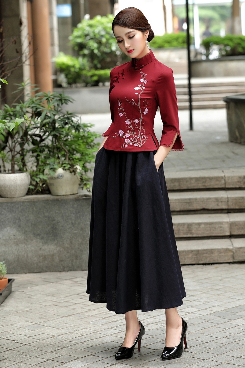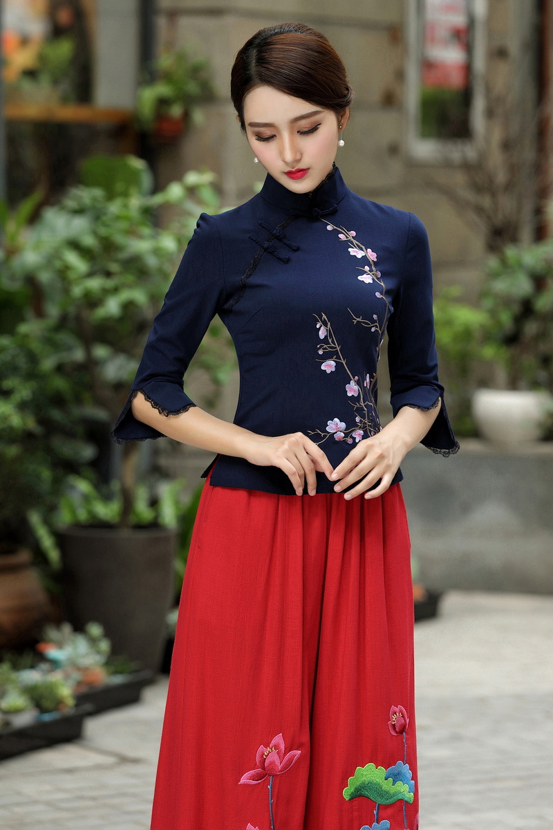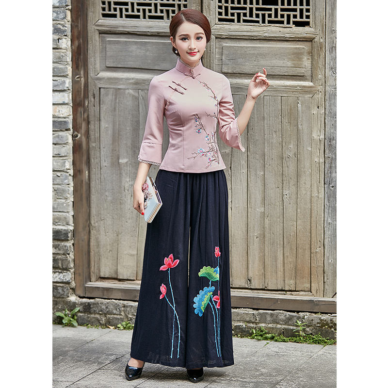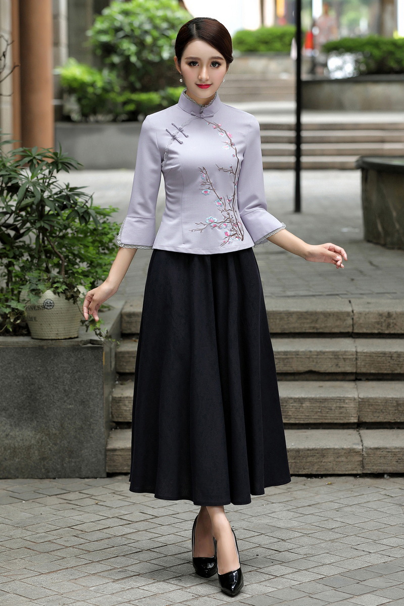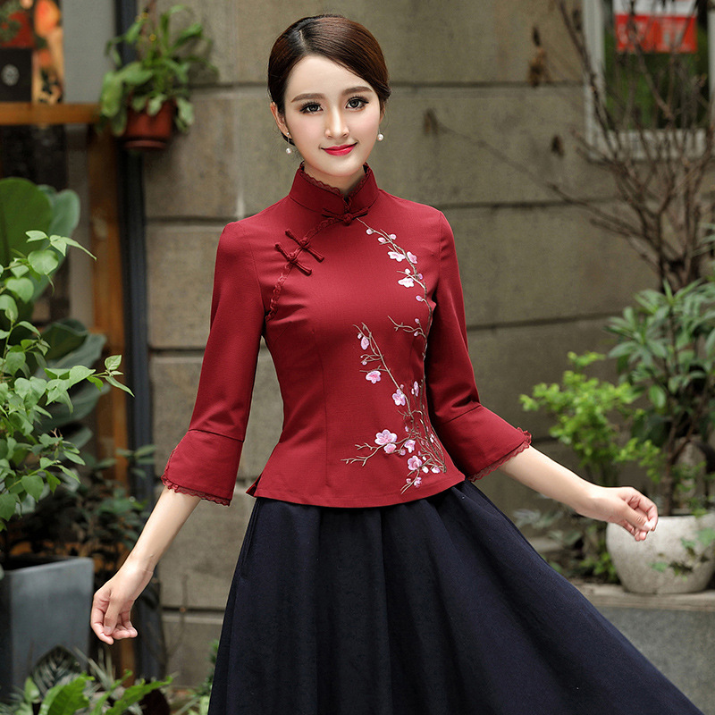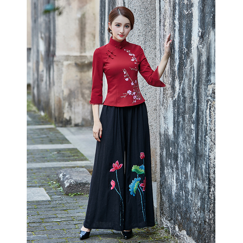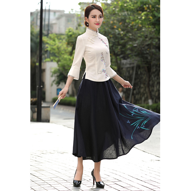 春夏中式大码女装典雅日常梅花绣花民国风立领旗袍款上衣长裙套装
