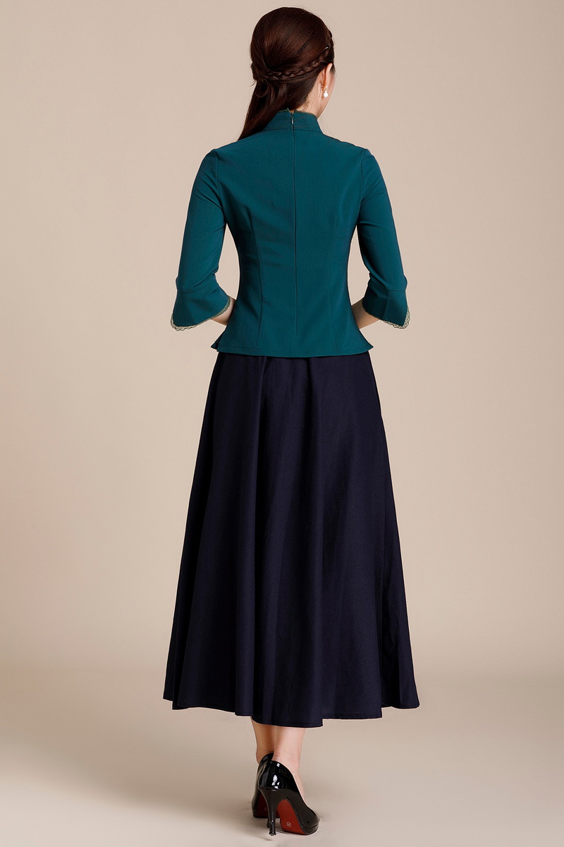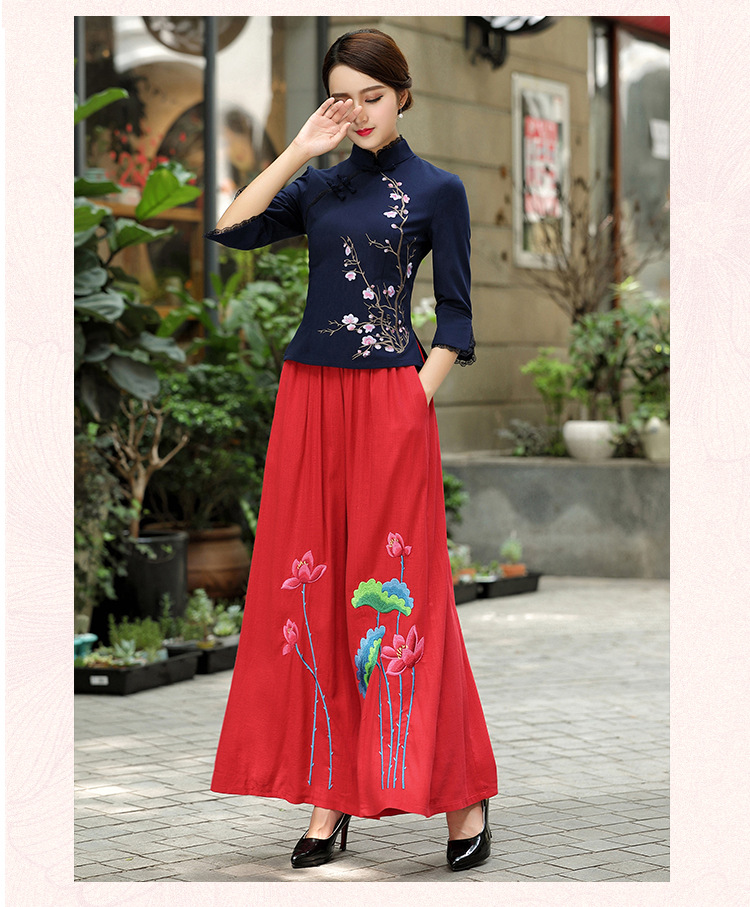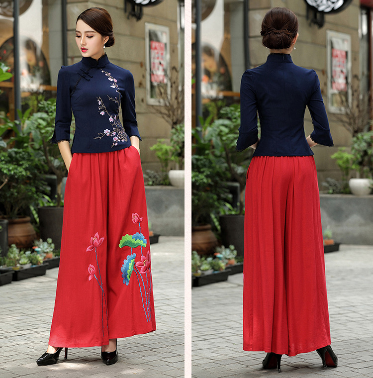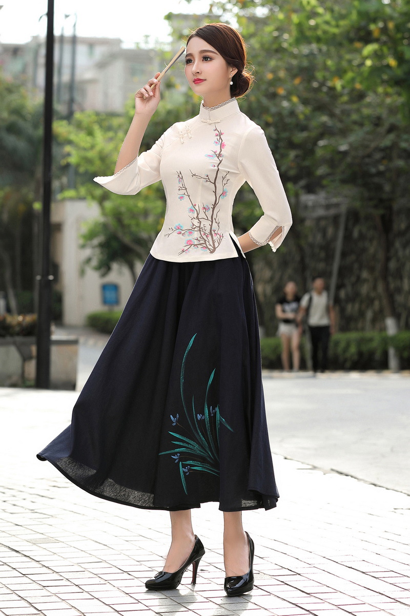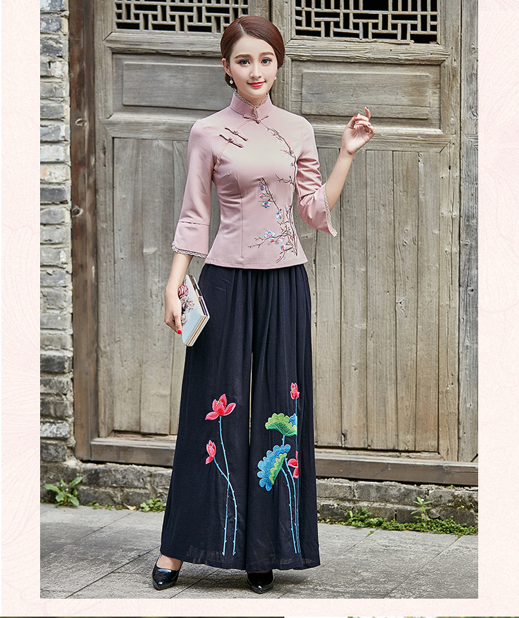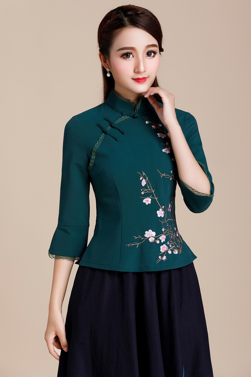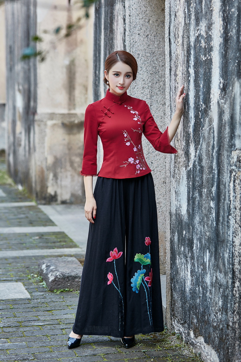 春夏中式大码女装典雅日常梅花绣花民国风立领旗袍款上衣长裙套装