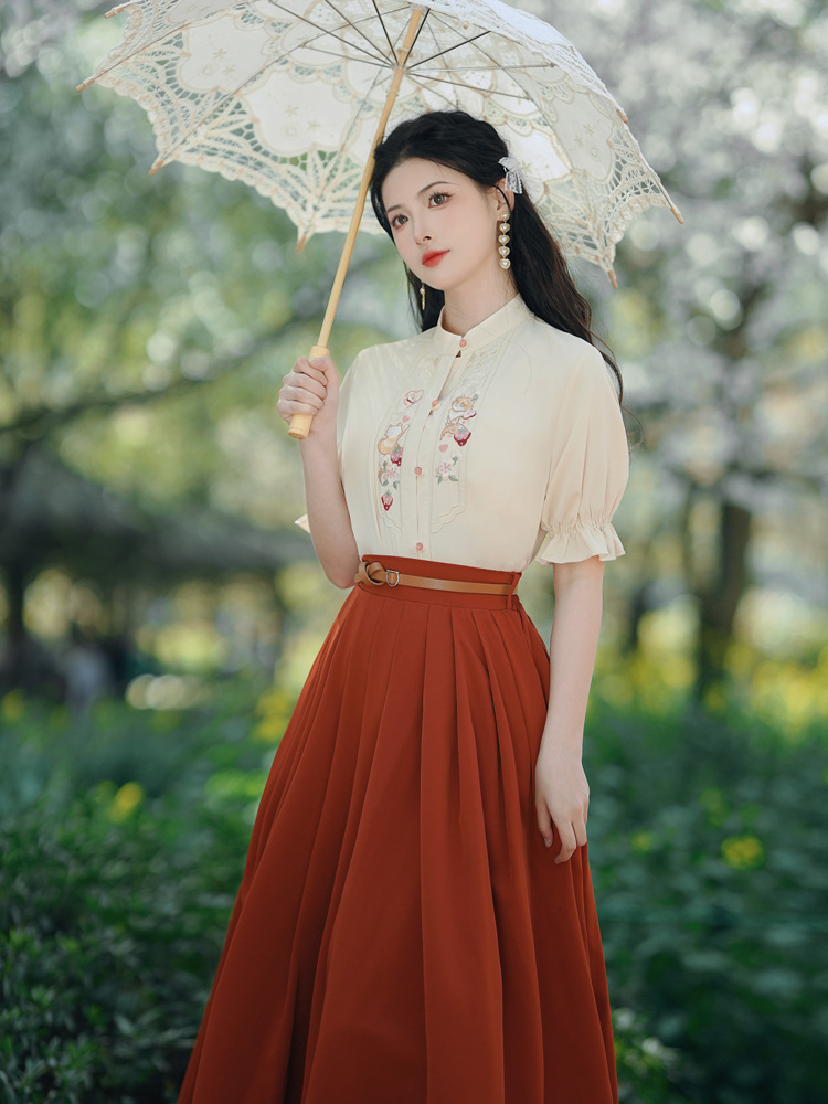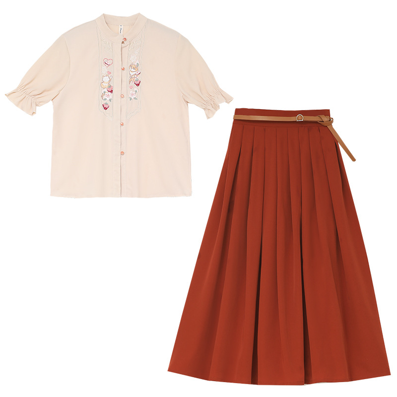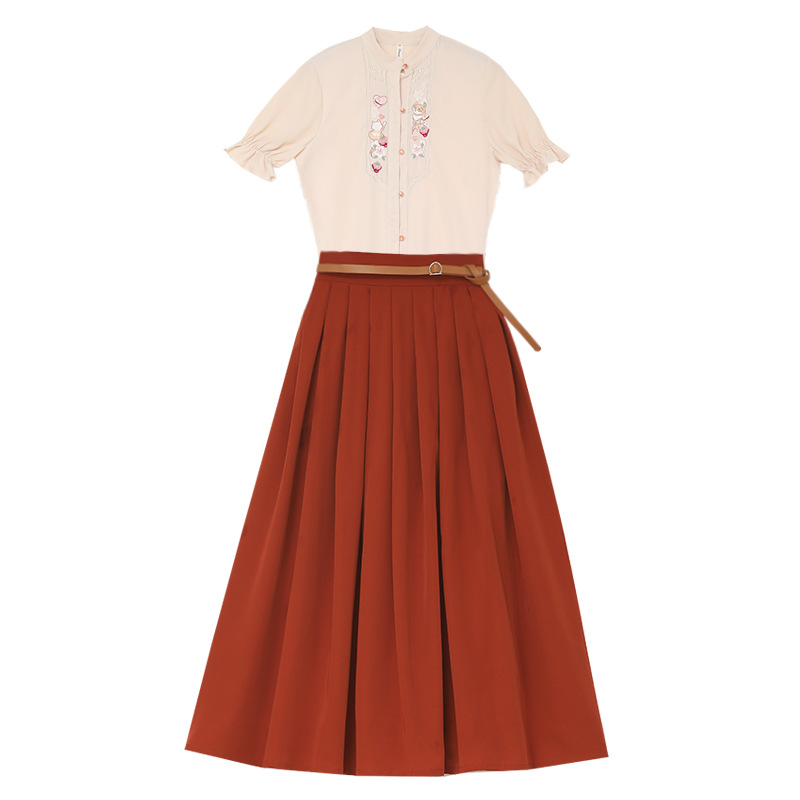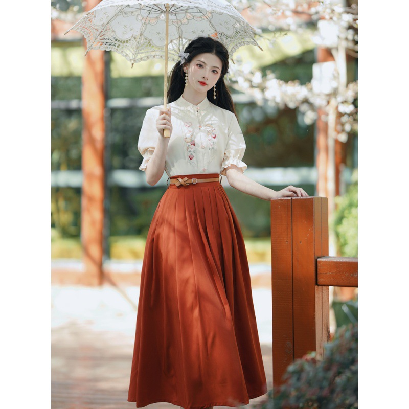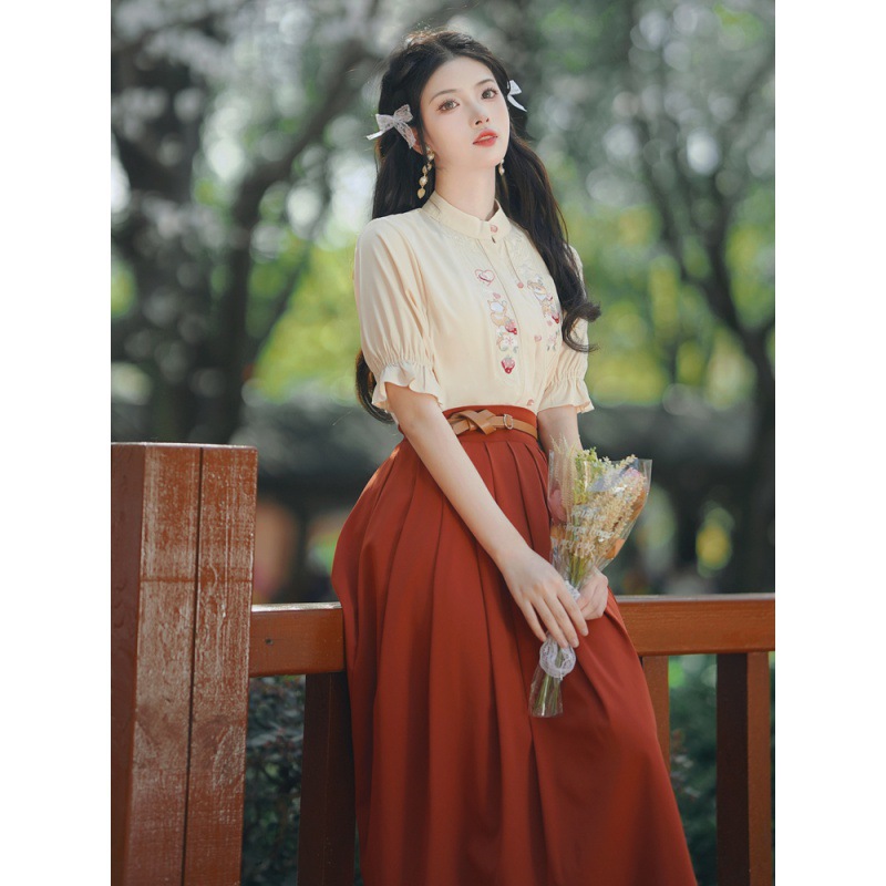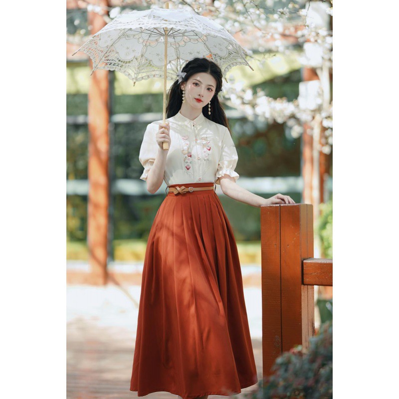 春夏新款新中式日常裙子女汉元素复古风国风绣花短袖上衣+半裙套