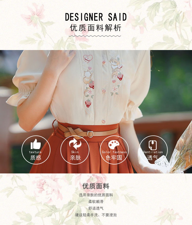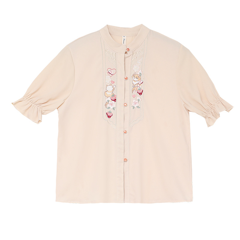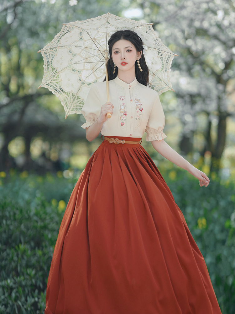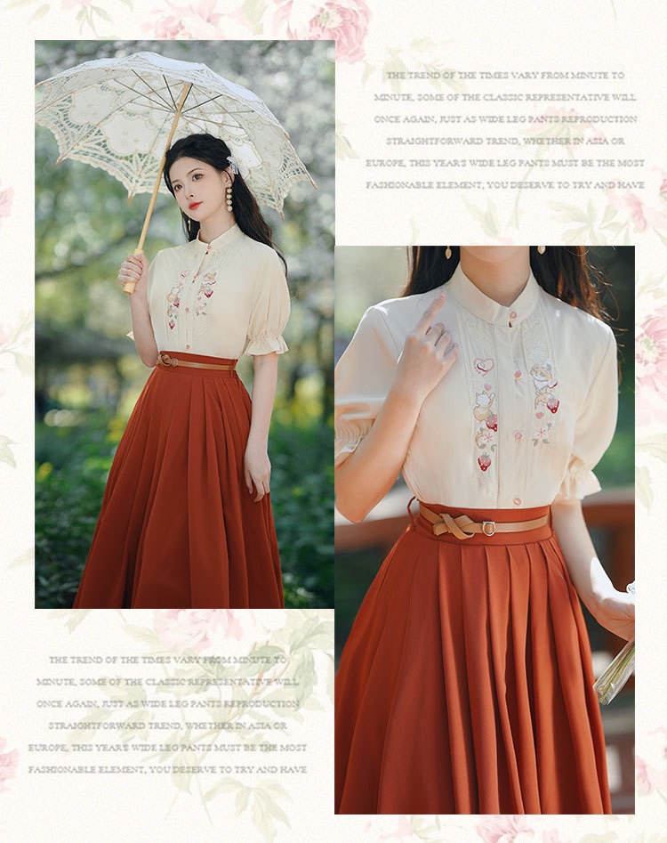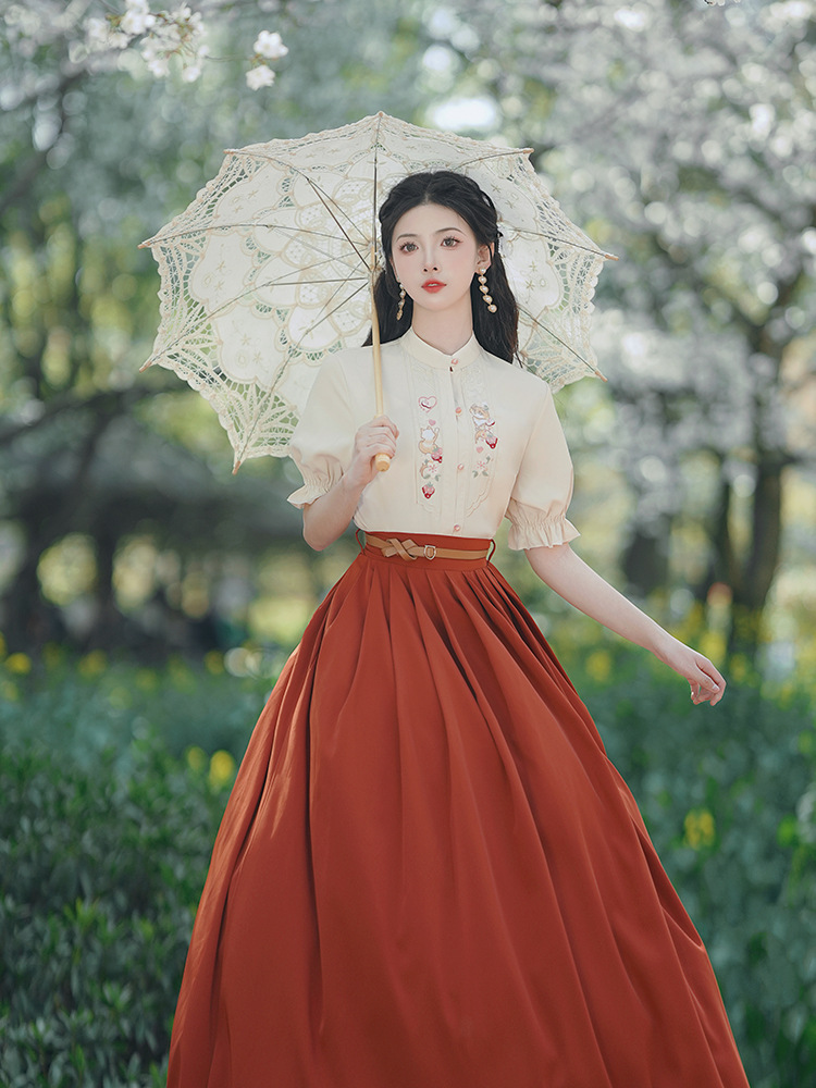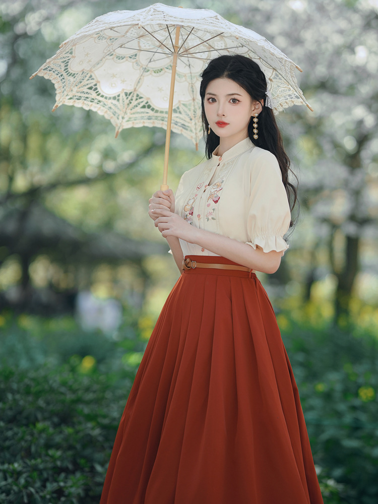 春夏新款新中式日常裙子女汉元素复古风国风绣花短袖上衣+半裙套