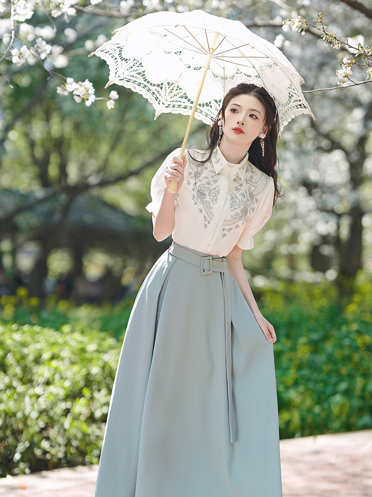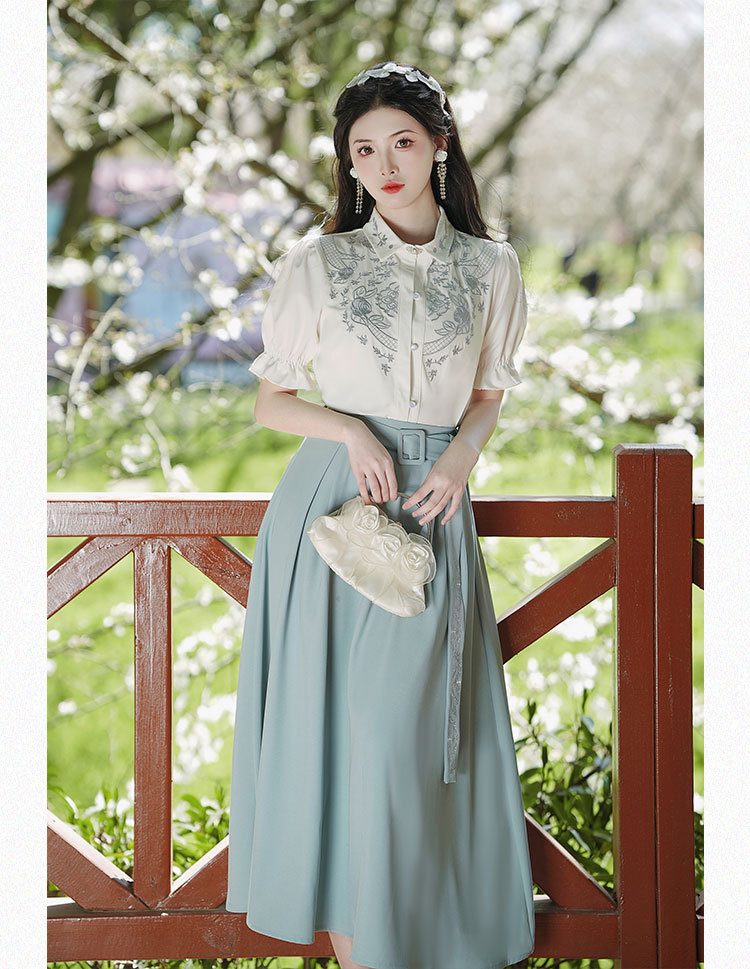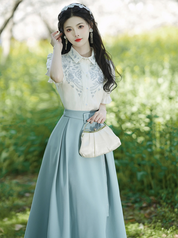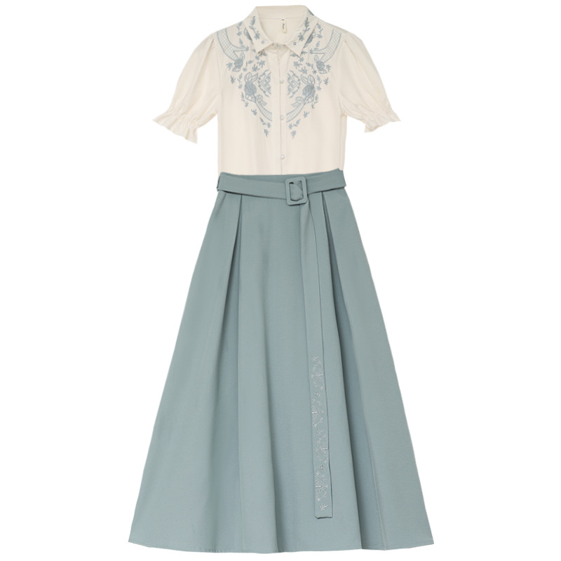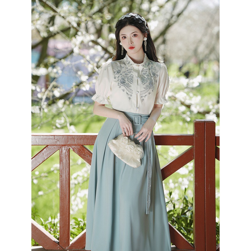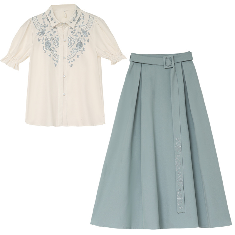 春夏新款新中式女士复古风汉元素复古风国风绣花上衣+半裙套装