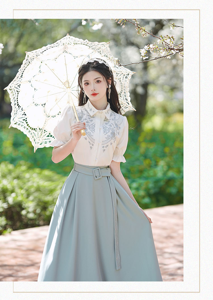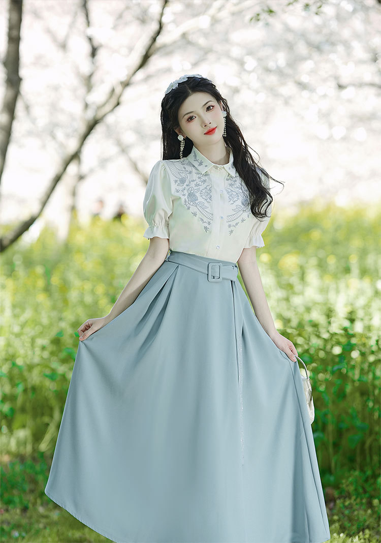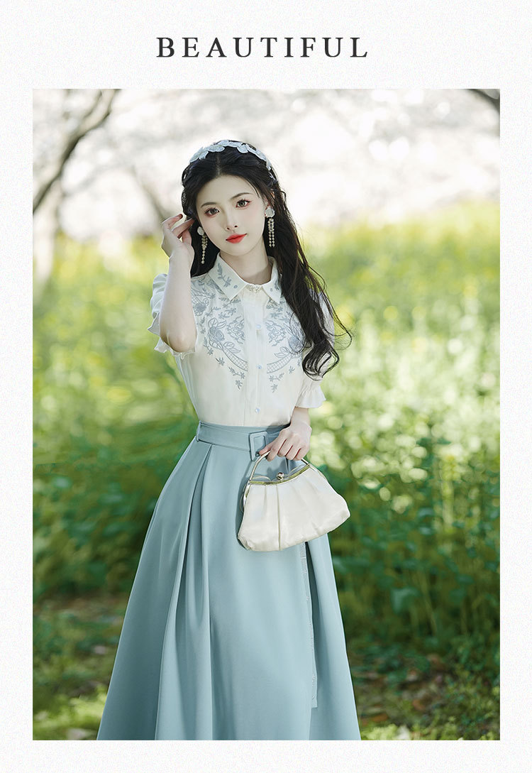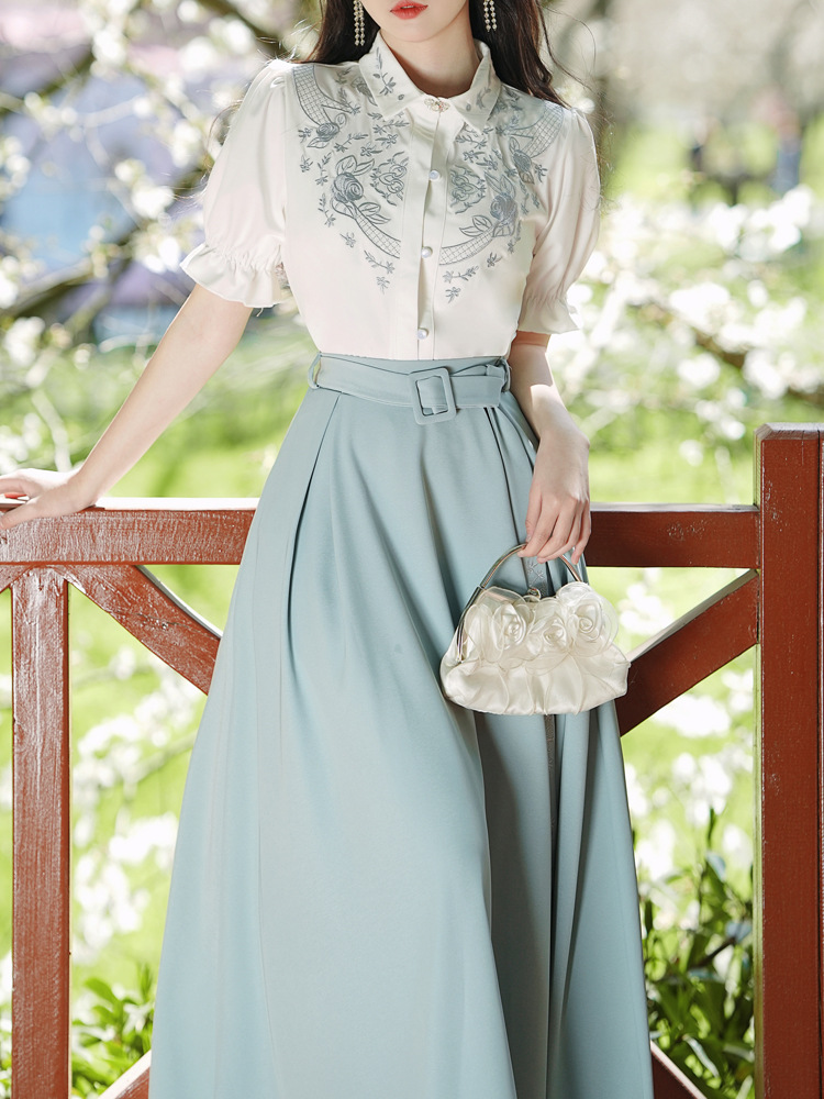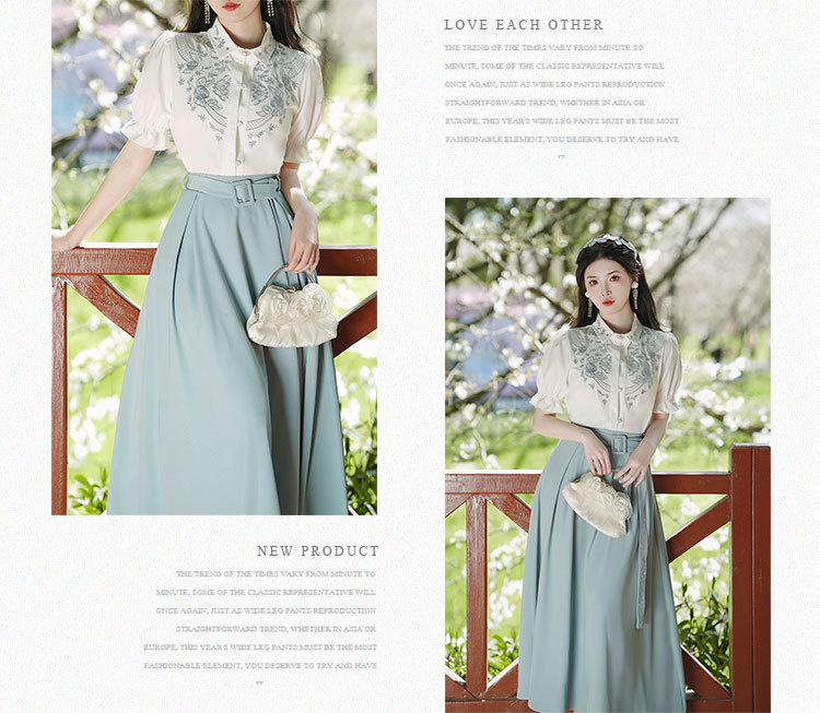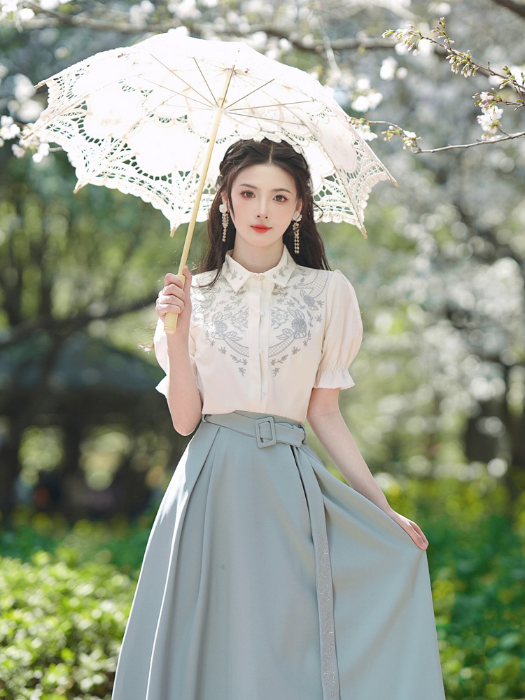 春夏新款新中式女士复古风汉元素复古风国风绣花上衣+半裙套装