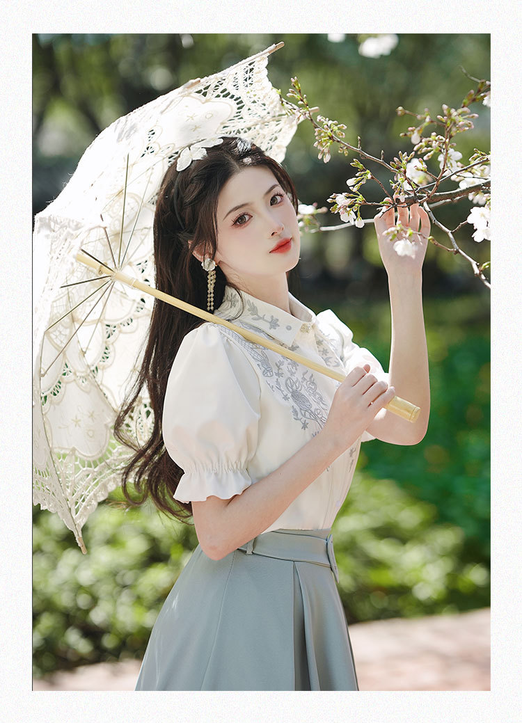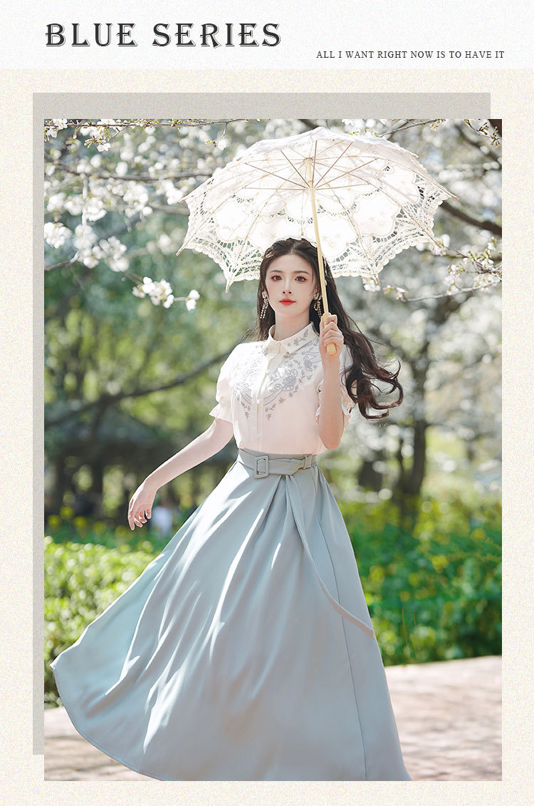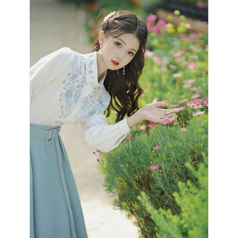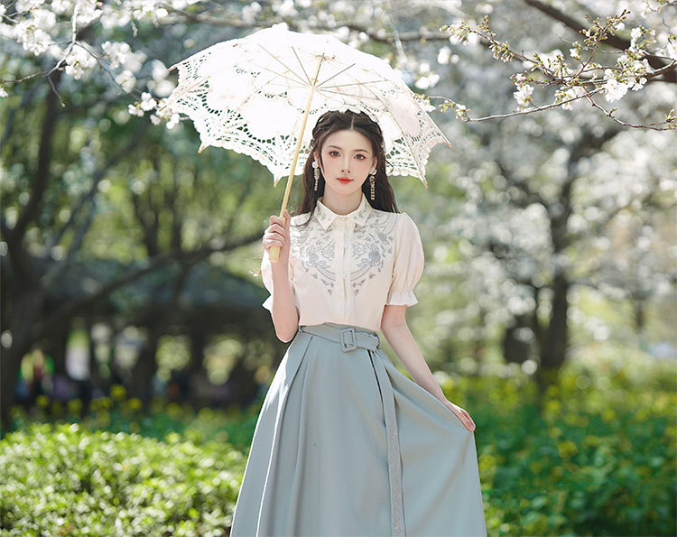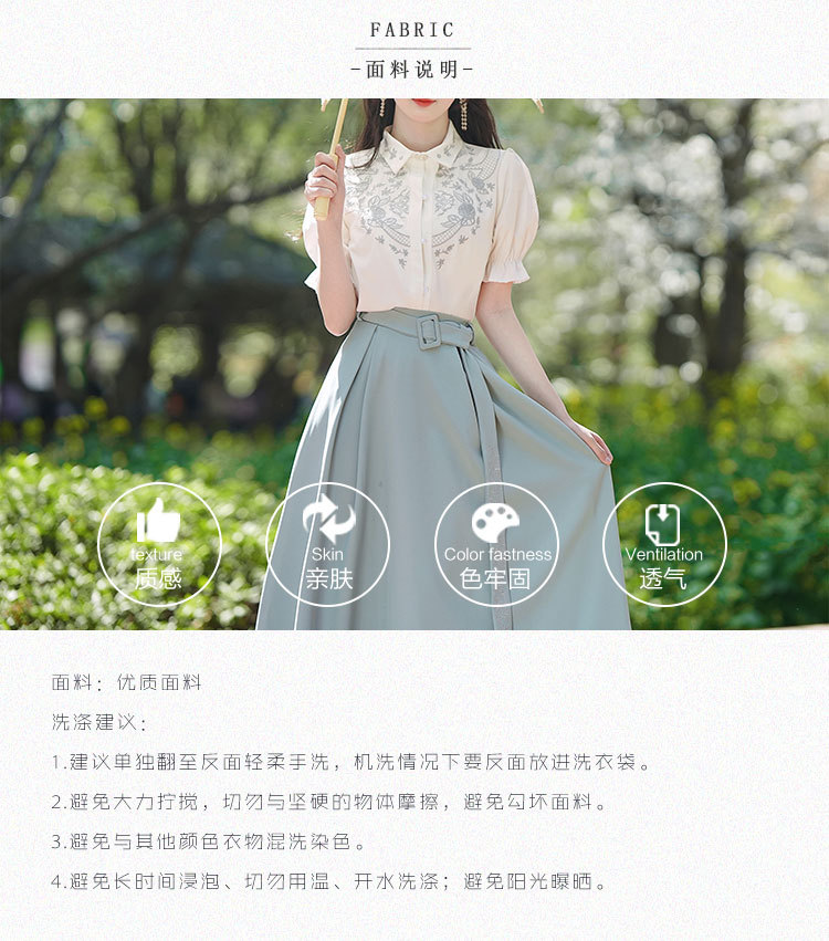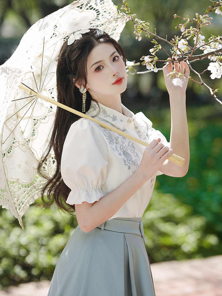 春夏新款新中式女士复古风汉元素复古风国风绣花上衣+半裙套装