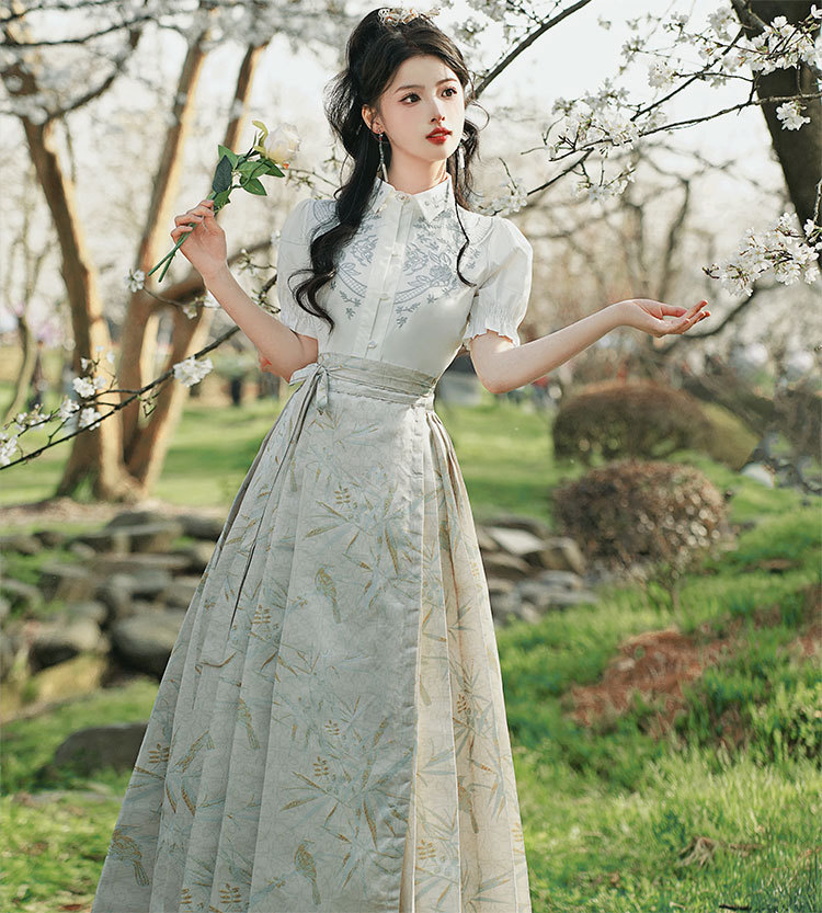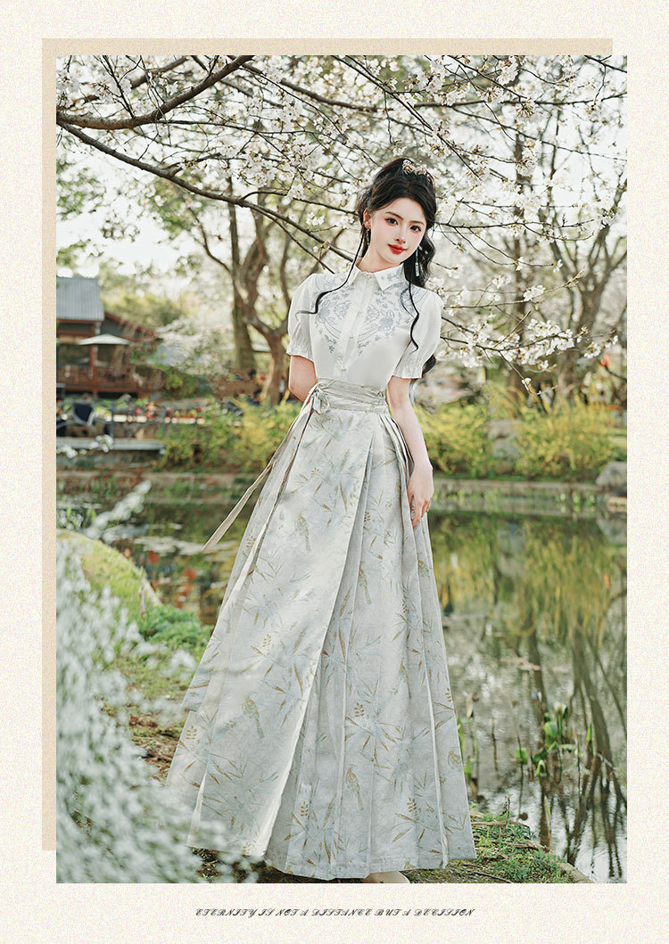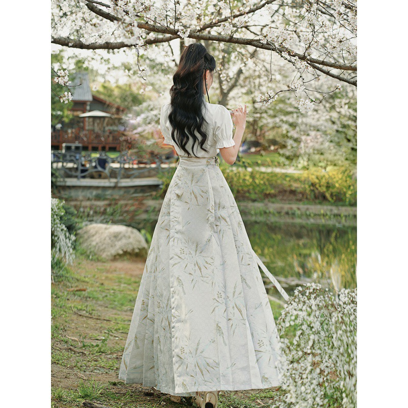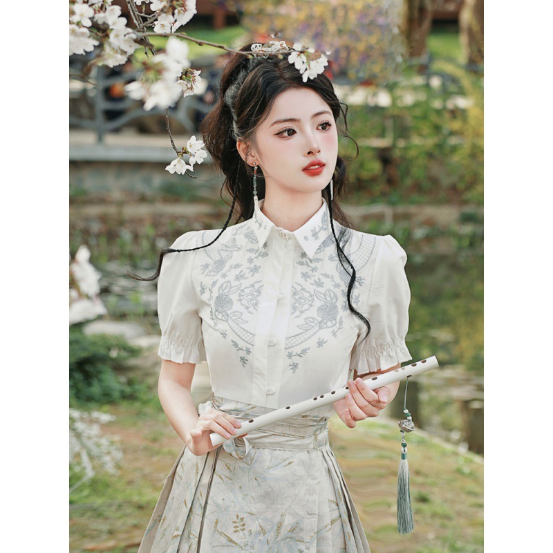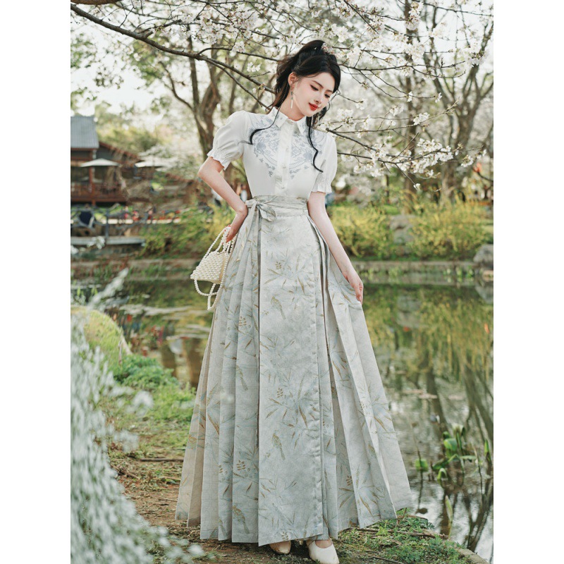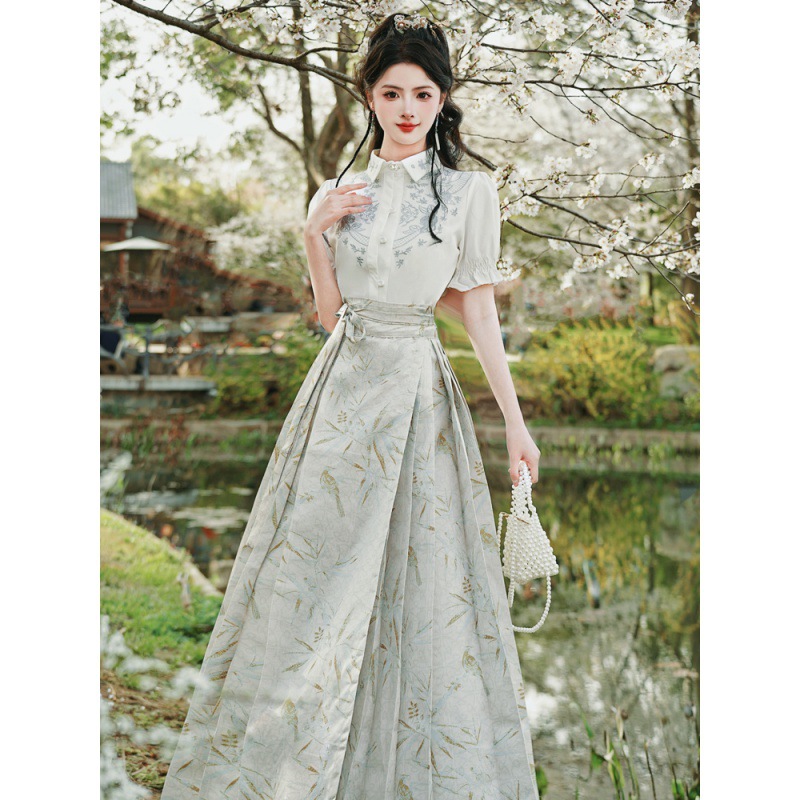中国风汉服春夏新款新中式女士汉元素刺绣花短袖+烫金线马面裙套