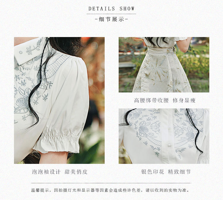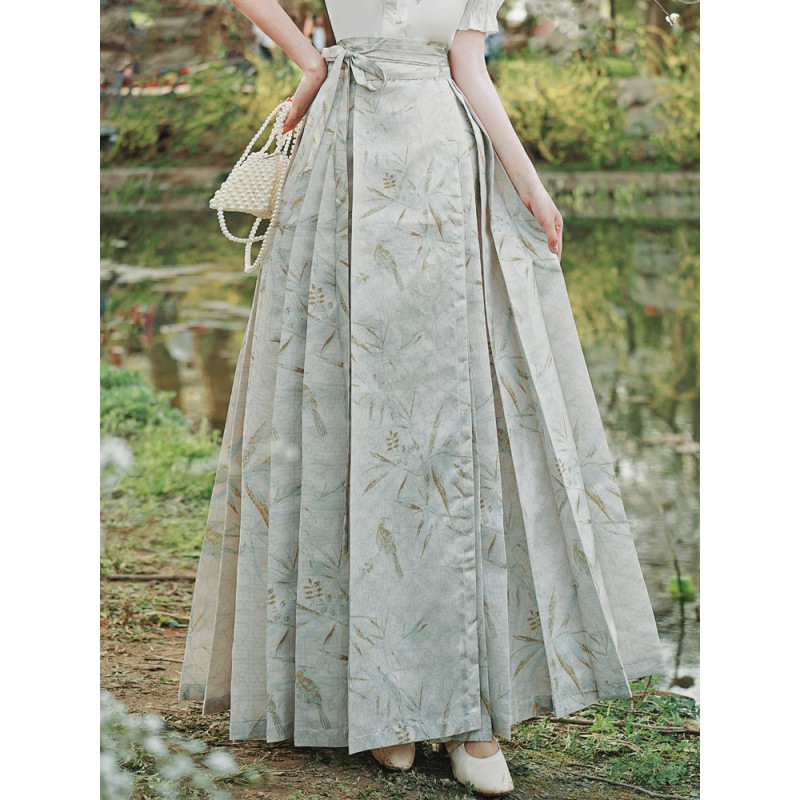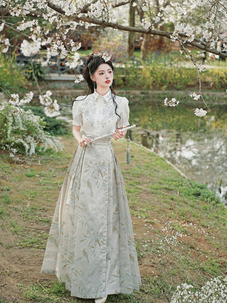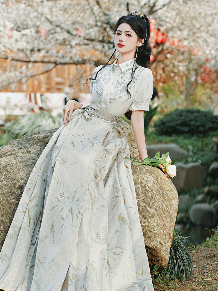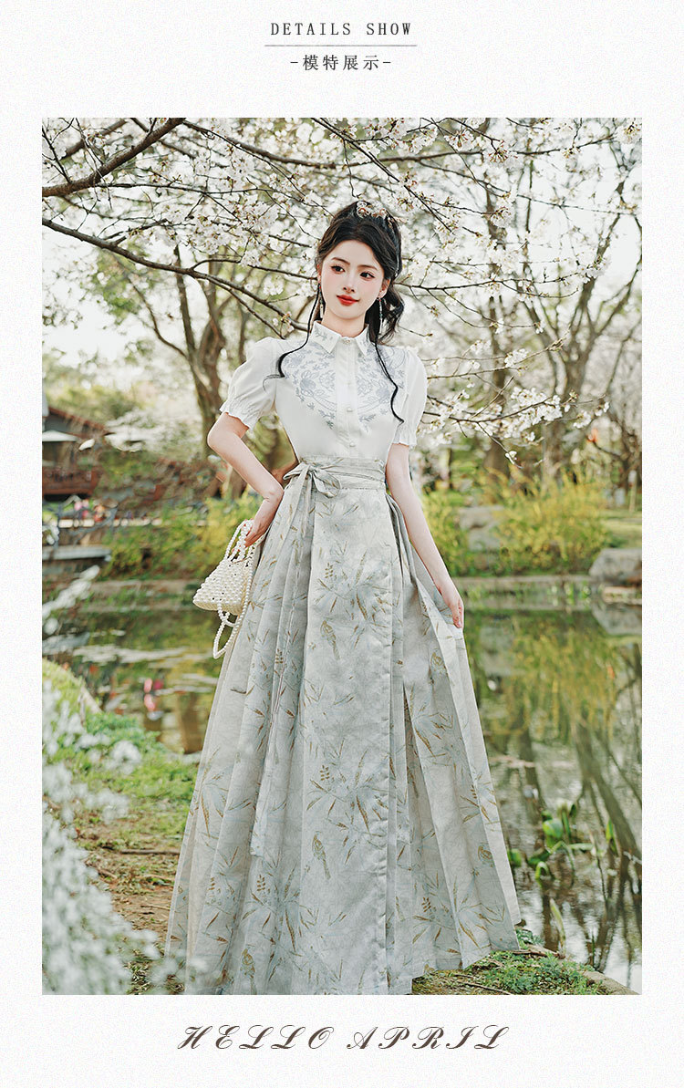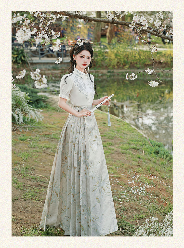 中国风汉服春夏新款新中式女士汉元素刺绣花短袖+烫金线马面裙套