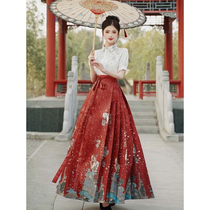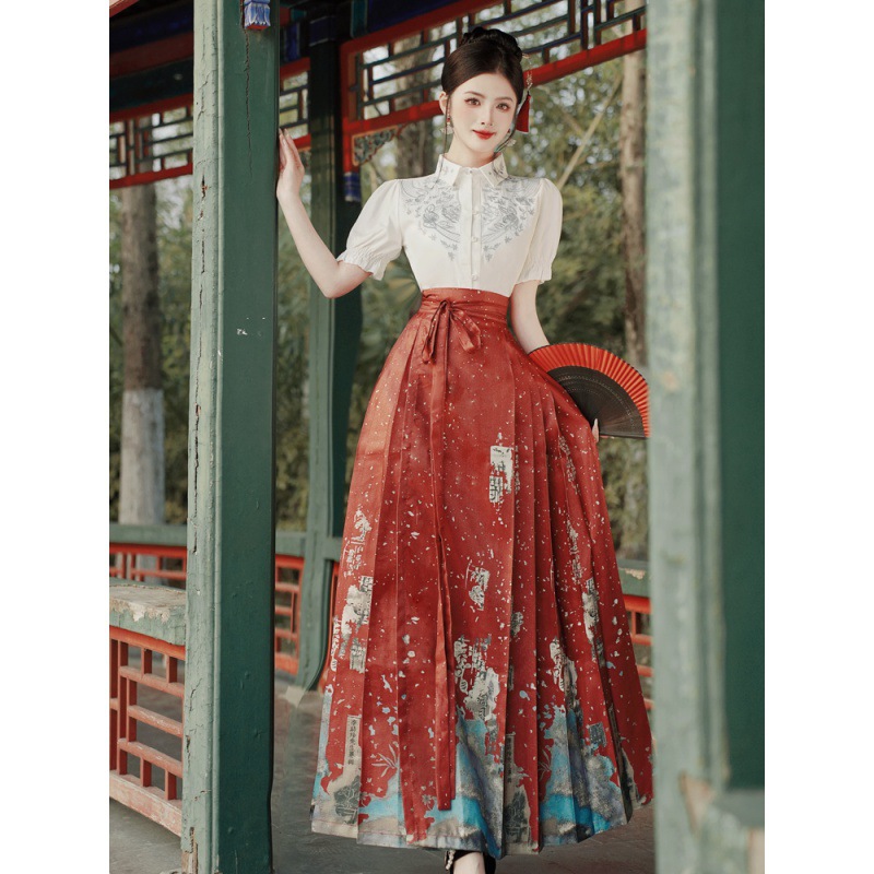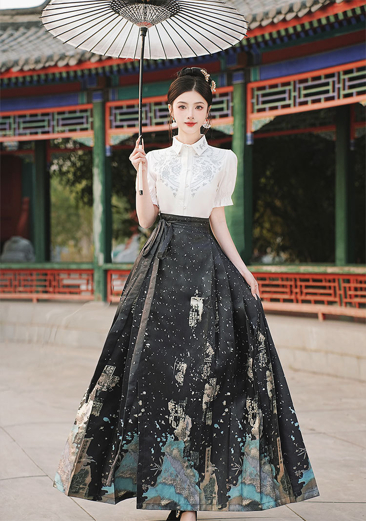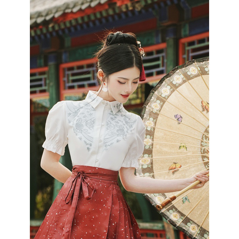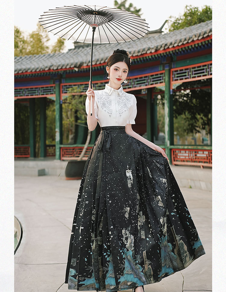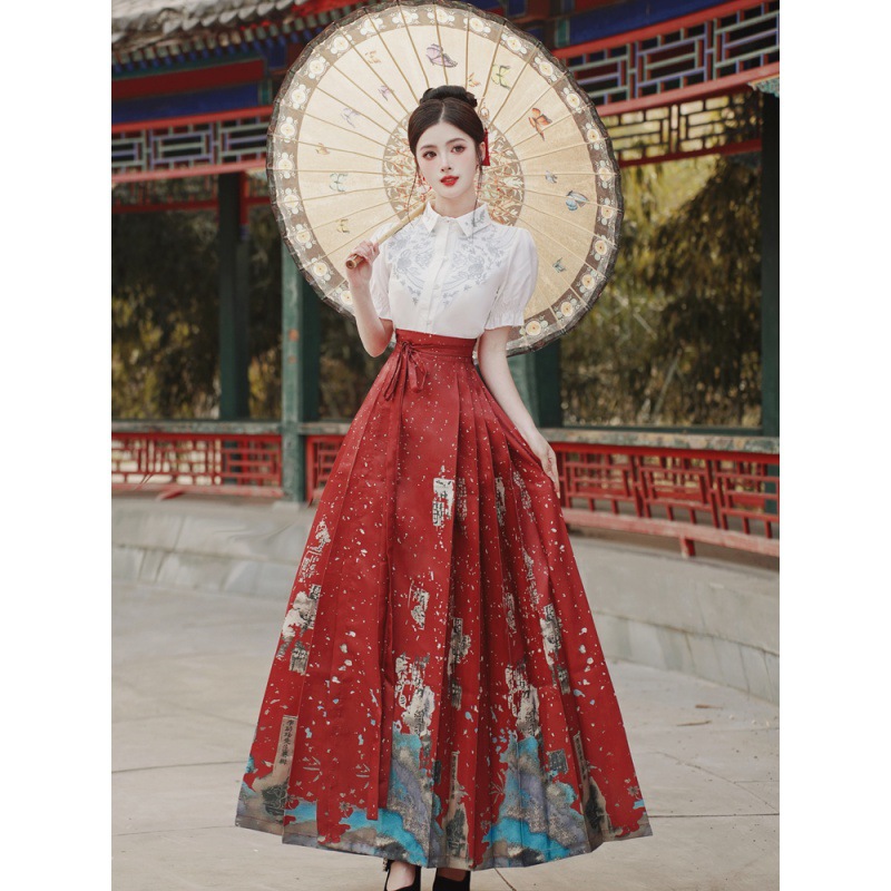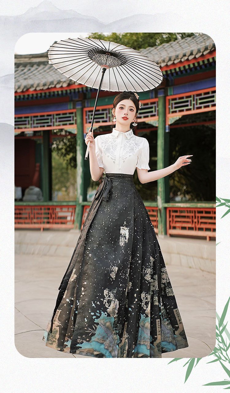 中国风汉服汉元素新中式女士春夏绣花短袖上衣烫金渐变马面裙套装