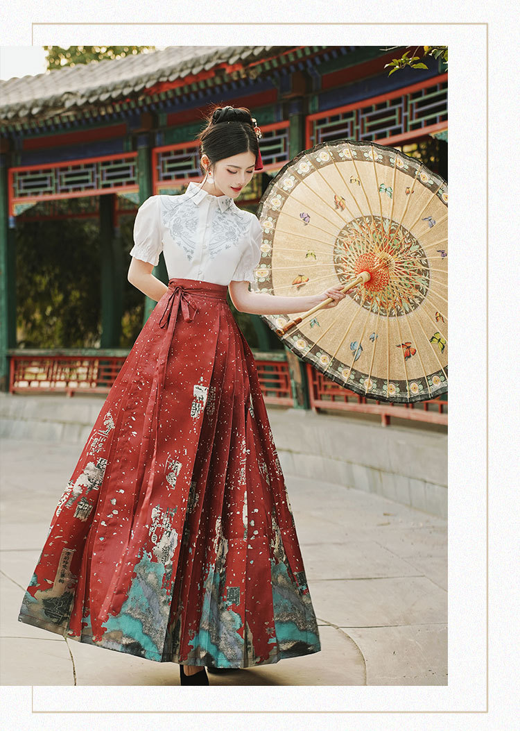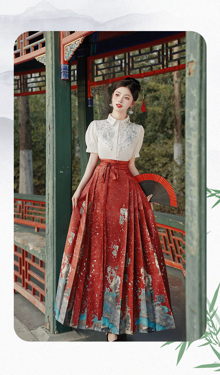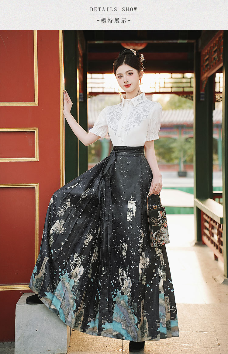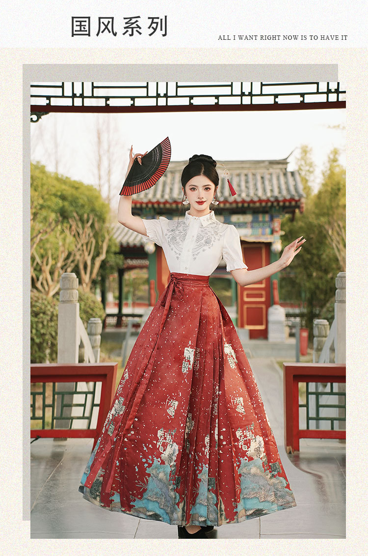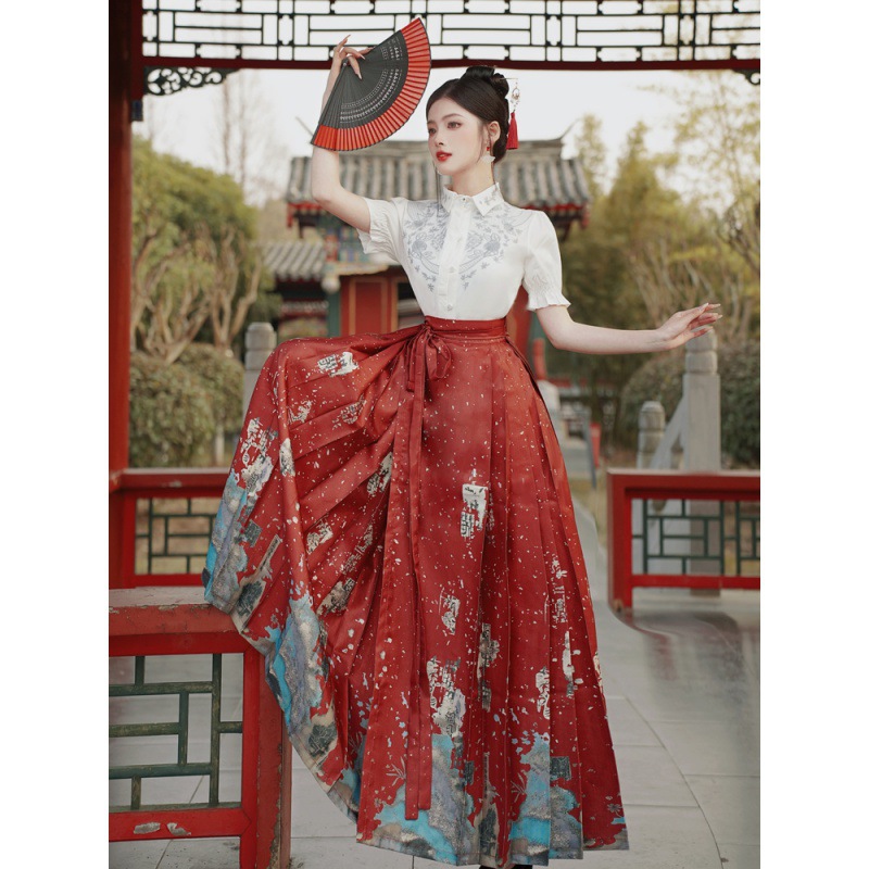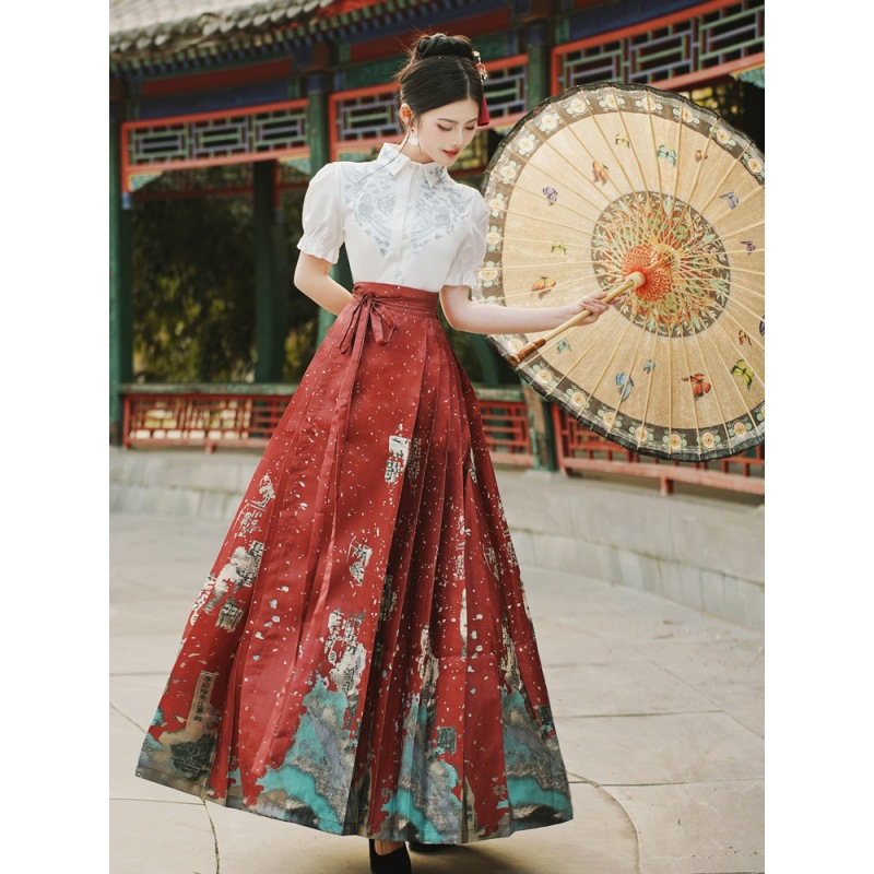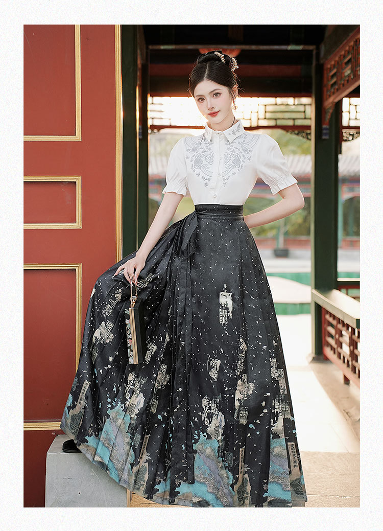 中国风汉服汉元素新中式女士春夏绣花短袖上衣烫金渐变马面裙套装