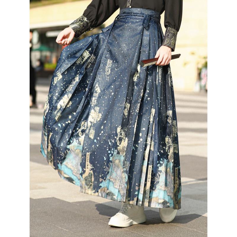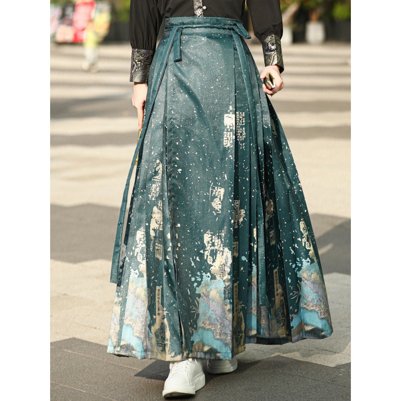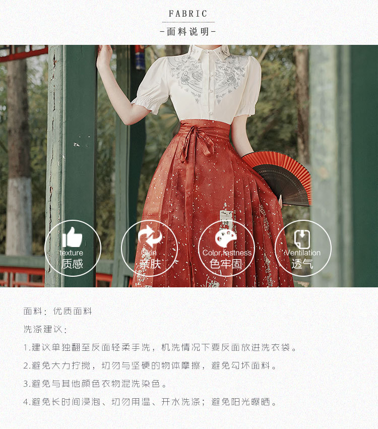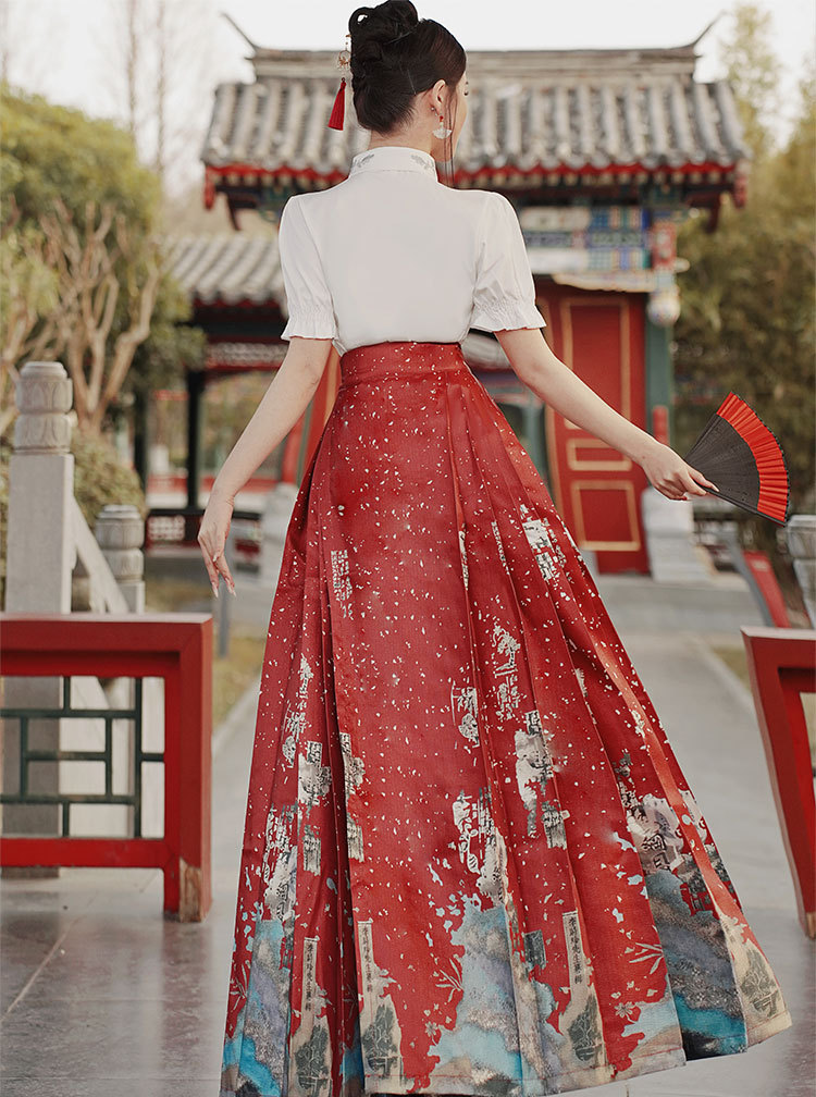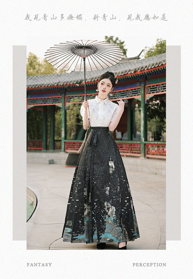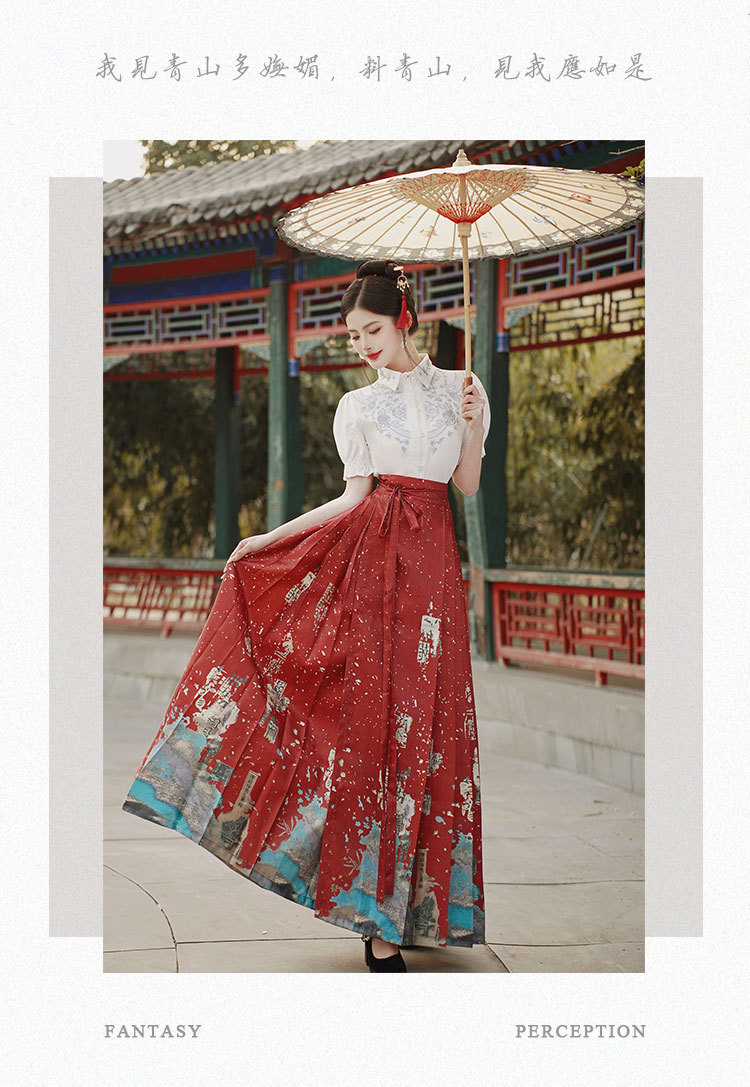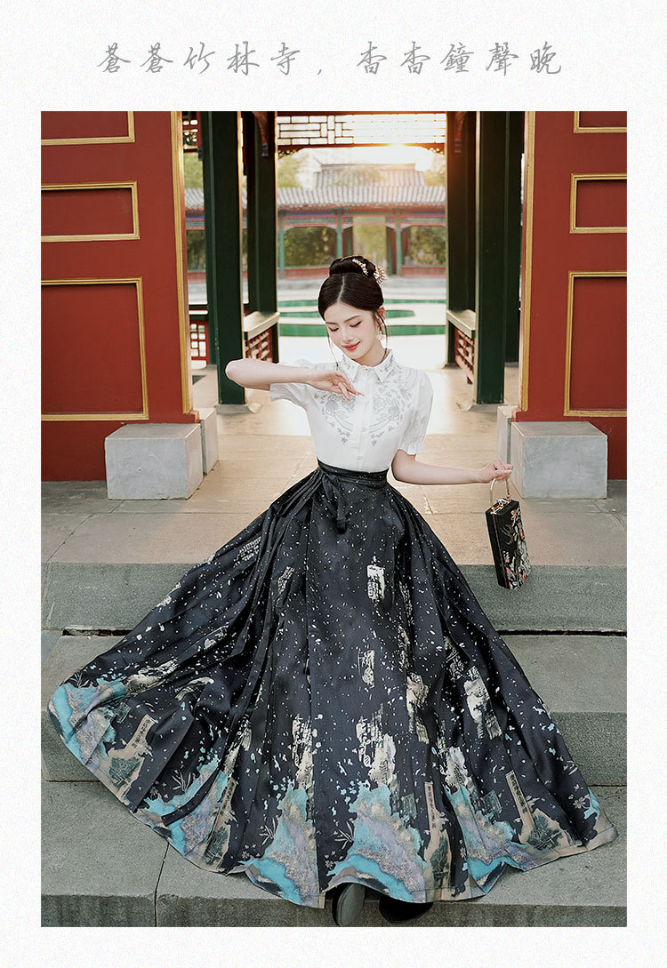中国风汉服汉元素新中式女士春夏绣花短袖上衣烫金渐变马面裙套装