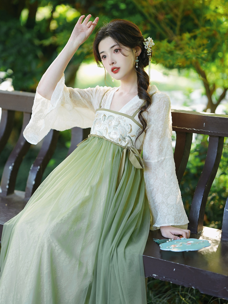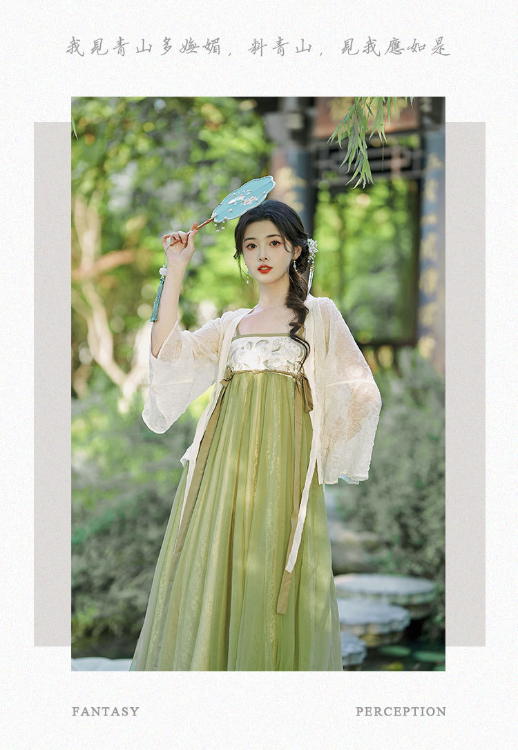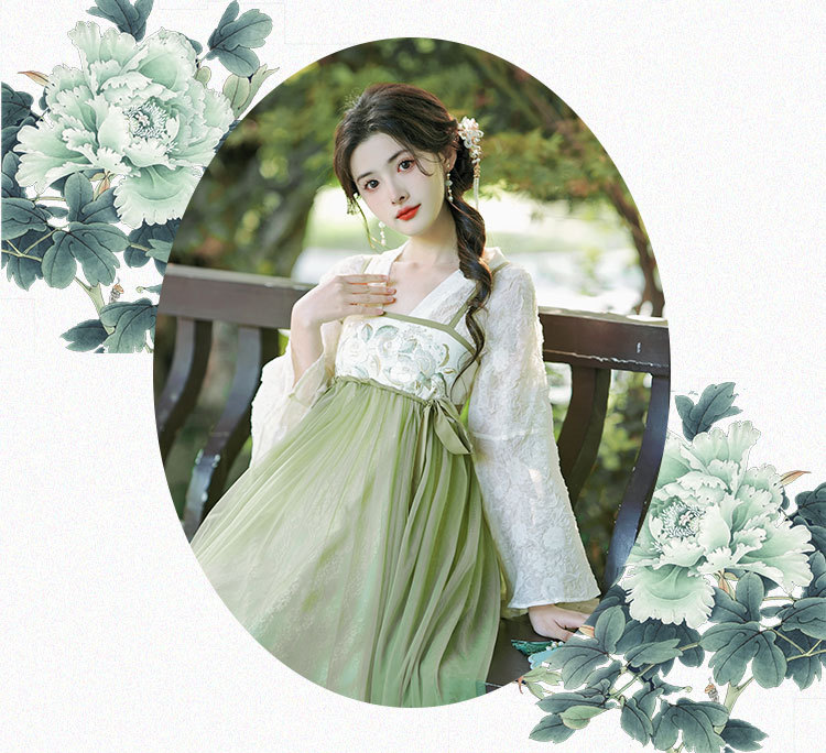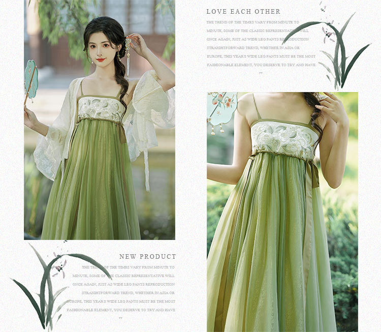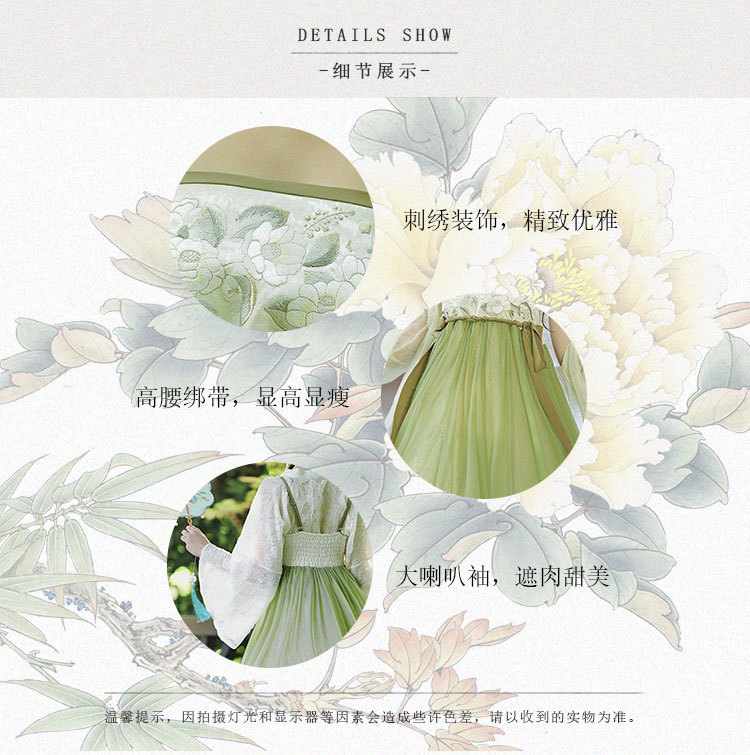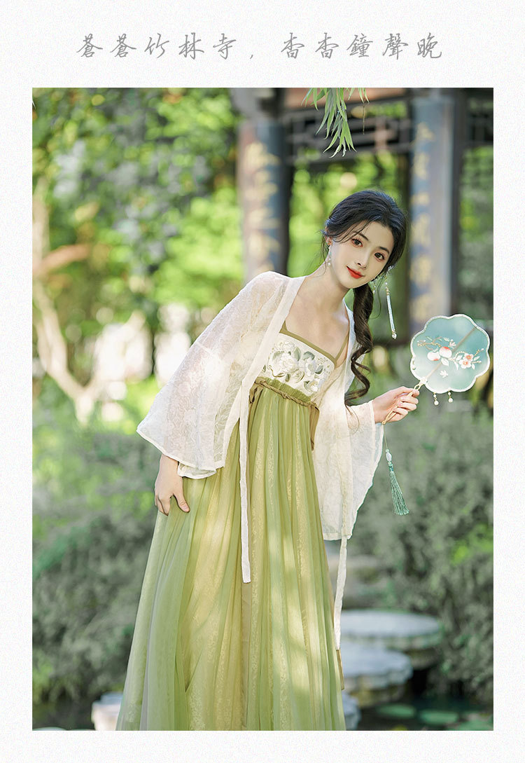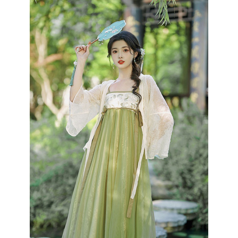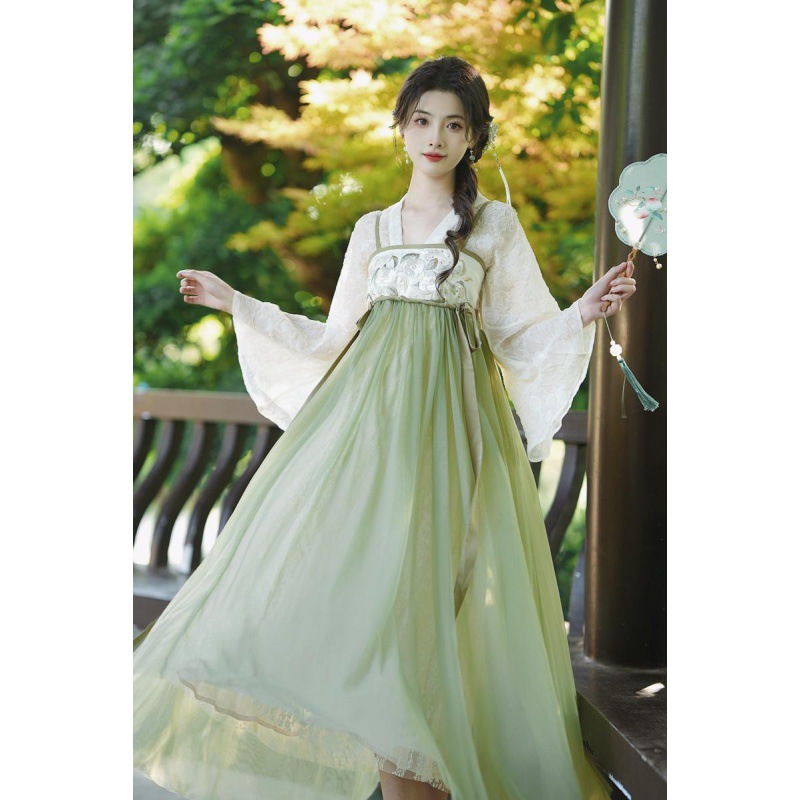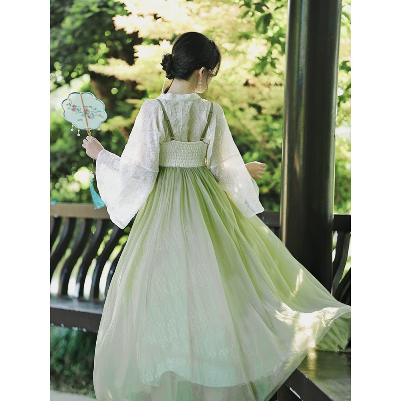 新中式国风汉元素日常小清新淡雅绿色汉服刺绣花连衣裙+开衫套装