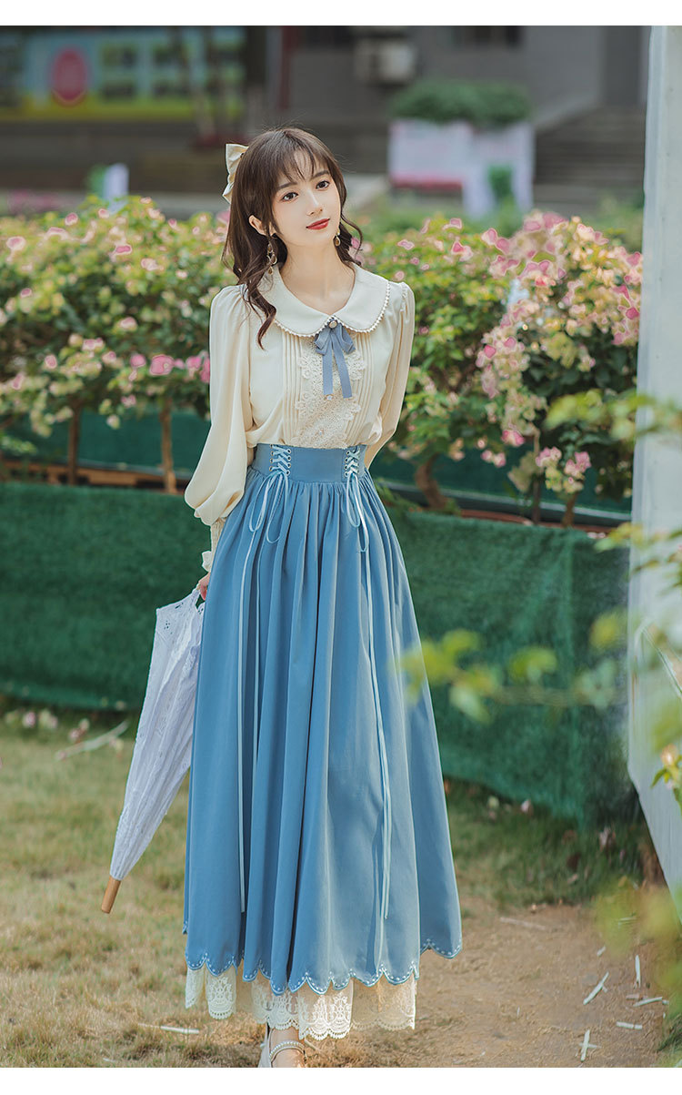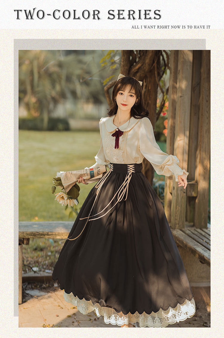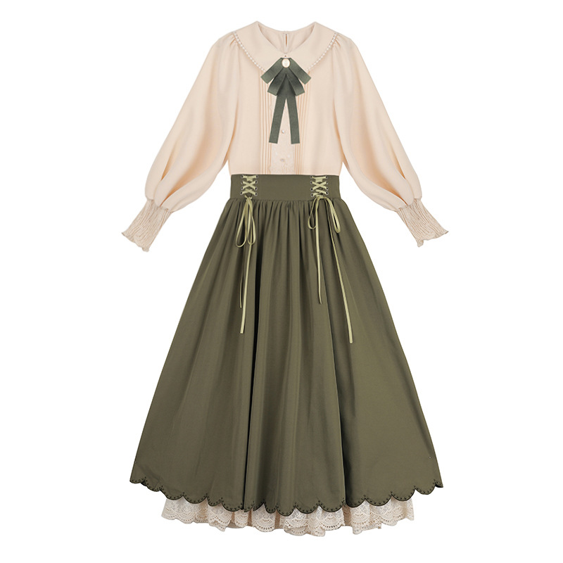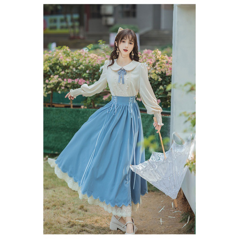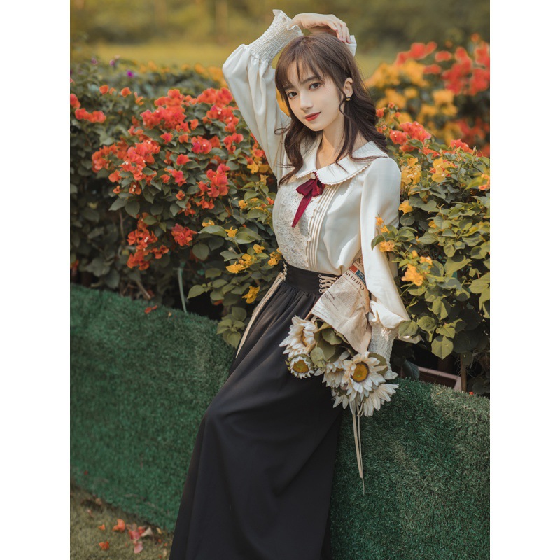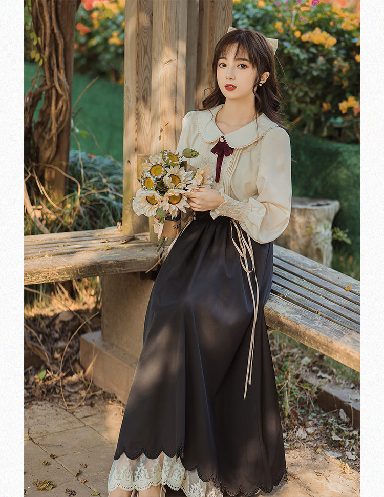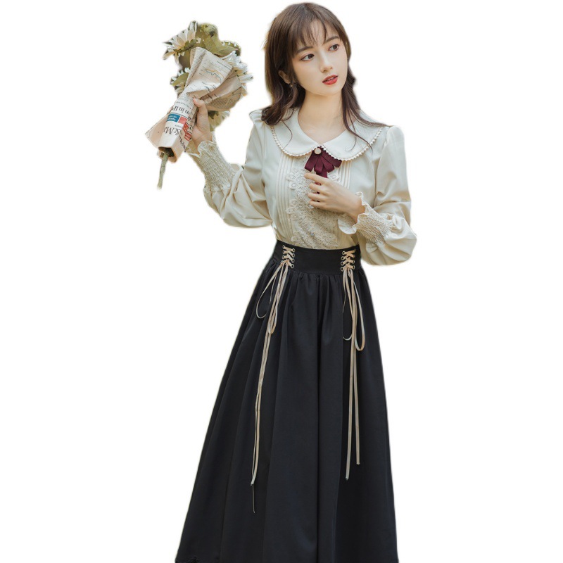新中式女装国风实拍多色春装复古学院风长袖绣花高腰茶歇裙连衣裙