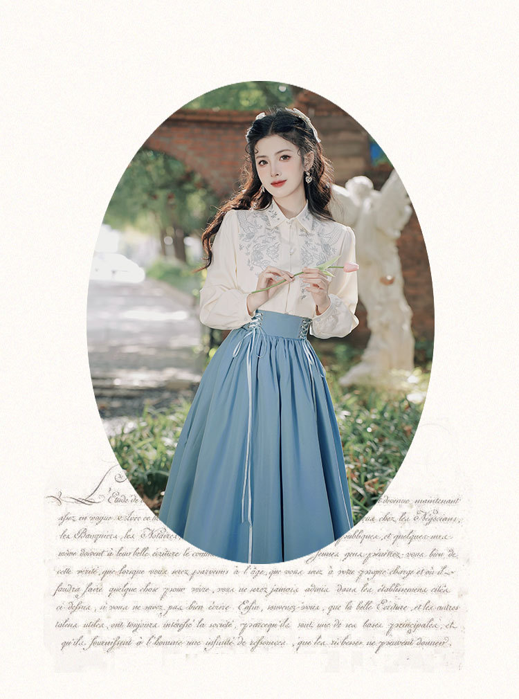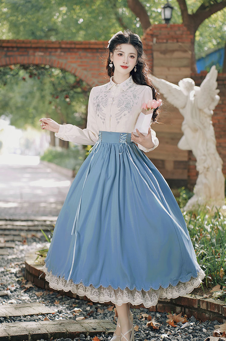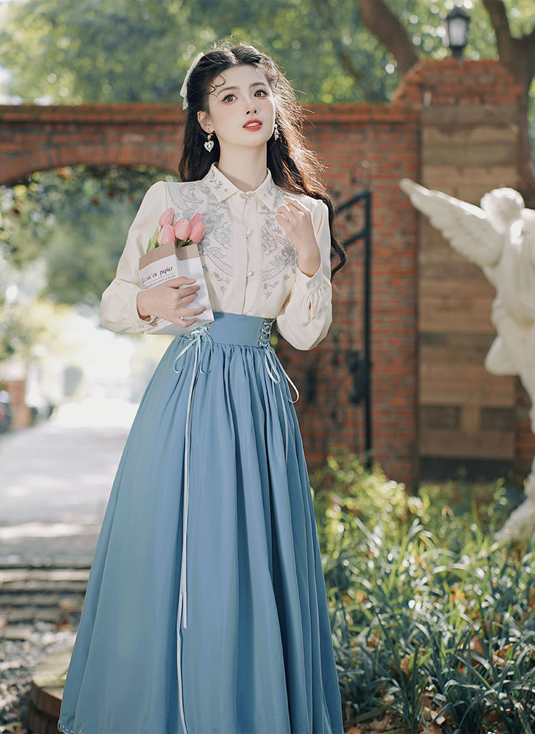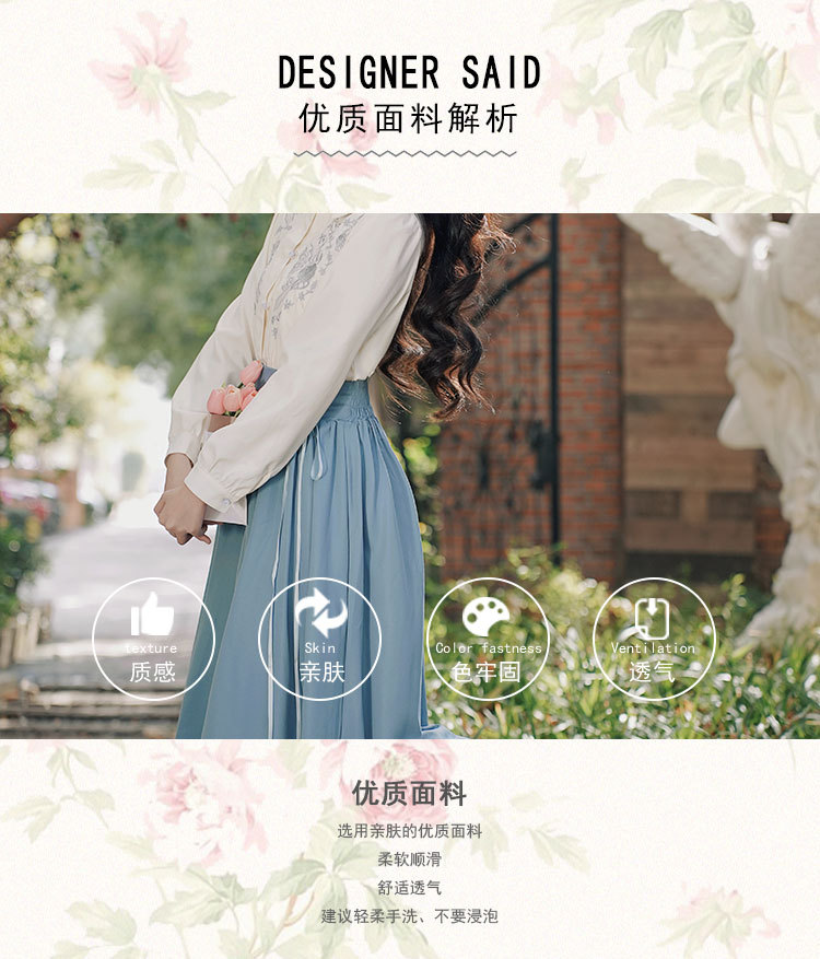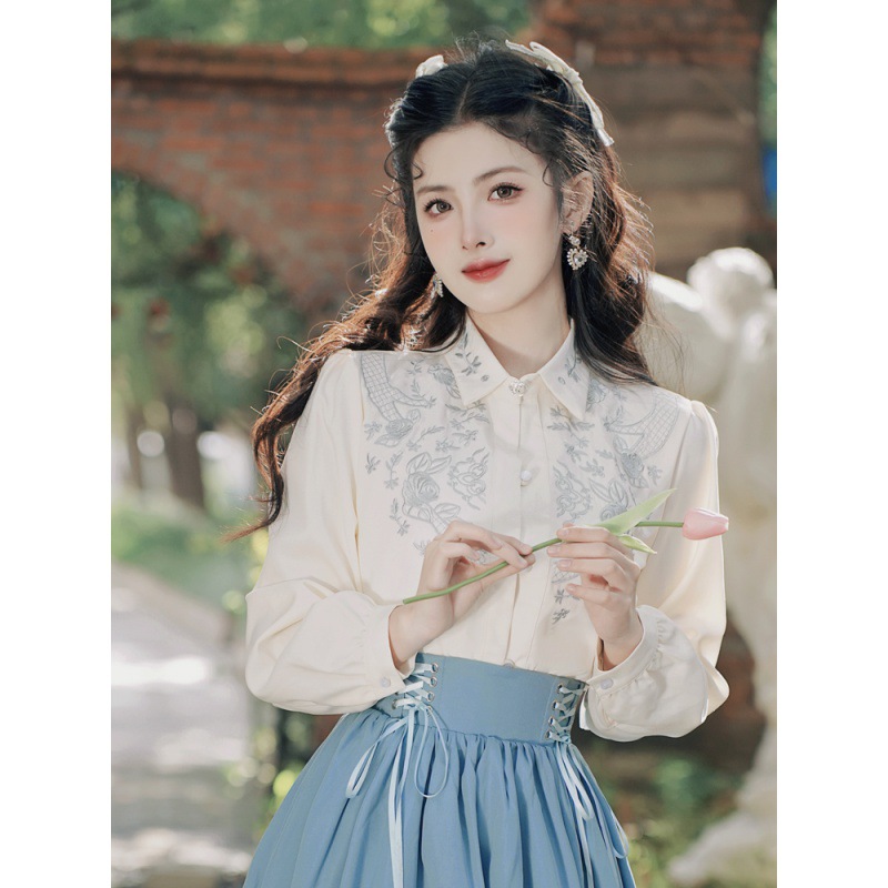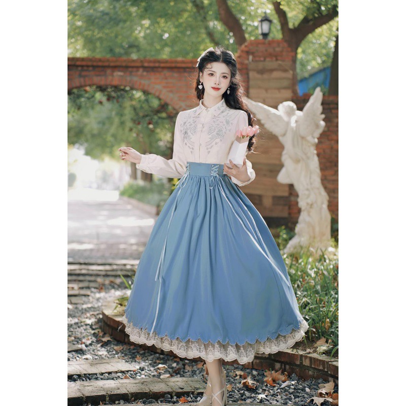 新中式女装国风新款春装复古文艺森女国风绣花长袖+绣花大摆拼蕾