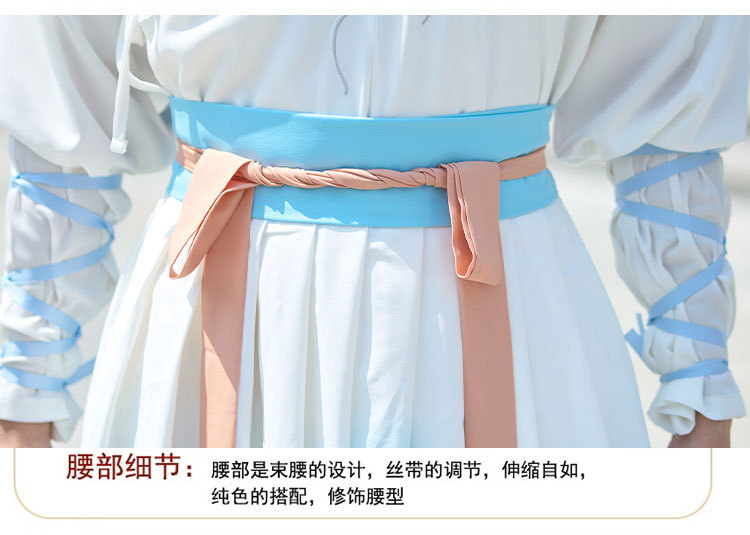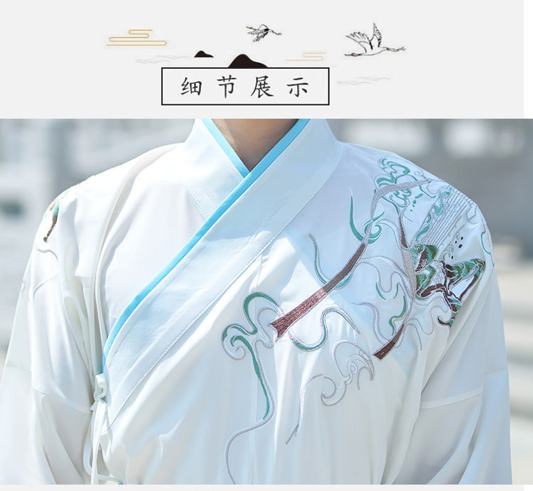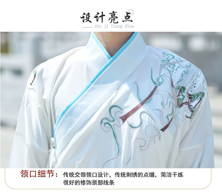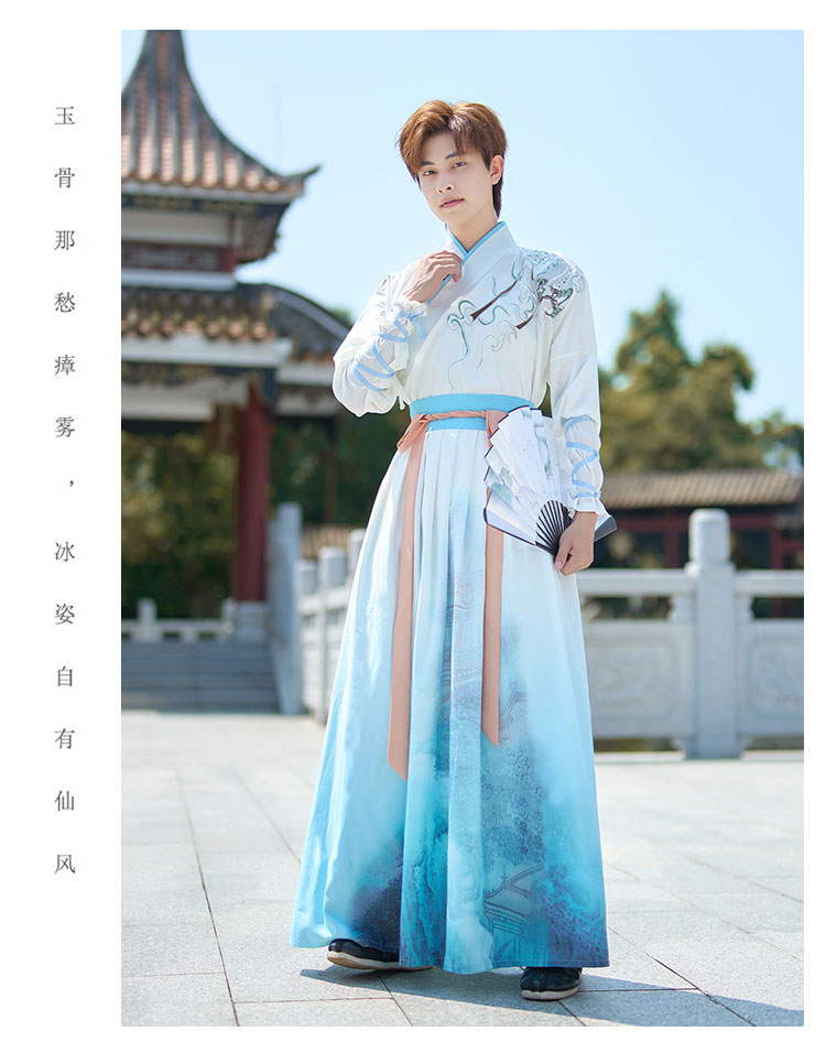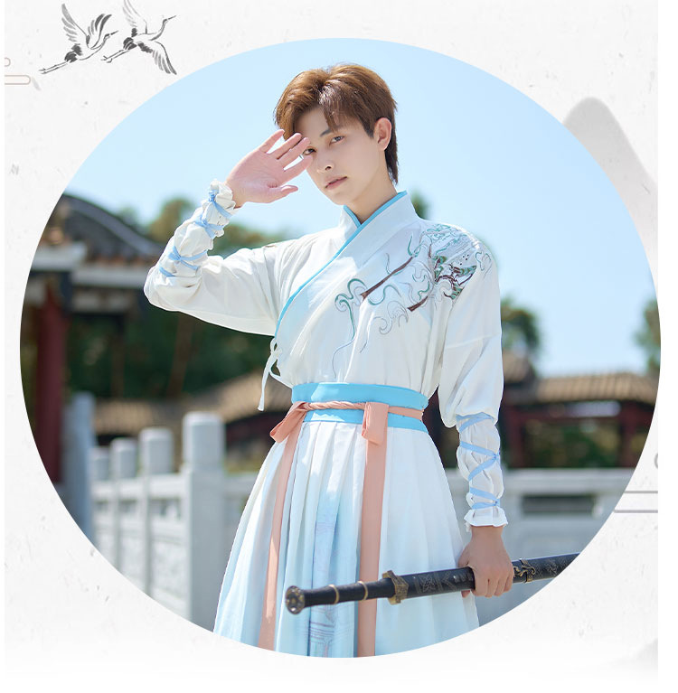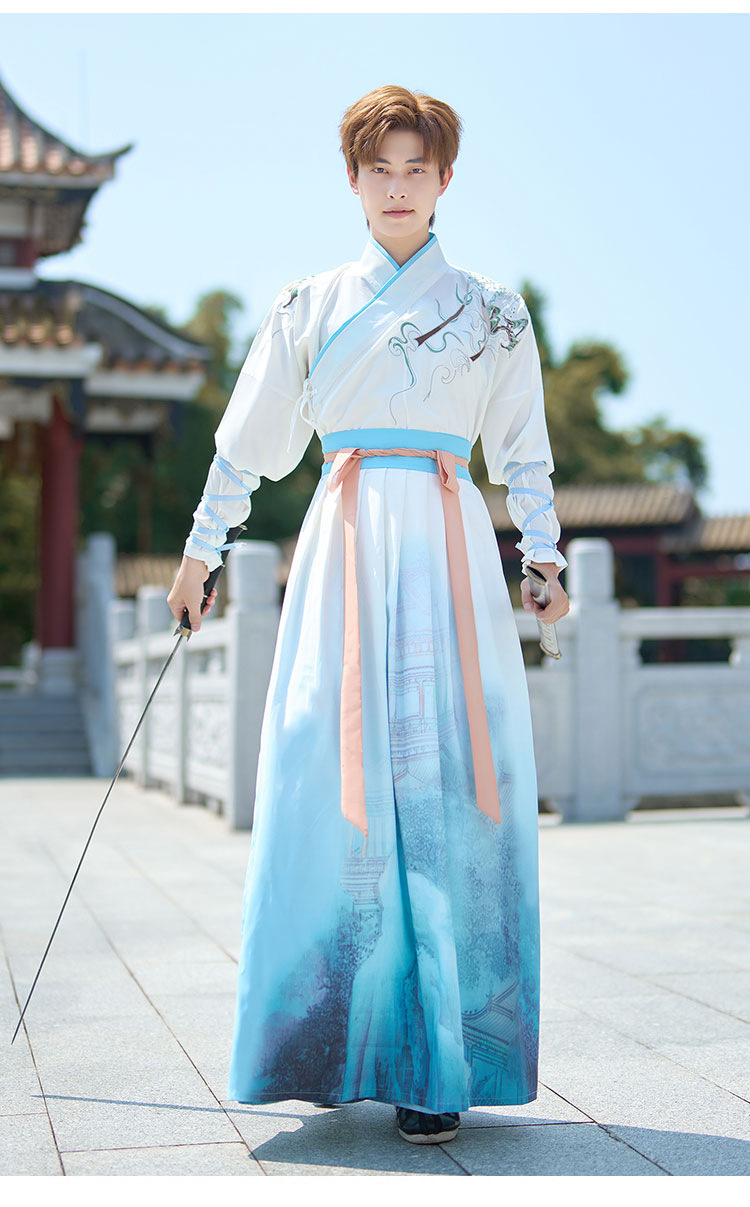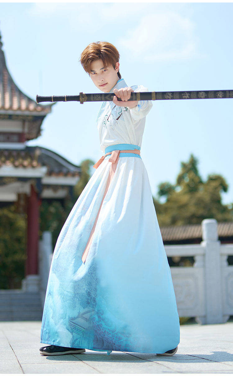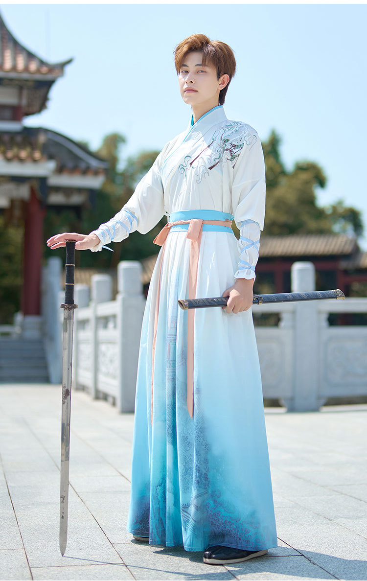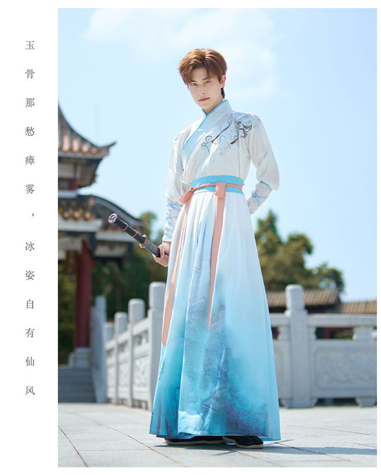 中国风古风浅蓝男装绣花长袖交领汉服二件套男士古装武侠风套装男