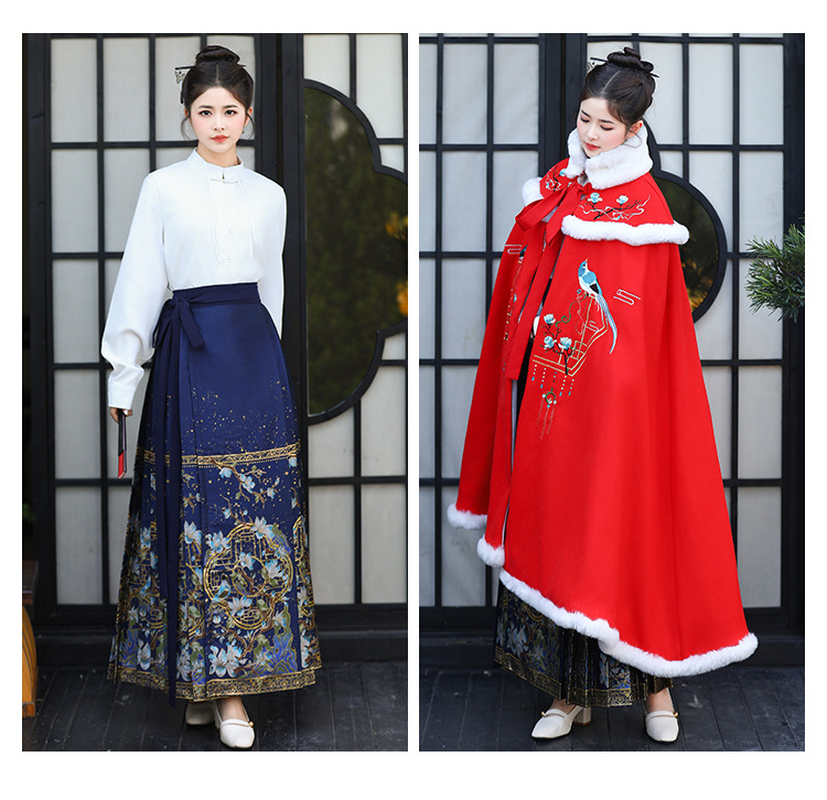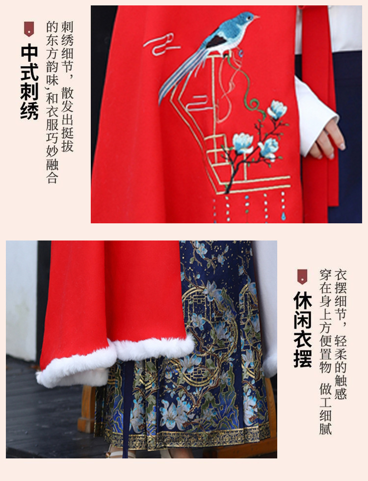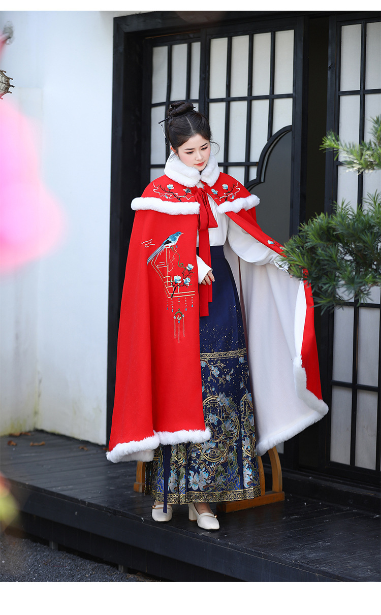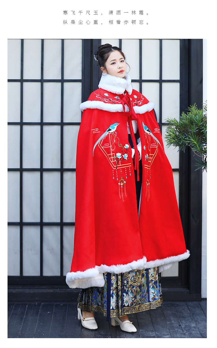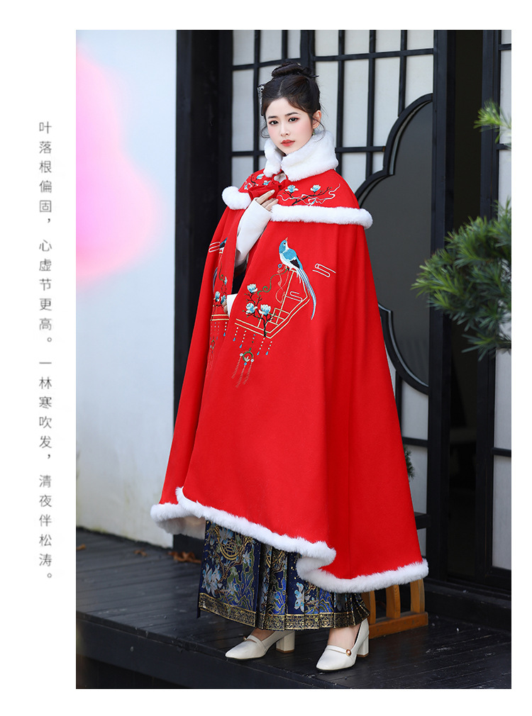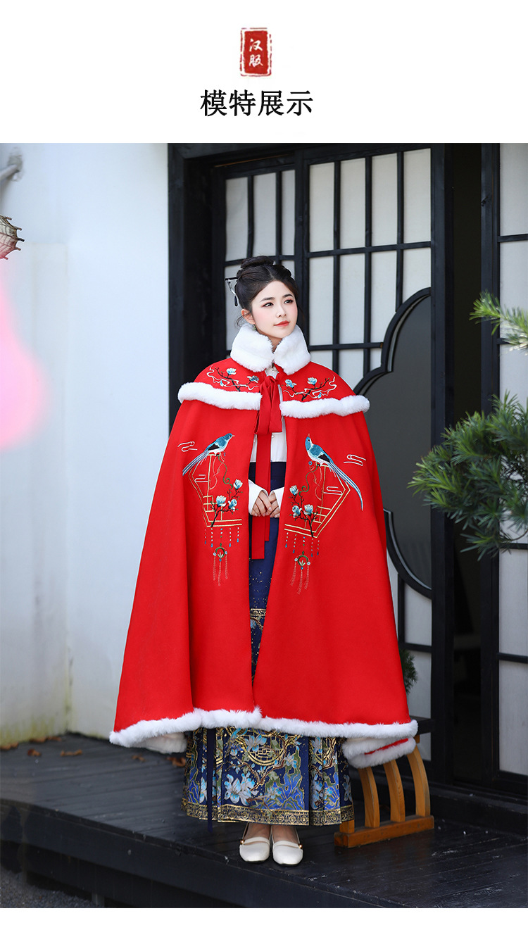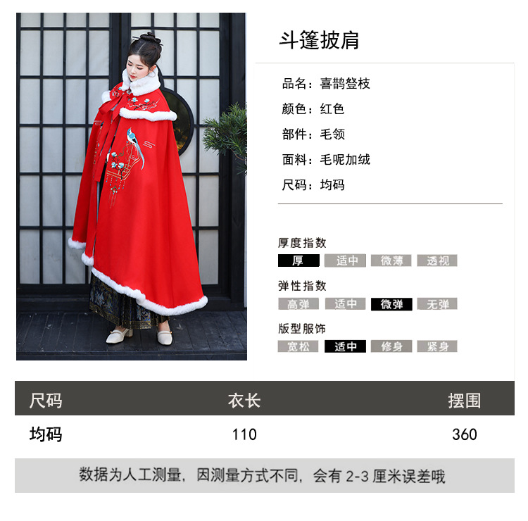 中国风女装长袖汉服红色喜鹊绣花古风斗篷中长款加厚加绒披风外套