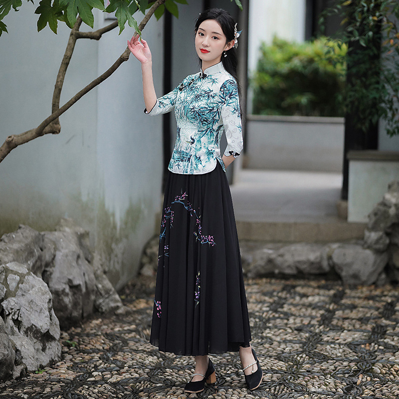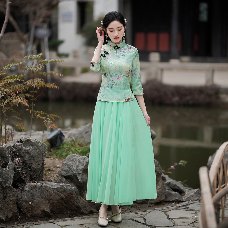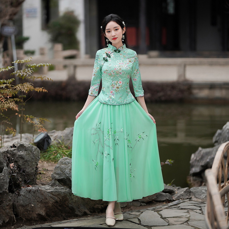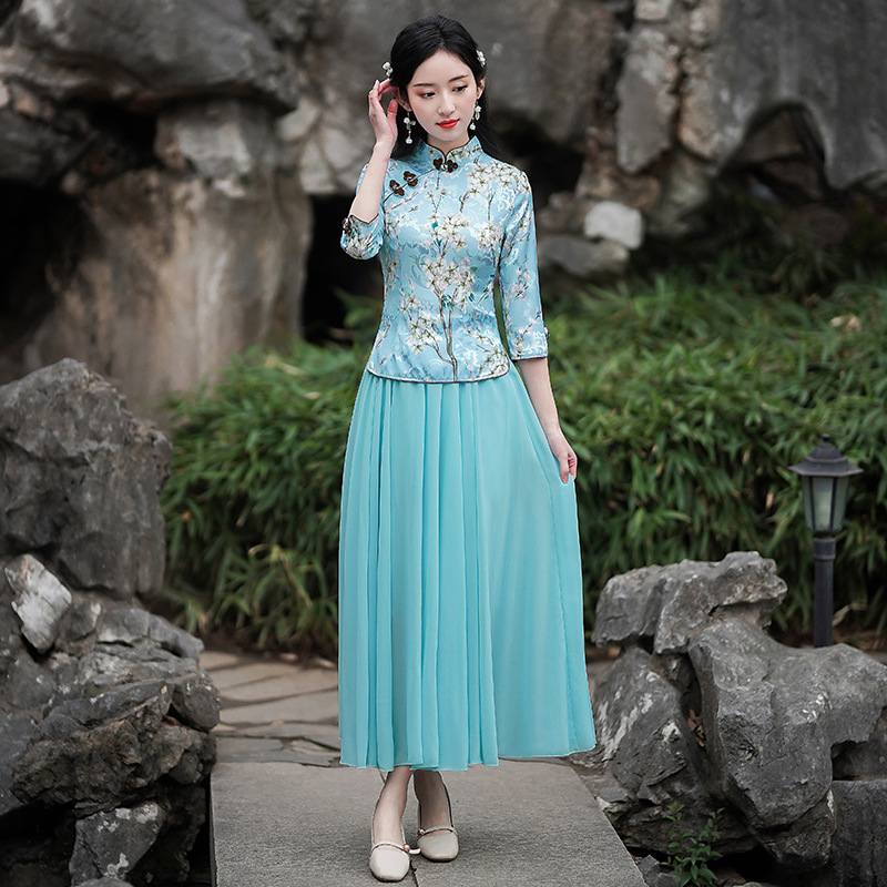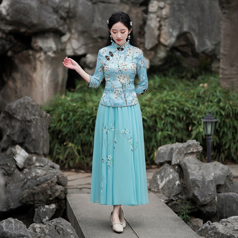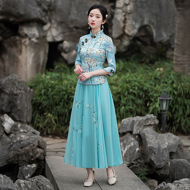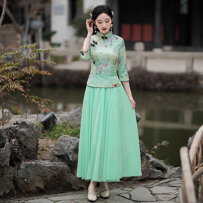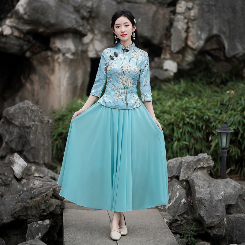 中国风大码女装复古优雅日常中式唐装立领上衣民国风旗袍裙套装女