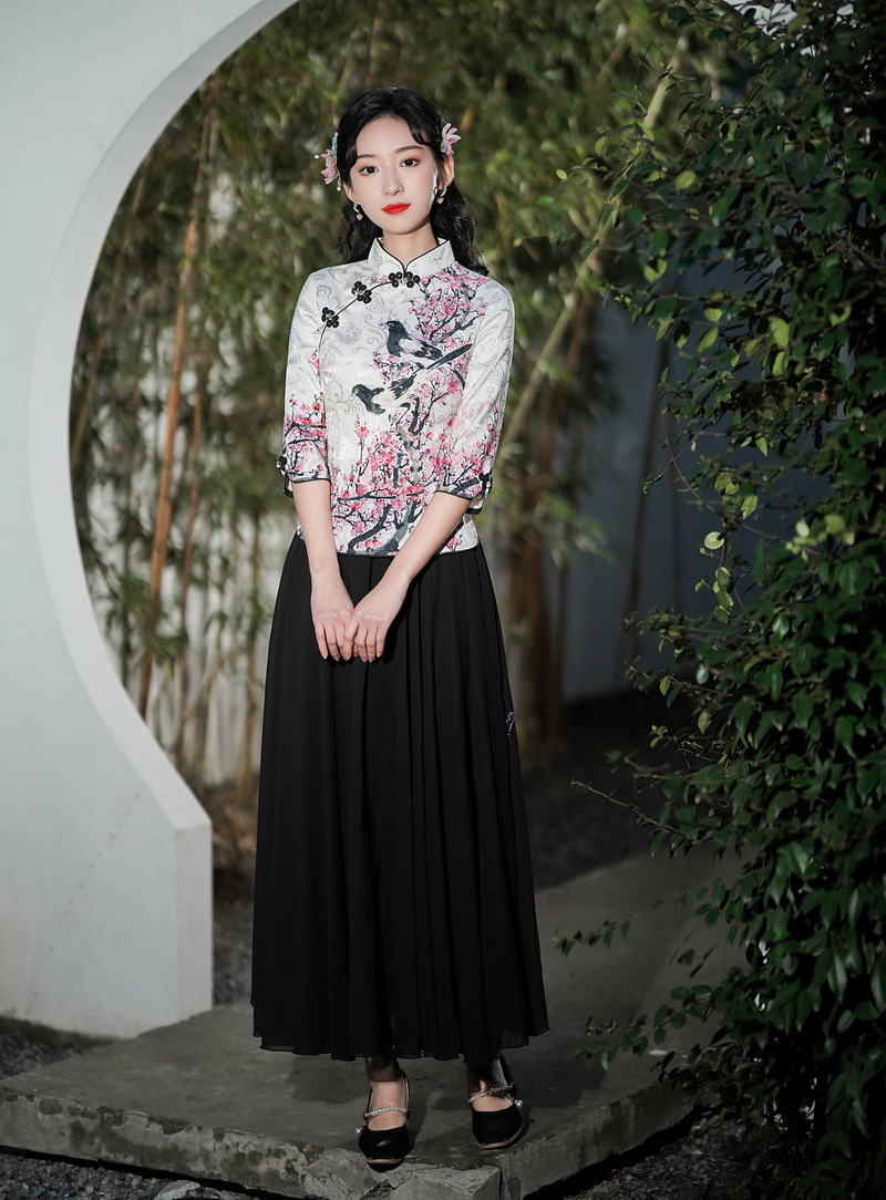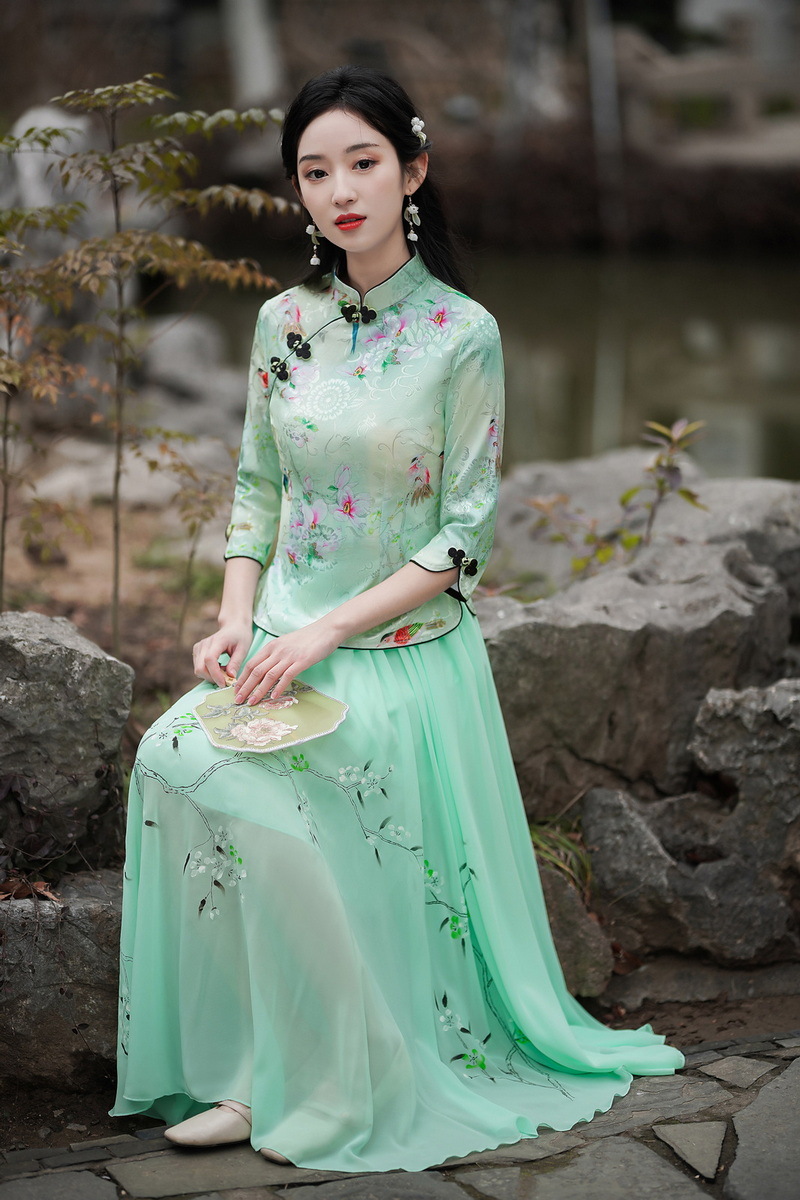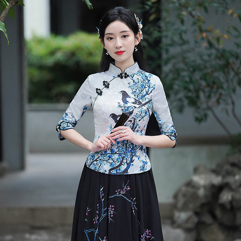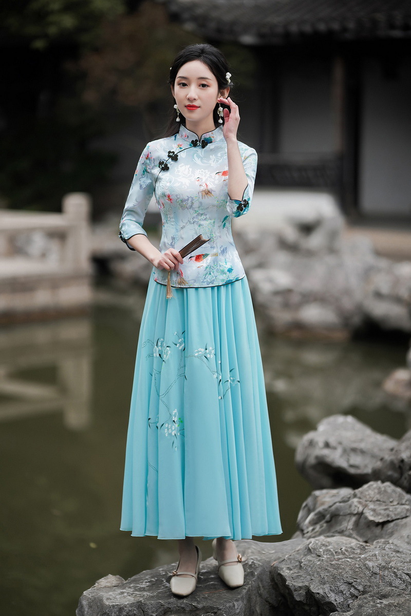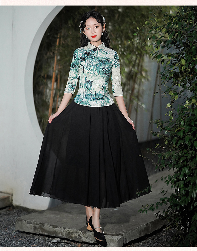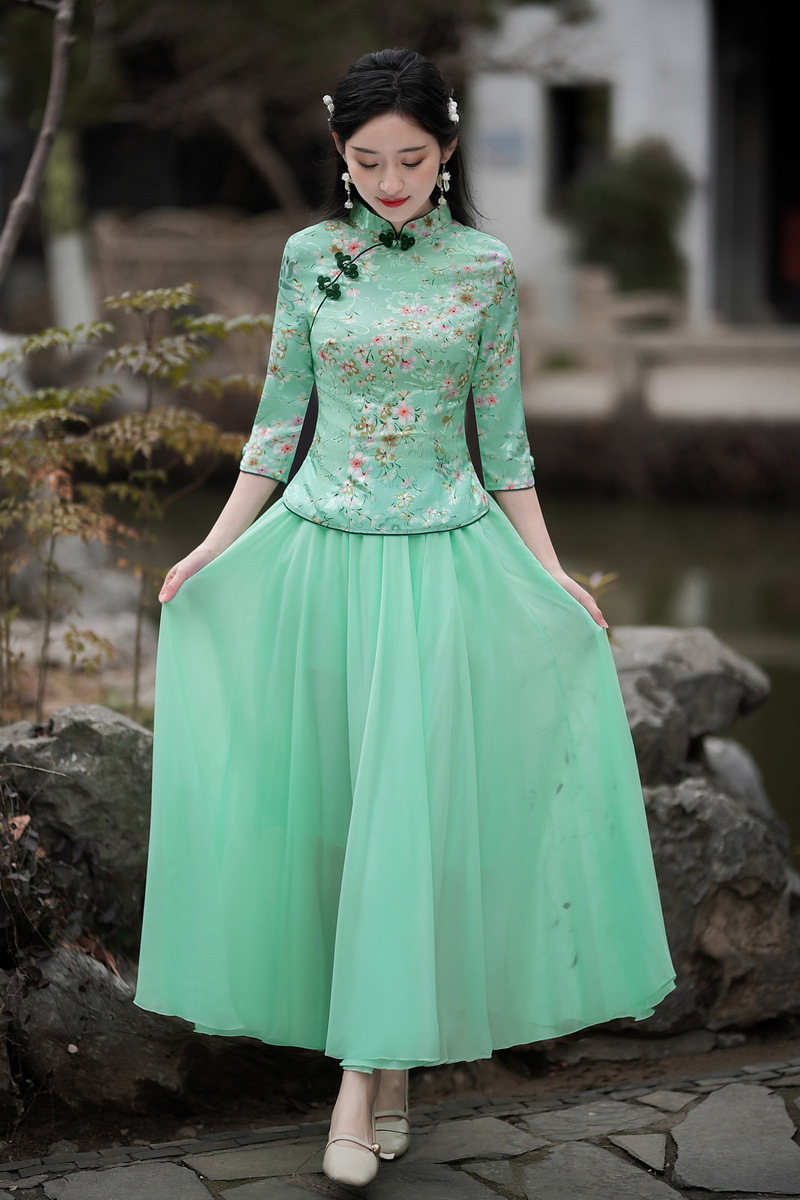 中国风大码女装复古优雅日常中式唐装立领上衣民国风旗袍裙套装女