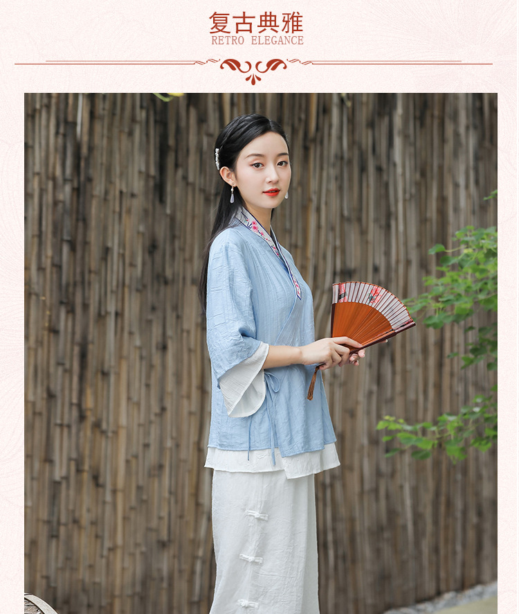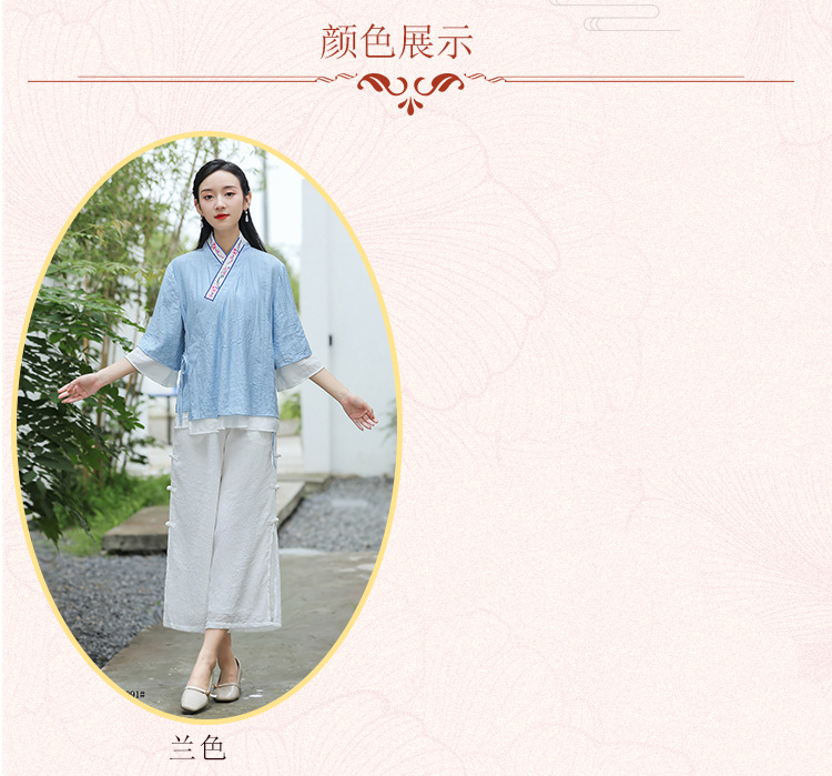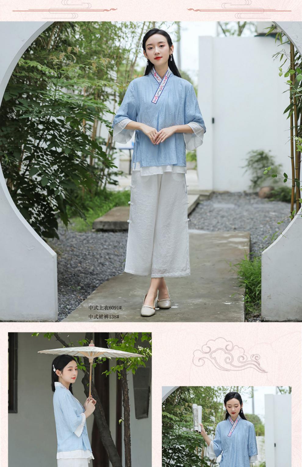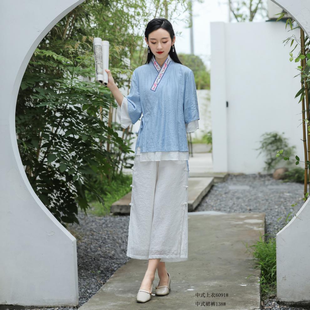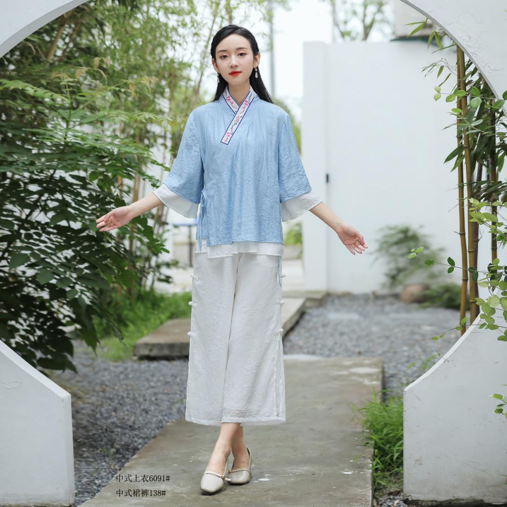民族风日常棉麻休闲绣花交领上衣宽松舒适典雅阔脚裙裤中国风套装
