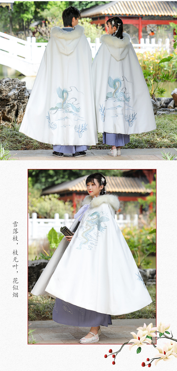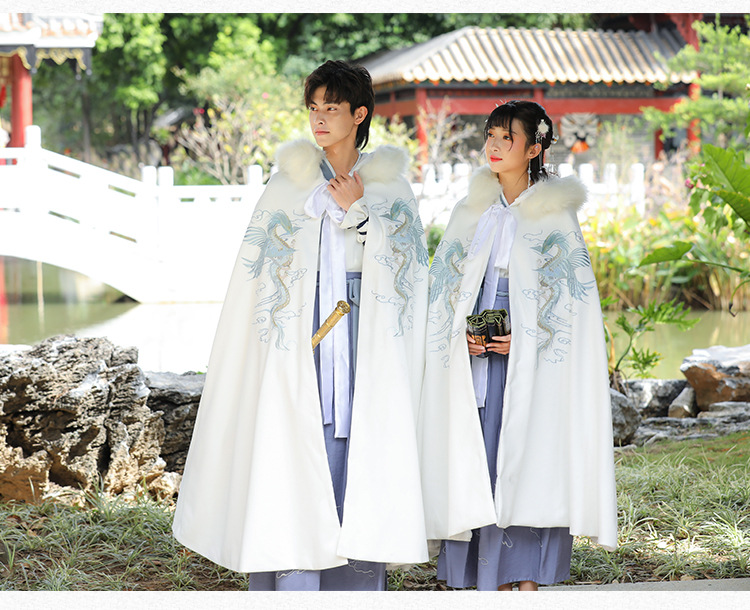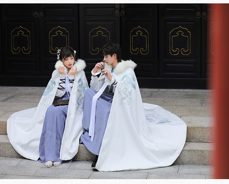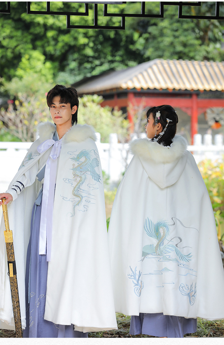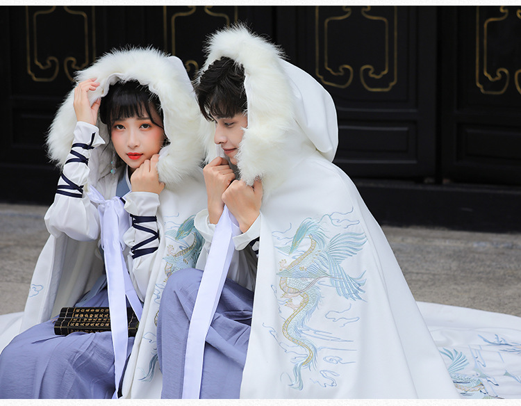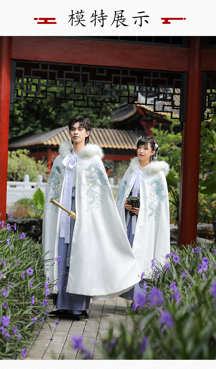 白色龙纹重工刺绣花斗篷大毛领汉服保暖加绒加厚连帽披风情侣CP装