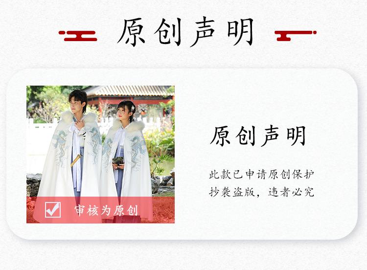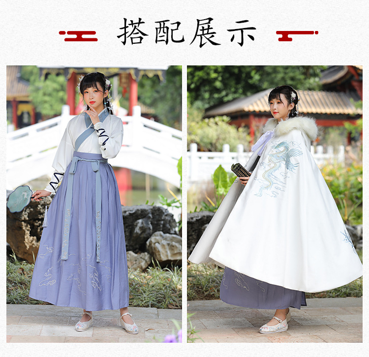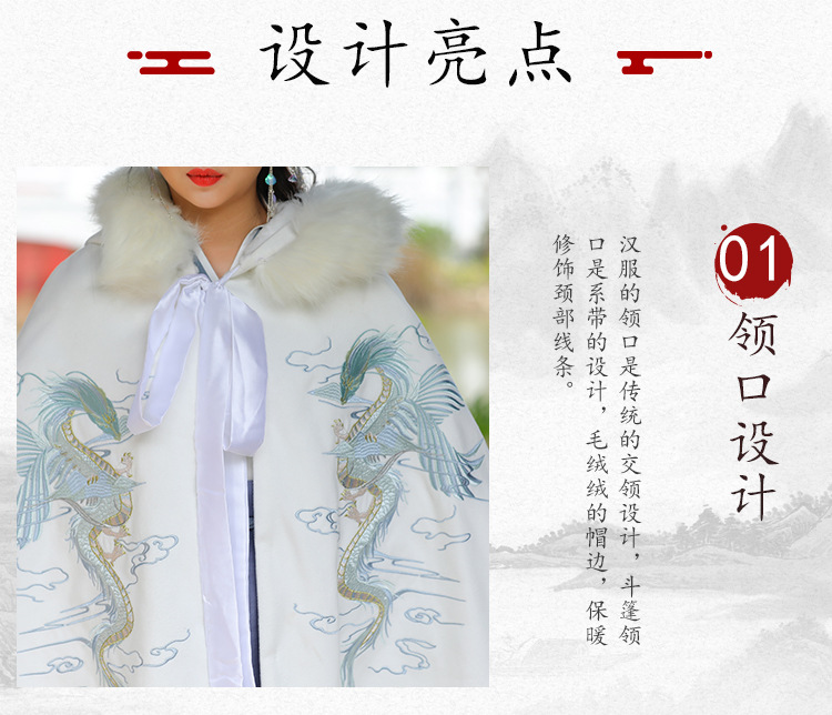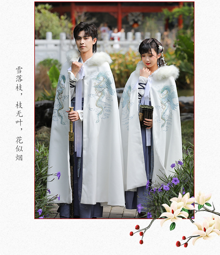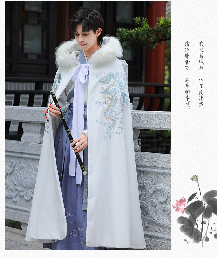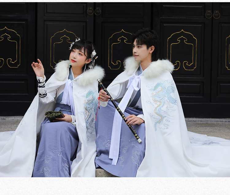 白色龙纹重工刺绣花斗篷大毛领汉服保暖加绒加厚连帽披风情侣CP装