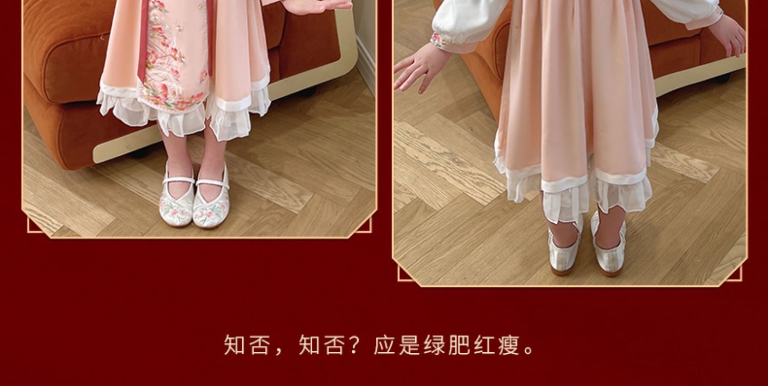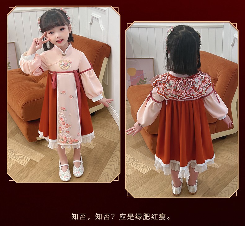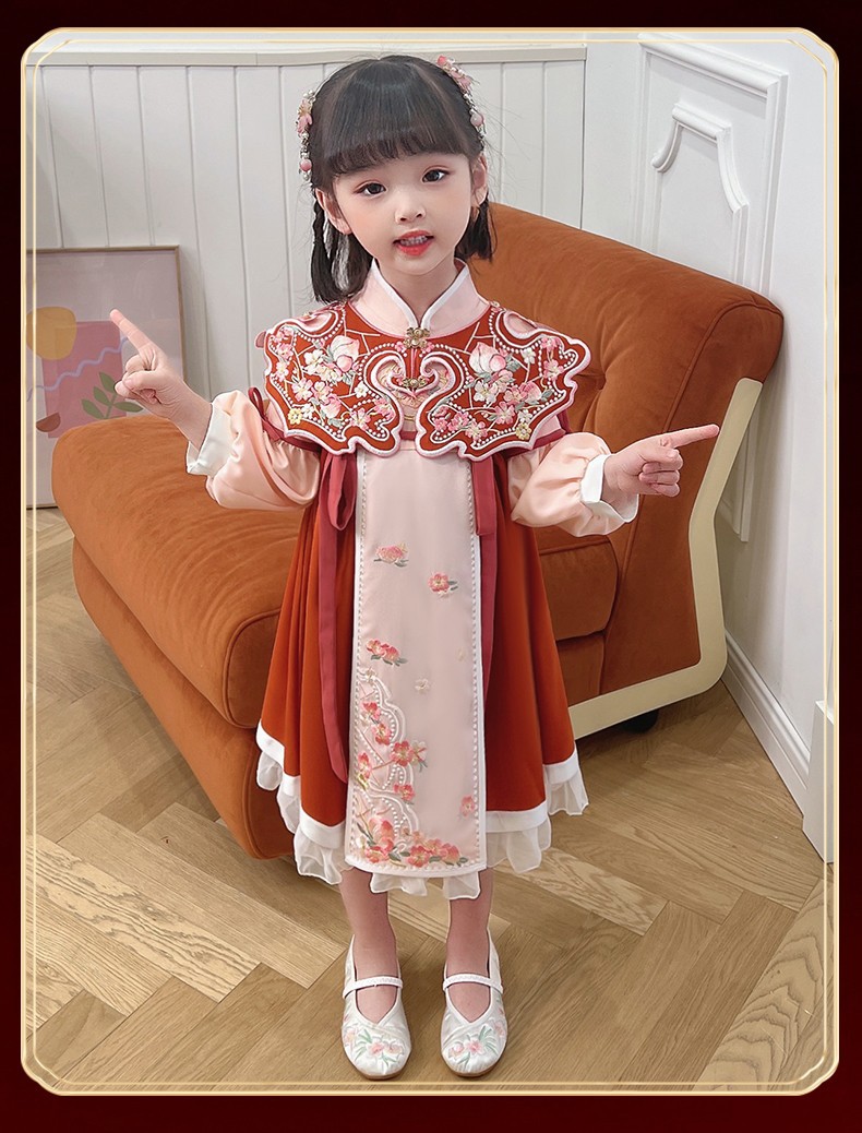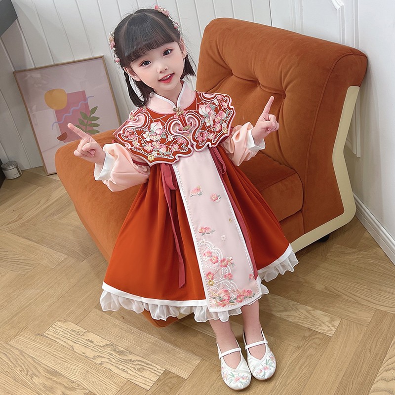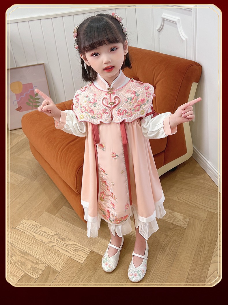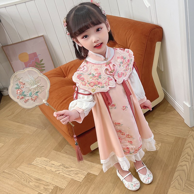 女童汉服连衣裙春秋新款冬加绒云肩立领斜门襟荷叶泡泡袖洋气裙子