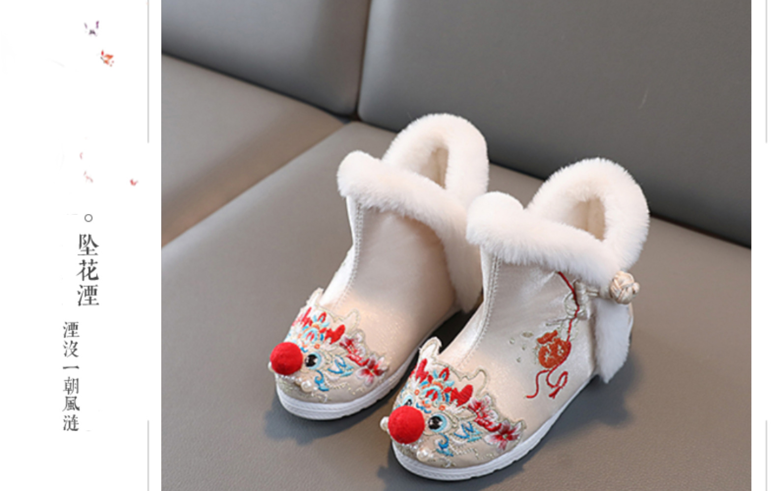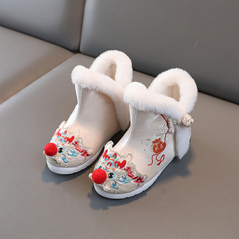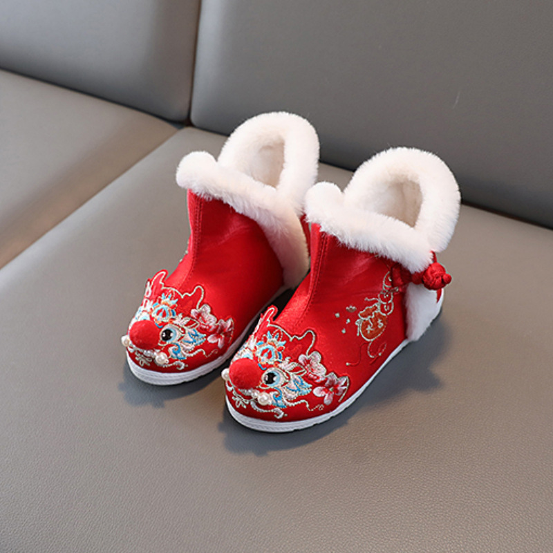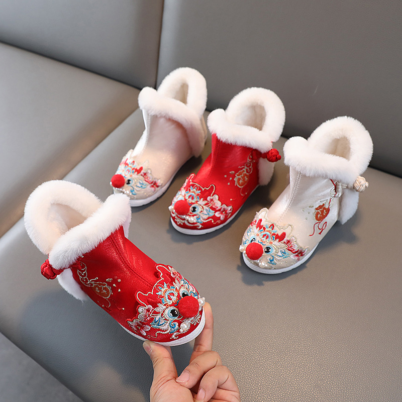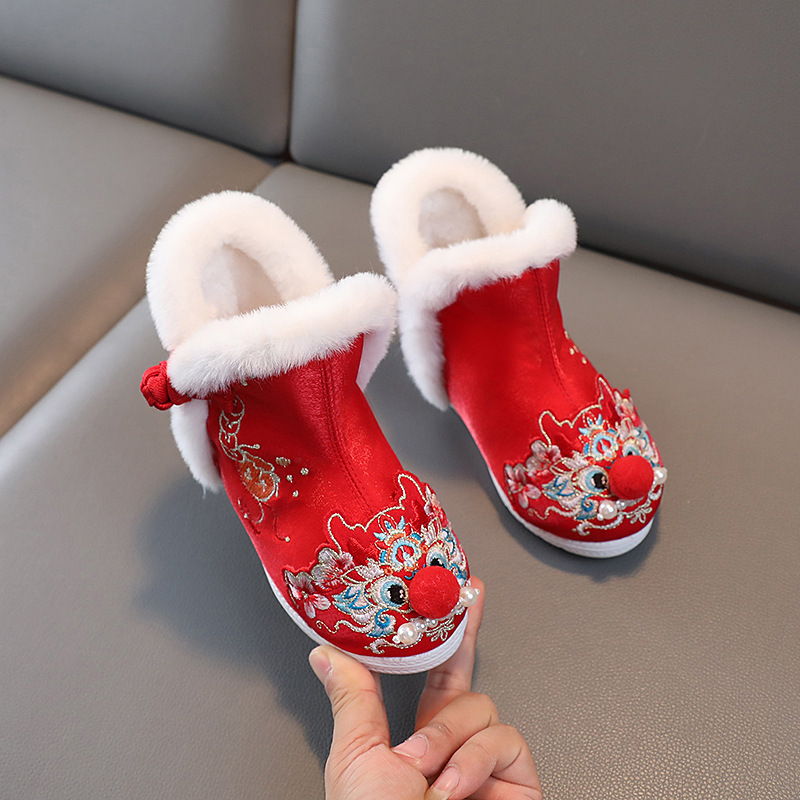 儿童汉服鞋女童冬季古装棉鞋中国风绣花鞋民族风雪地靴加绒拜年鞋