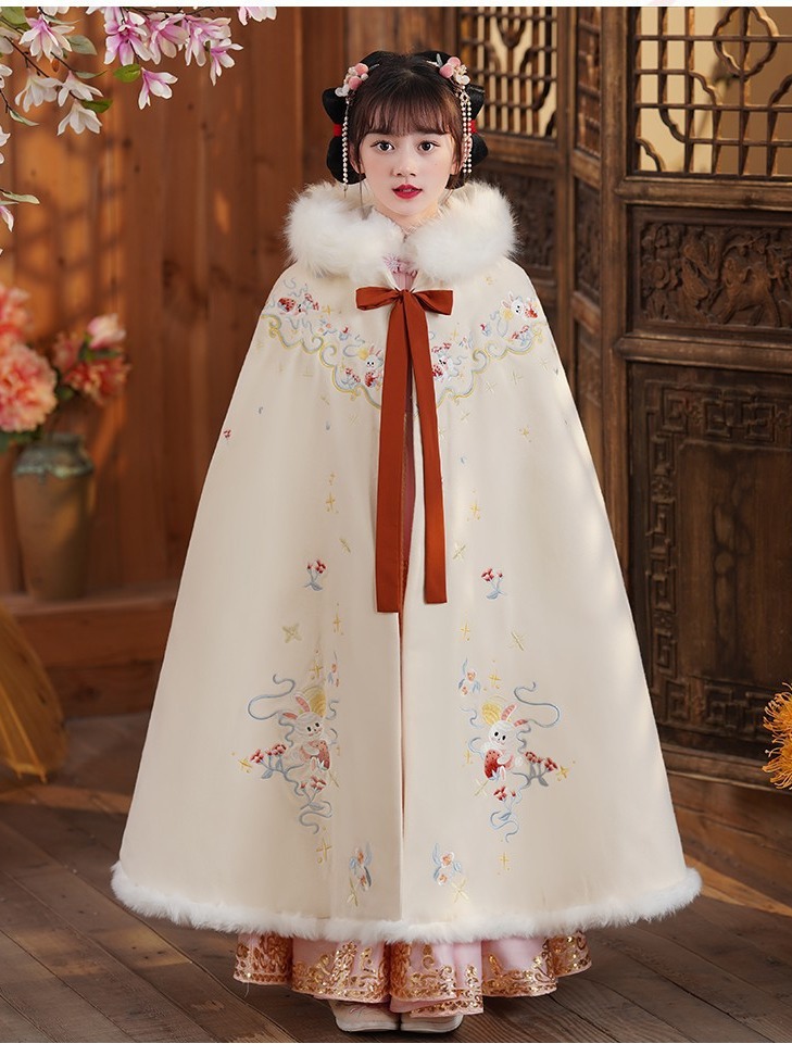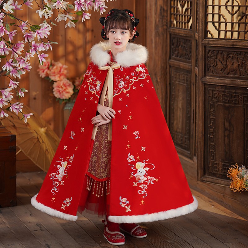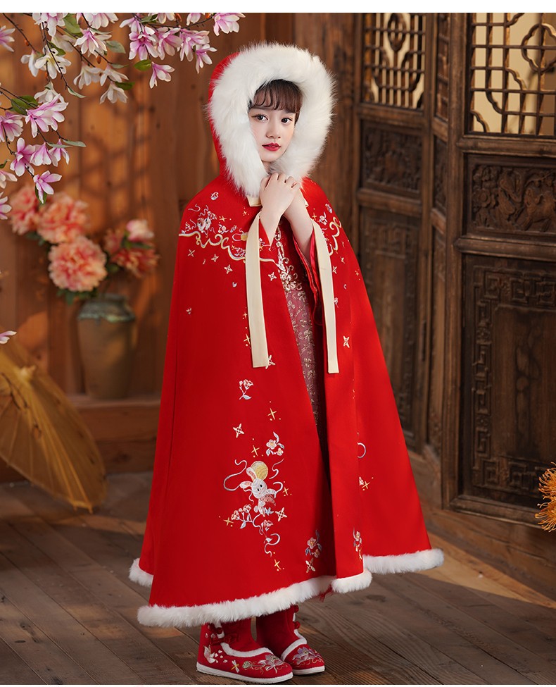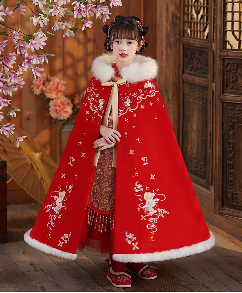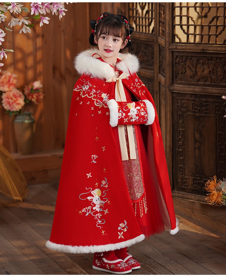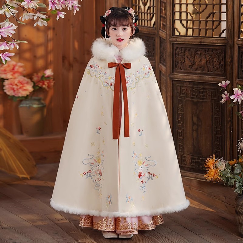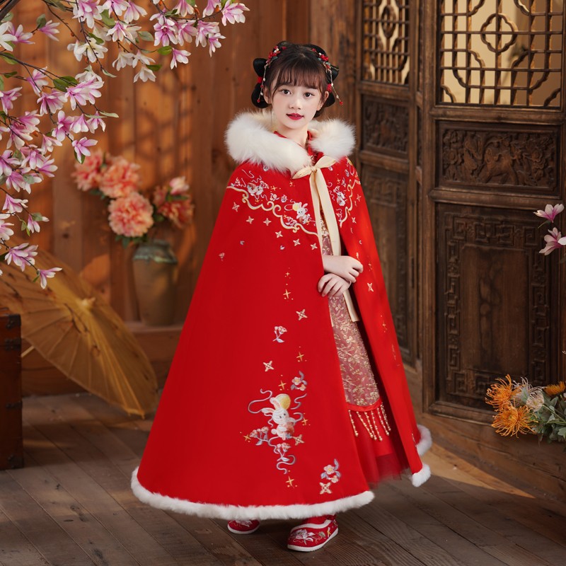 玉兔女童斗篷汉服披风加绒加厚长款女宝宝披肩小女孩中国风过年服
