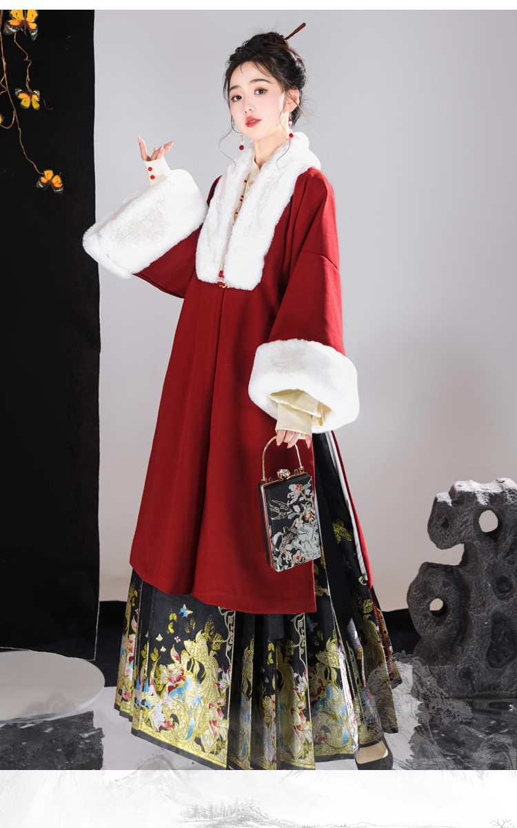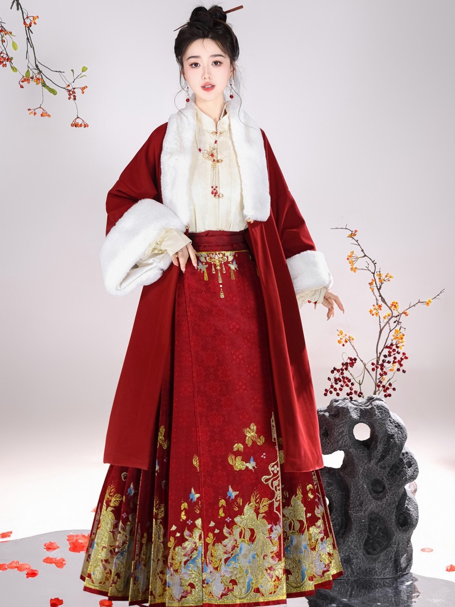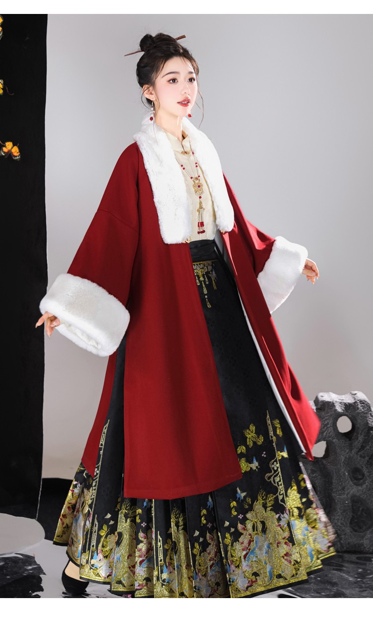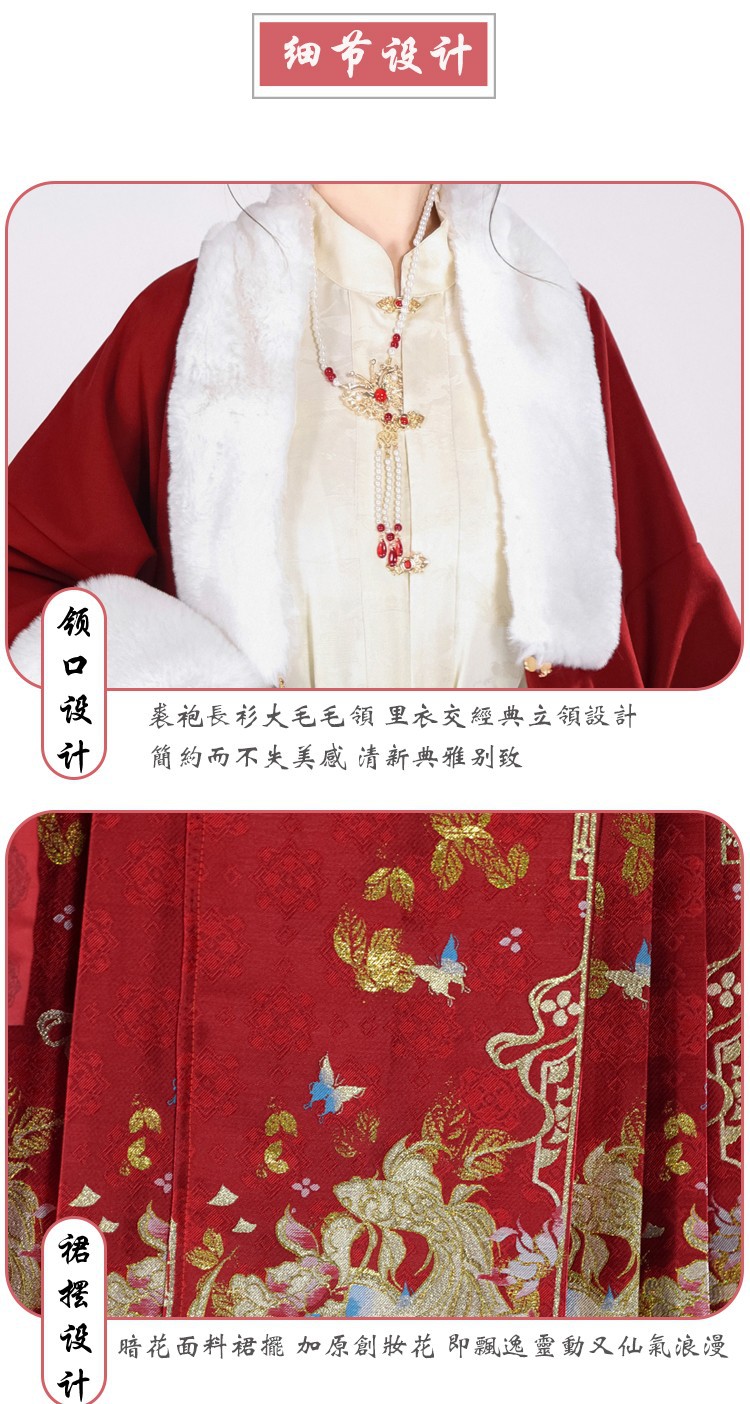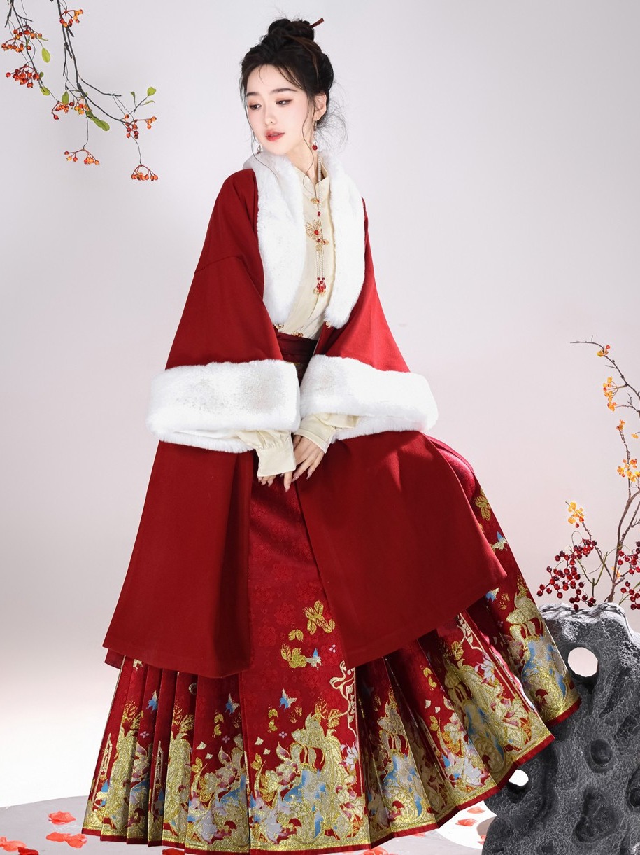 倾城音新款原创汉服女红色裘衣妆花马面裙套装汉元素拜年服婚服
