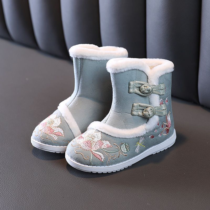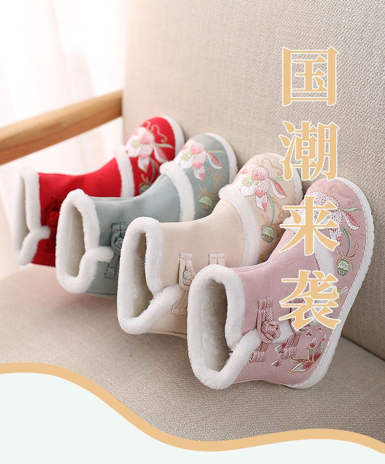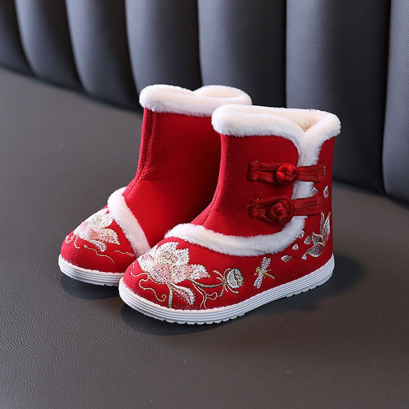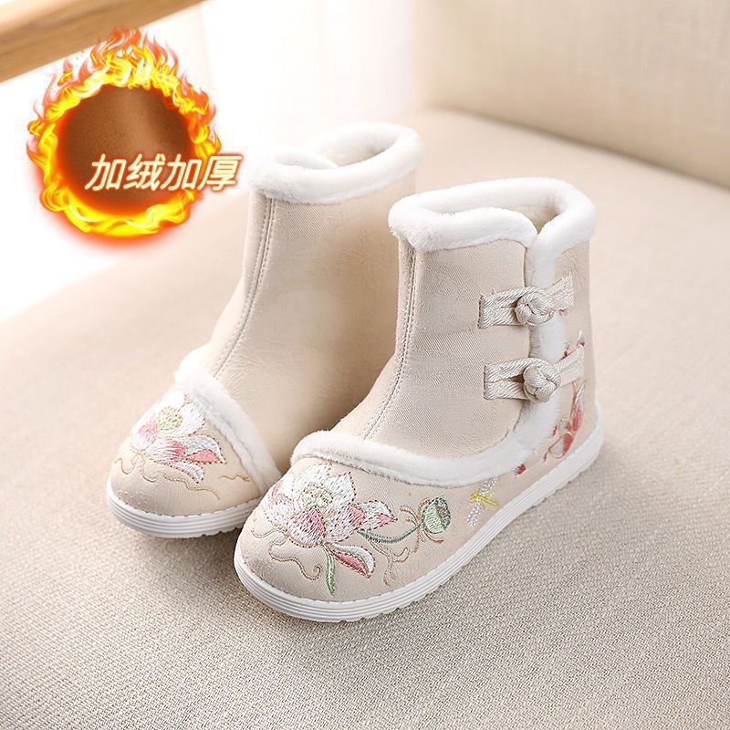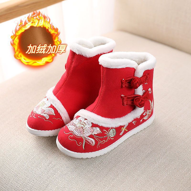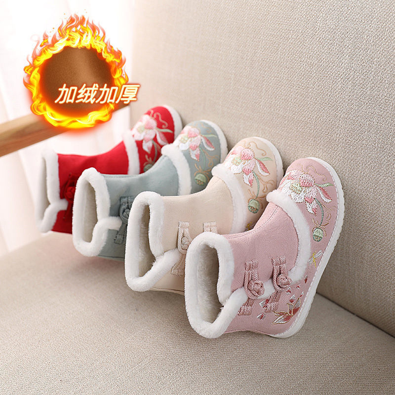 冬季汉服靴子女童加绒古风宝宝拜年鞋古装公主唐装鞋儿童绣花棉鞋
