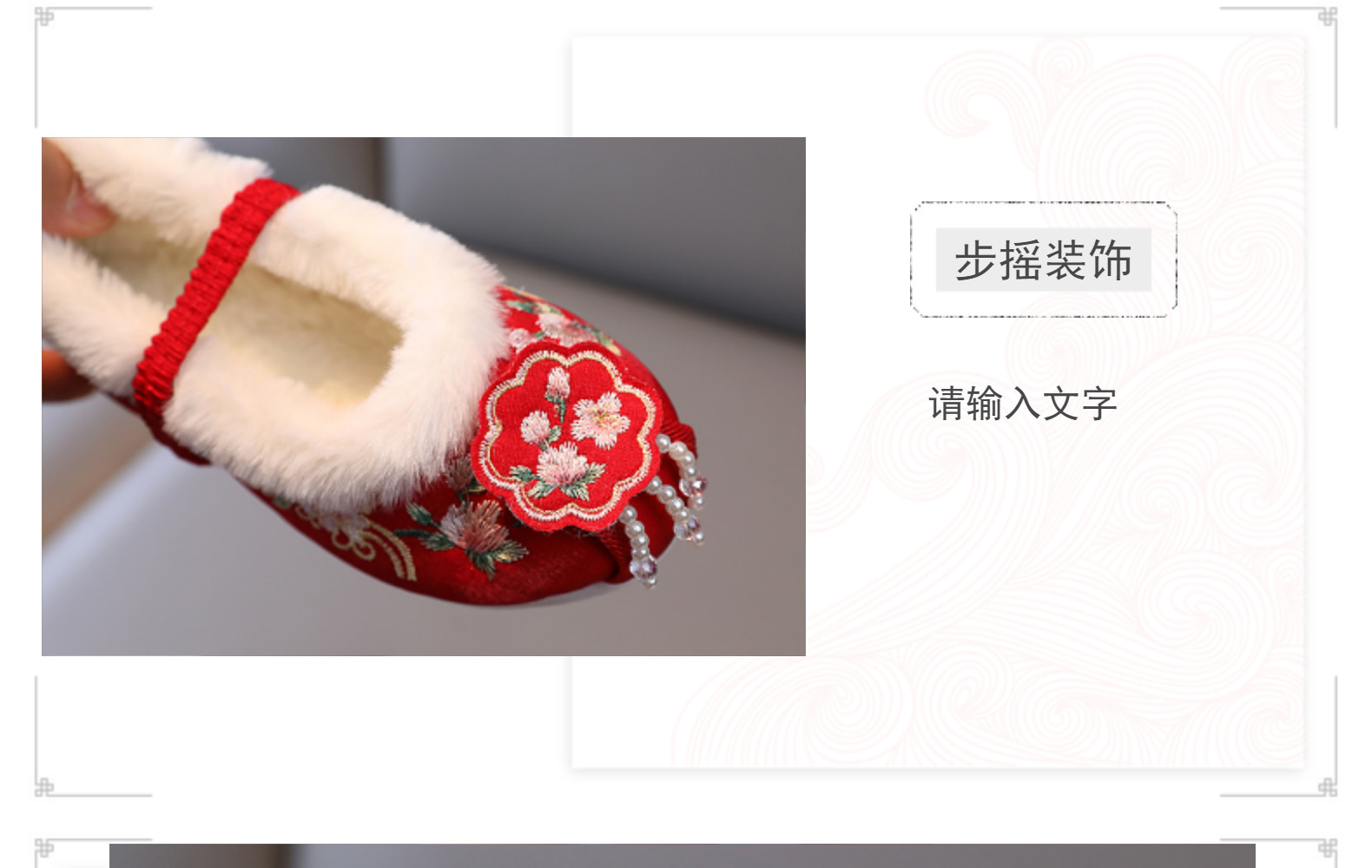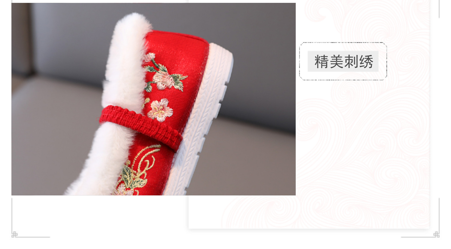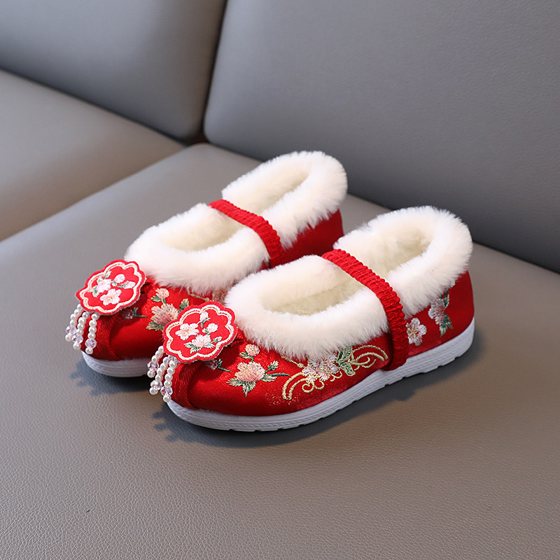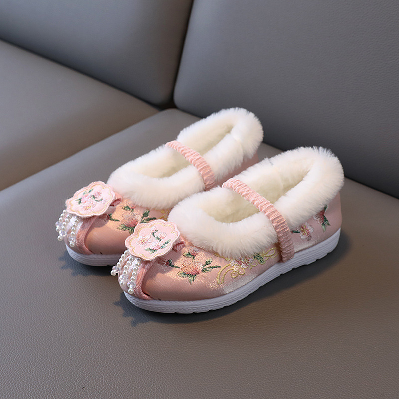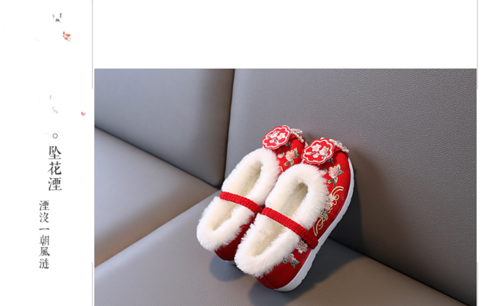 古风汉服鞋子女童冬款中国风绣花鞋搭配古装公主鞋加绒厚表演棉鞋
