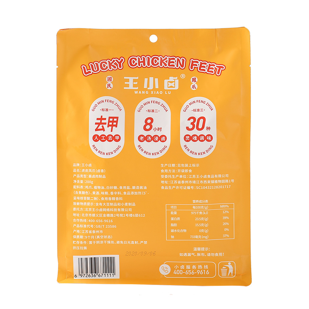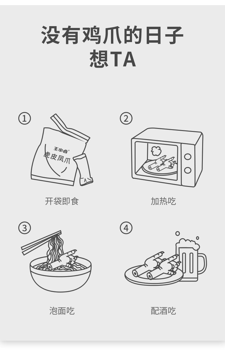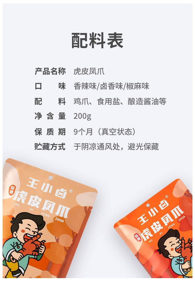 | stewed tiger skin chicken claw (stewed flavor 105g)(王小卤虎皮凤爪 (卤香味105克)) | USD $1.94 | 6859 bag available |