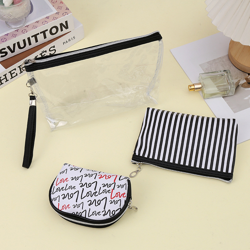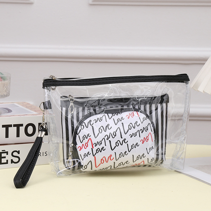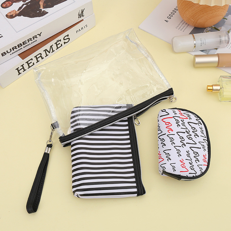 日韩喷绘条纹化妆包三件套透明双层pvc女士化妆袋便携防水收纳袋
